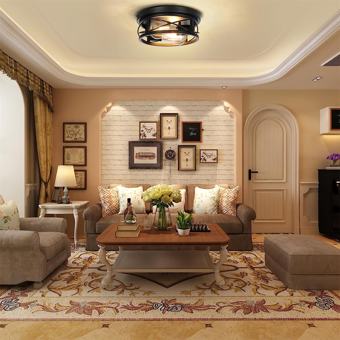 Industrial Retro Ceiling Light Fixtures Design This UL Certified black flush mount ceiling light, featured with the metal round frame, it combines modern and vintage house style which is retro, fashionable and traditional. High-quality Material The industrial ceiling light is made of metal materials, durable, the surface of black finishing layer is not only beautiful, but also effectively prevent rust, scratch. Blub Required This hallway light fixture needs two E26 bulbs. The UL certification lamp holder is suitable for the American general E26 lamp holder standard. Note: NOT included the bulbs. Wide Application The closed to ceiling light fixture can be used in kitchen, bedroom, dining room, living room , hallway, porch, entrance, stair, study, office, cafeteria, farmhouse, club, bar etc. Easy Installation: Includes all hardware and step-by-step guide.