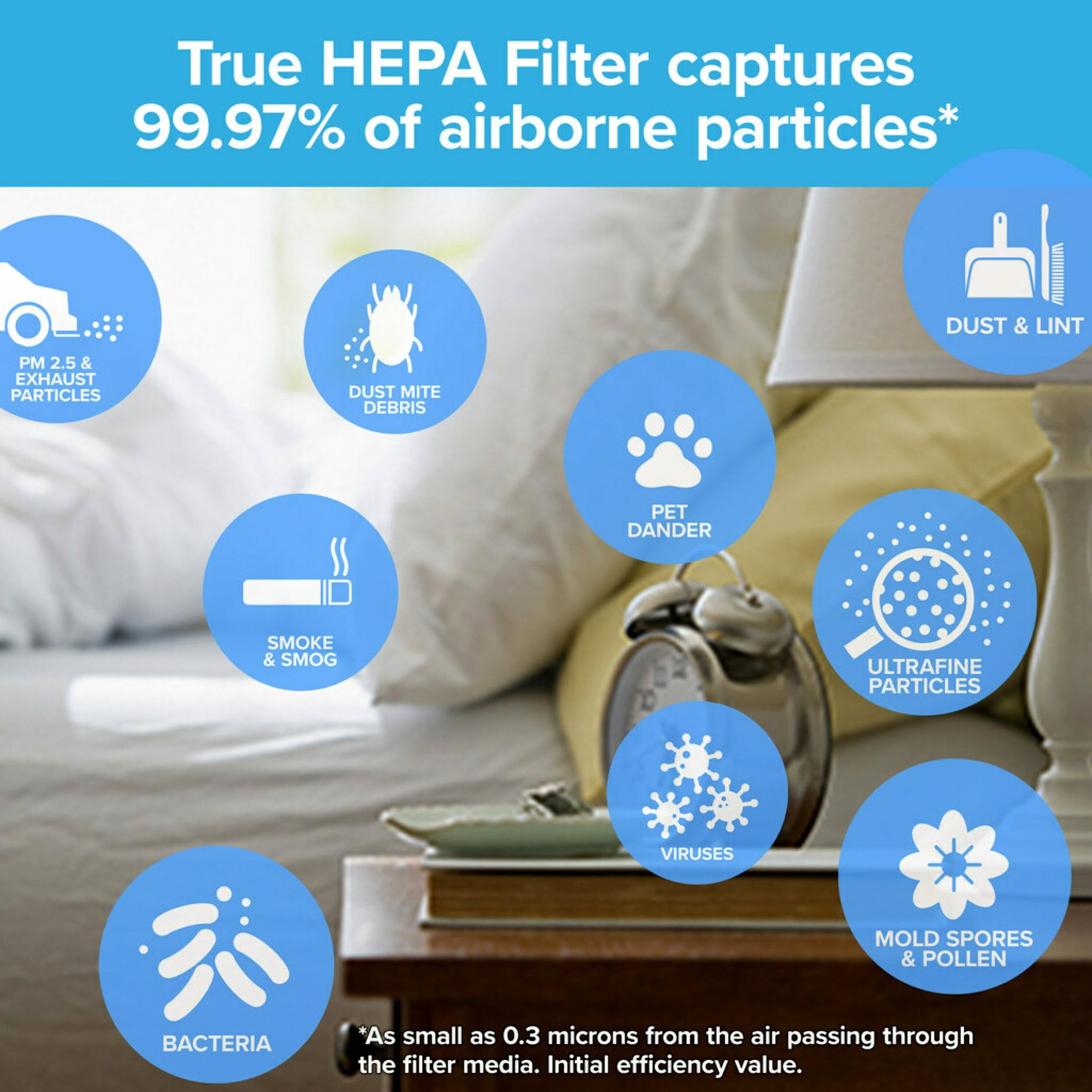 Not sure which Filtrete device or filter to buy? Click here to view our help guide. Our top-of-the-line filter captures 99.97% of airborne particles from the air passing through the filter media*, including dust, allergens, bacteria, viruses, smoke and smog. Designed with electrostatic air filtration, the Filtrete Allergen, Bacteria and Virus True HEPA Filter traps particles 1000x smaller than the human eye can see. Say hello to cleaner, fresher indoor air. (*As small as 0.3 microns from the air passing through the filter media. Initial efficiency value.)