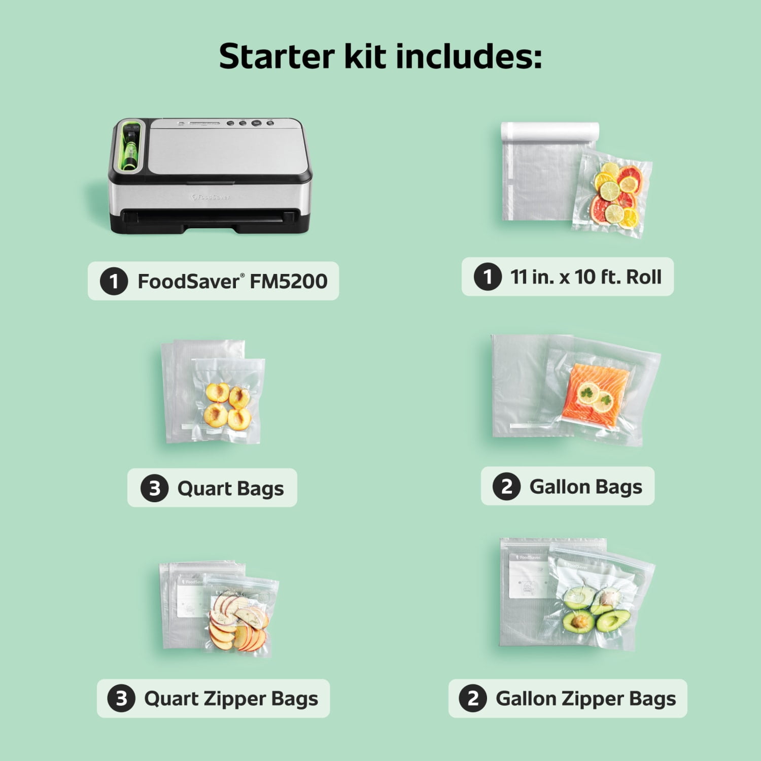 Keep food fresh in the freezer up to 5x longer and in the fridge or pantry up to 2x longer, compared to ordinary storage methods Express Bag Maker reduces bag making steps by 50%, compared to previous models, with a unique second heat-sealing bar to automatically prep the next bag. Easy View Vacuum Window lets you easily control where you seal while the Open Roll Storage design lets you see when you need to replace the roll To get consistent results during sous vide cooking, use FoodSaver bags and rolls, which are specifically designed to withstand boiling temperatures, are safe to use, and BPA-free Starter kit includes (1) 11? x 10? heat seal roll, (3) 1-quart pre-cut heat seal bags, (2) 1-gallon pre-cut heat seal bags, (3) 1-quart vacuum zipper bags, (2) 1-gallon vacuum zipper bags. Care and Cleaning: Spot or wipe clean