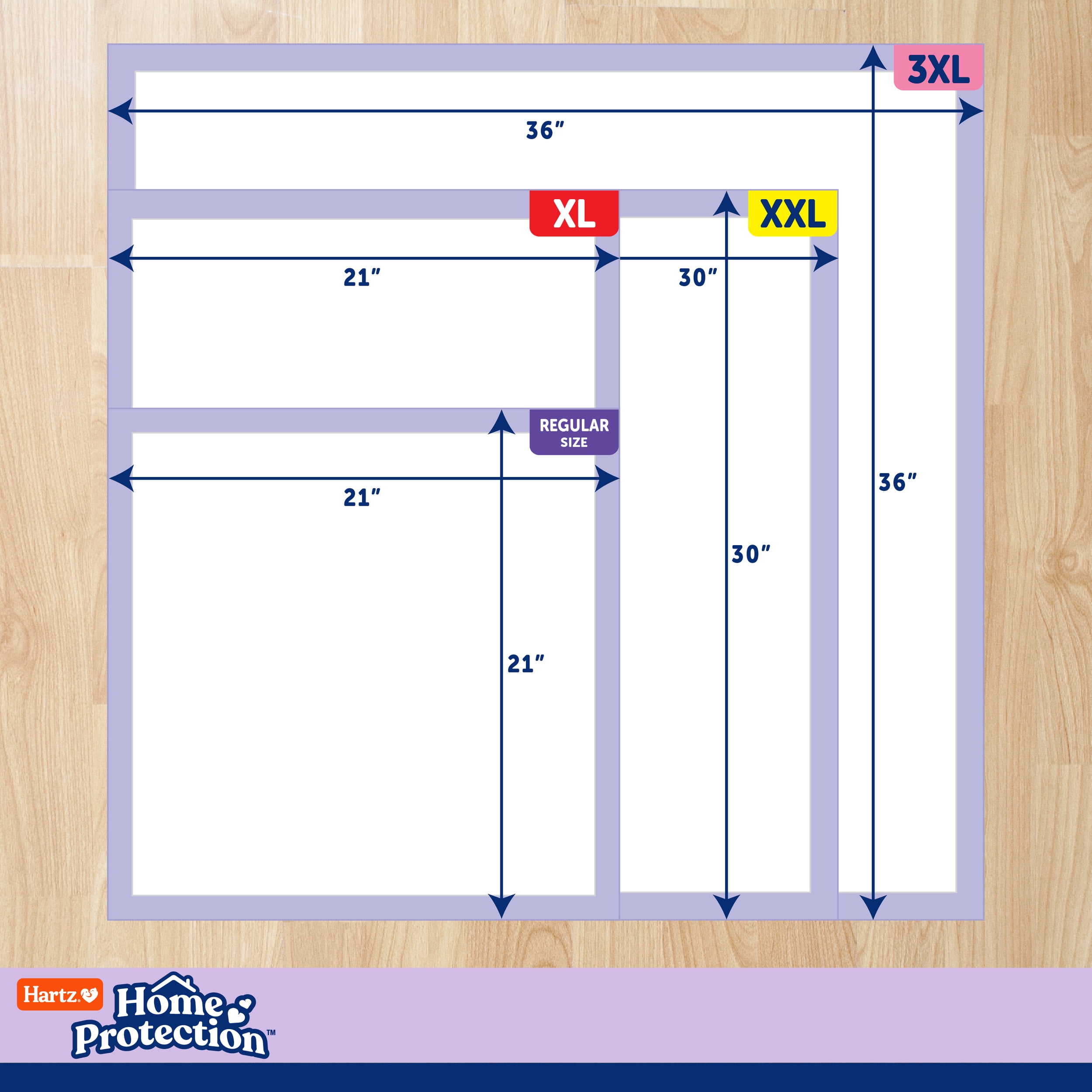 Coming home to pet messes is not how anyone likes to unwind after a long day, which is why Hartz set out to create the ultimate puppy pad. The Hartz Home Protection dog pads make clean up easier while protecting floors from unwanted accidents. These pads are great for dogs that have limited access to the outdoors while their owners are gone, senior dogs with limited movements, and puppies in training. Hartz absorption experts designed a pad with 6 layers of protection to prevent leaking or spreading. Each pad has Flash Dry Technology which turns liquid into gel! The water-proof plastic backing blocks leaks even at the corners. The lavender scent eliminates odor keeping your home smelling clean. Size 3 Extra Large.
