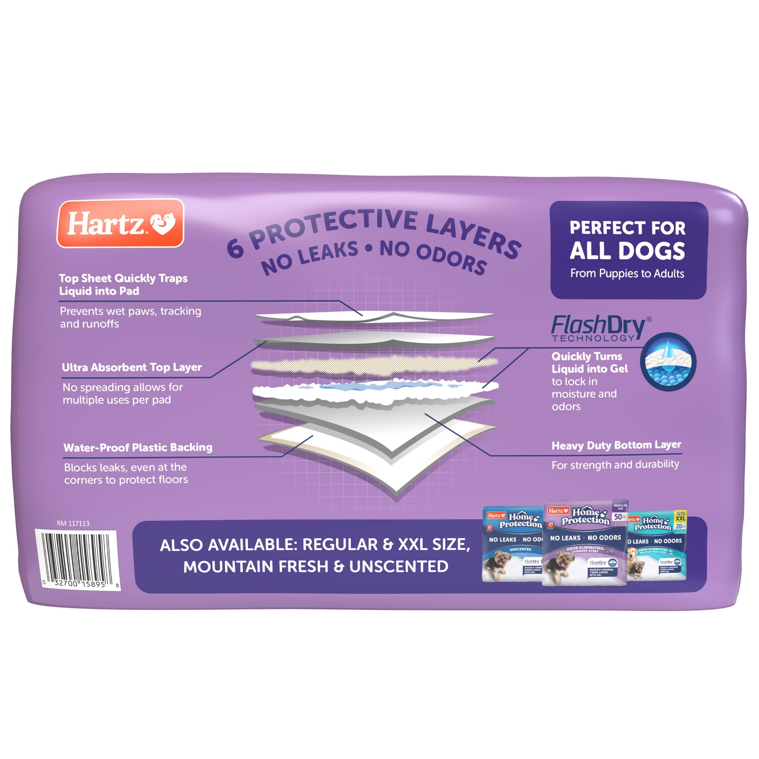 WON’T LEAK: Each pee pad has unique FlashDry Technology, which instantly turns liquid into GEL ADDITIONAL POTTY NEEDS: Hartz has a family of unscented, scented, and quilted dog pads and Disposable Dog Diapers for Female & Male Dogs & Male Diapers/Wraps for your dog supply needs SUPERIOR ABSORPTION: Our 6-layer construction puppy pad creates a smaller urine spot, allowing for multiple uses per pad KEEPS YOUR HOME CLEAN: Each pad features a leak-proof plastic backing to protect your floor ODOR ELIMINATING LAVENDER SCENT: Odor eliminating capabilities trap and neutralize odor