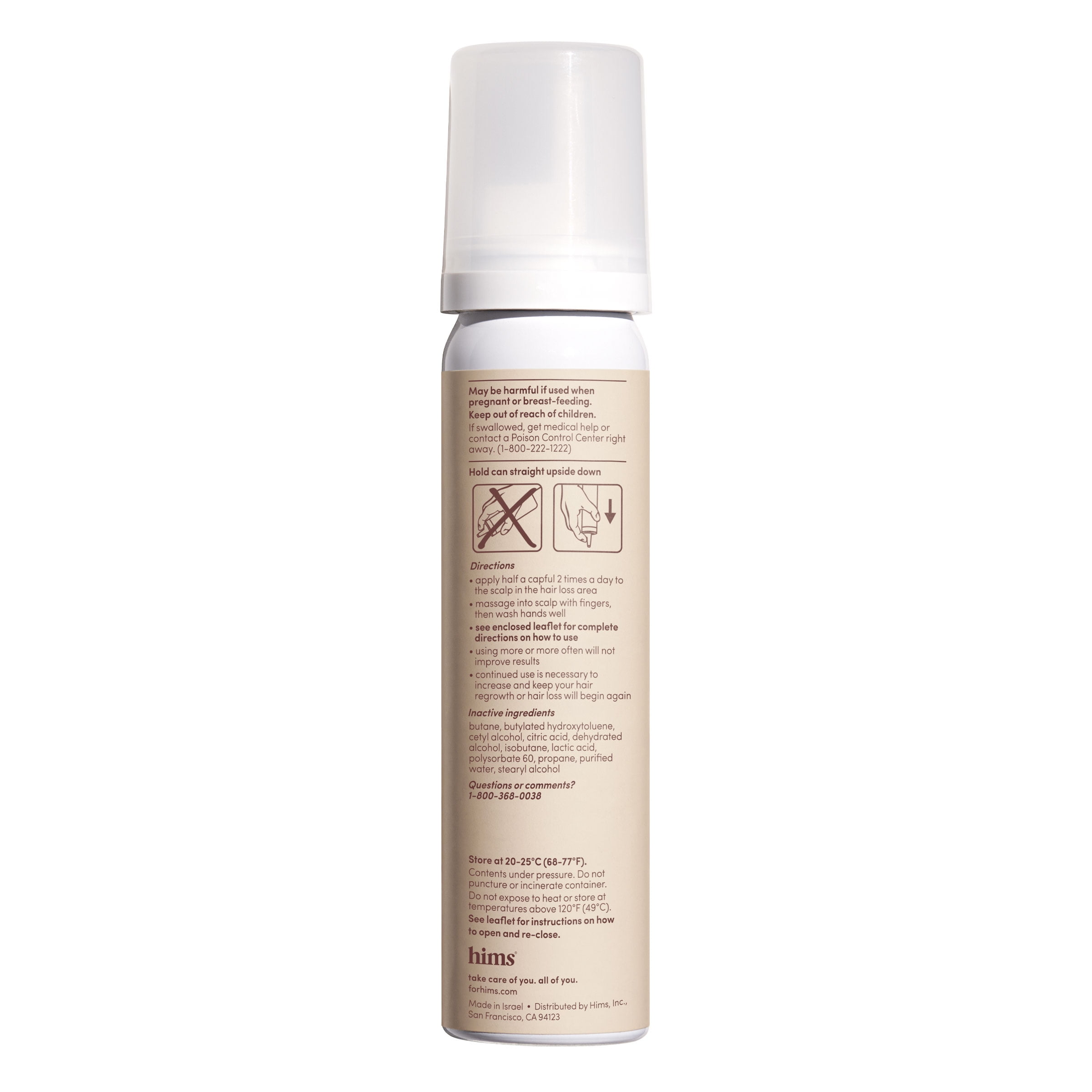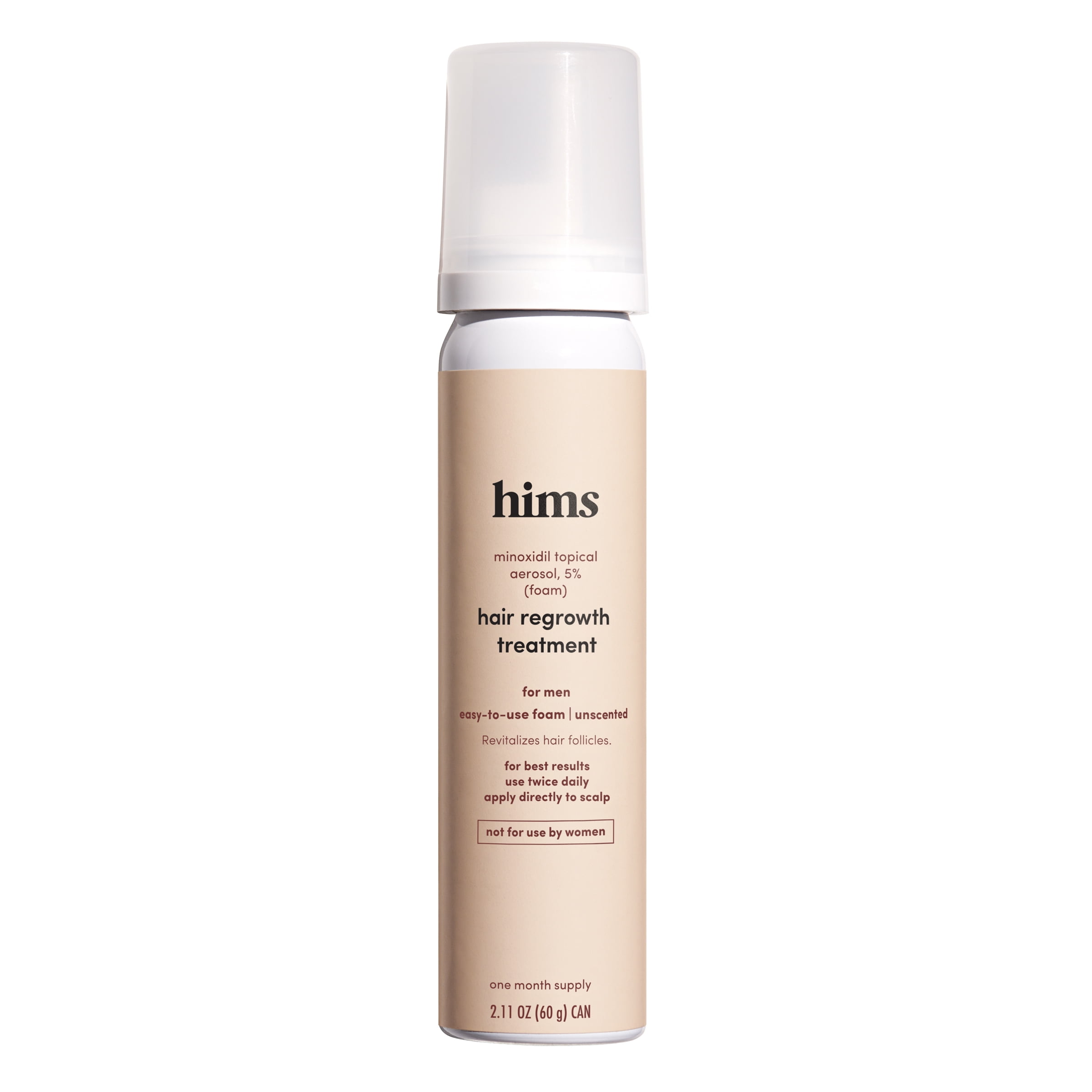 hims Minoxidil 5% Topical Foam, Hair Regrowth Treatment for Men, 2.11 fl oz Reactivates follicles to help regrow hair on top of the head Tackles male pattern baldness head-on FDA approved and clinically proven to regrow hair in 3-6 months Extra strength for men Unscented, easy-to-use foam 1 month supply