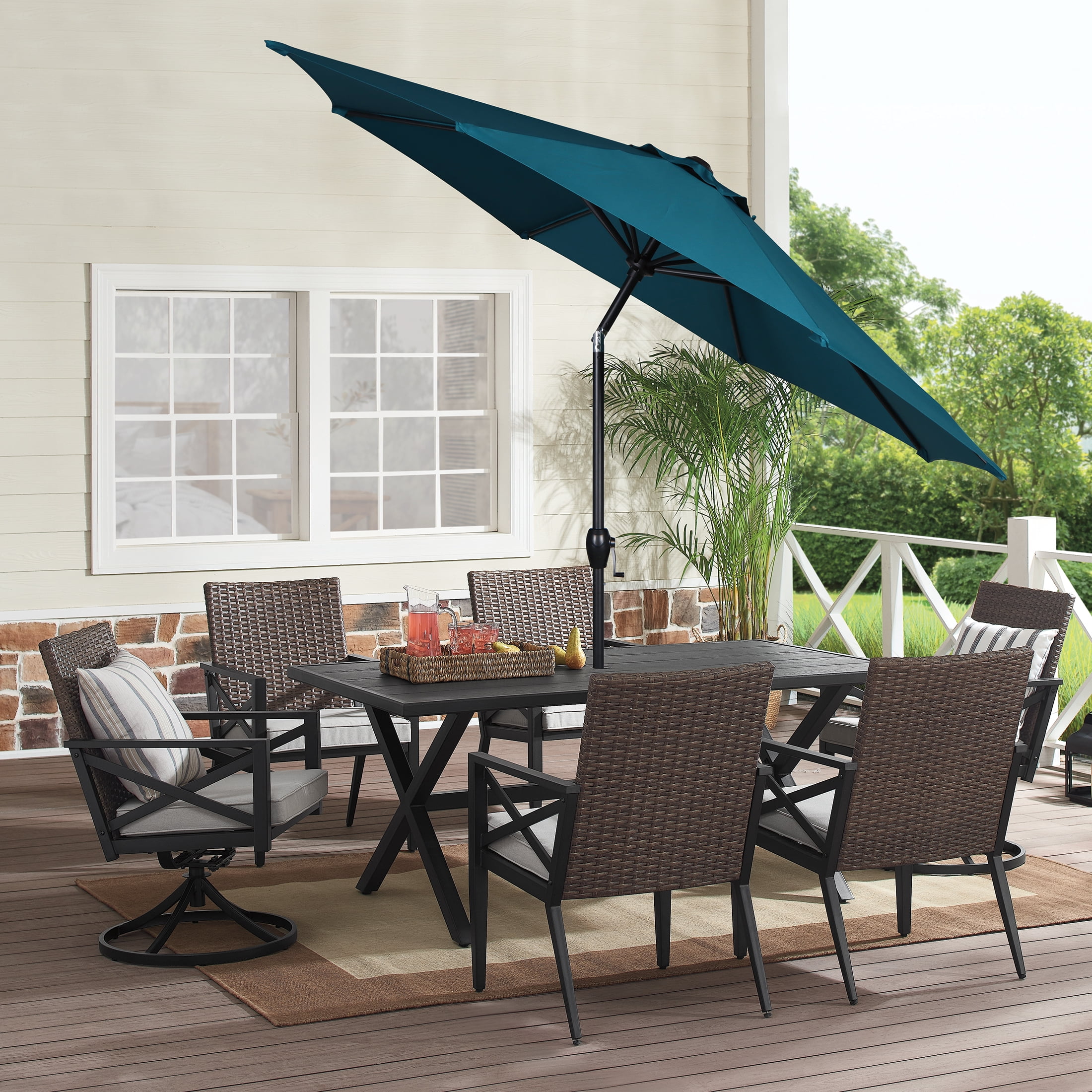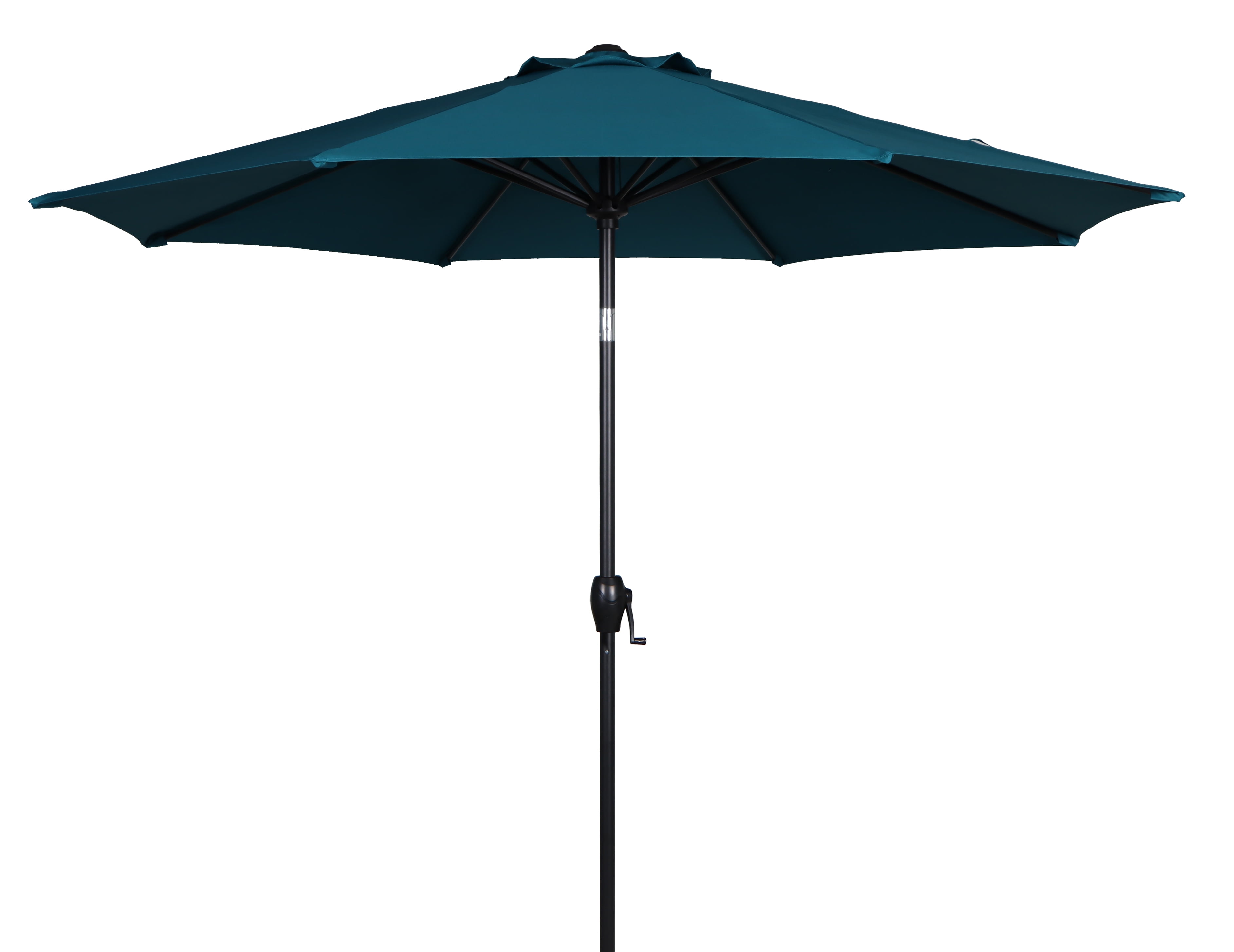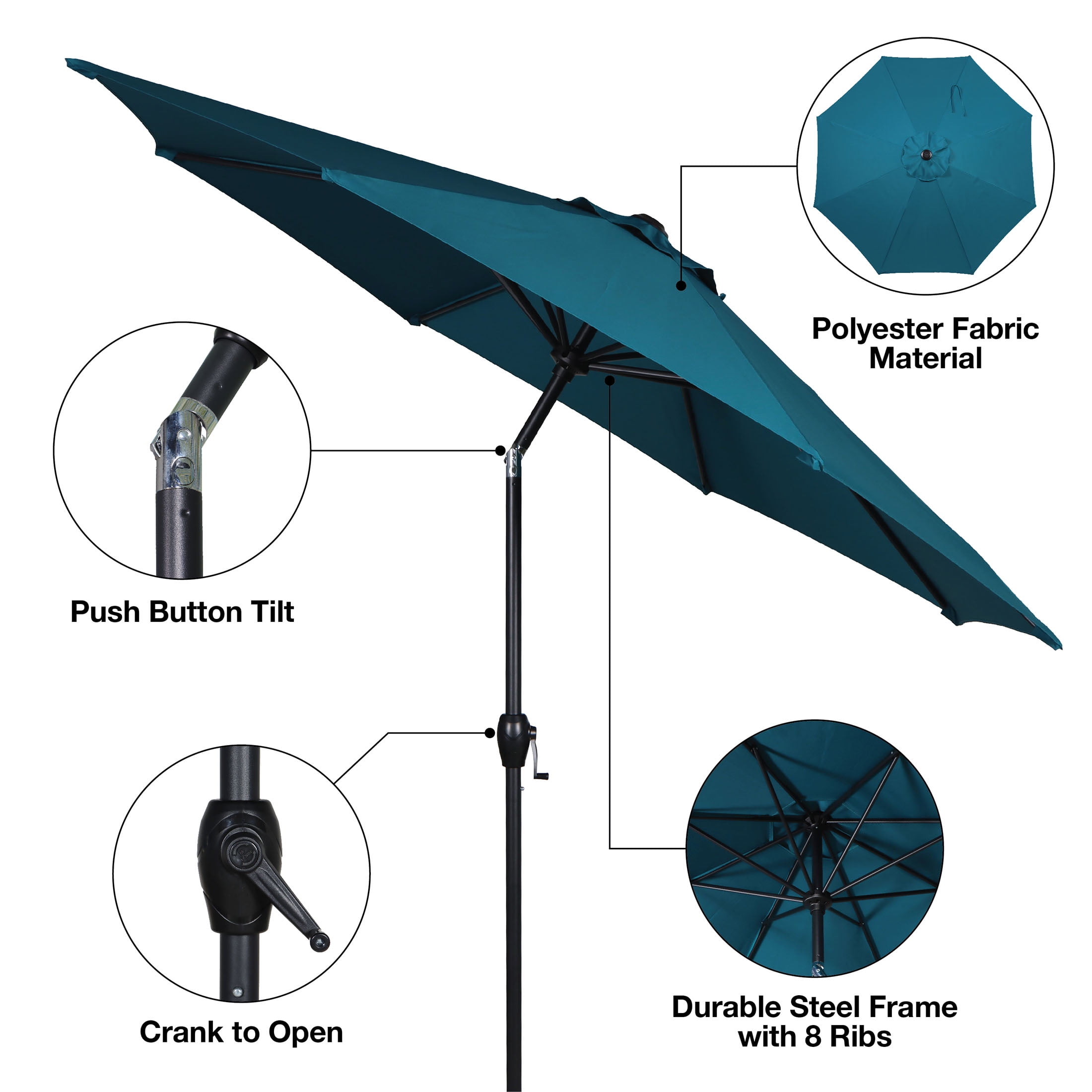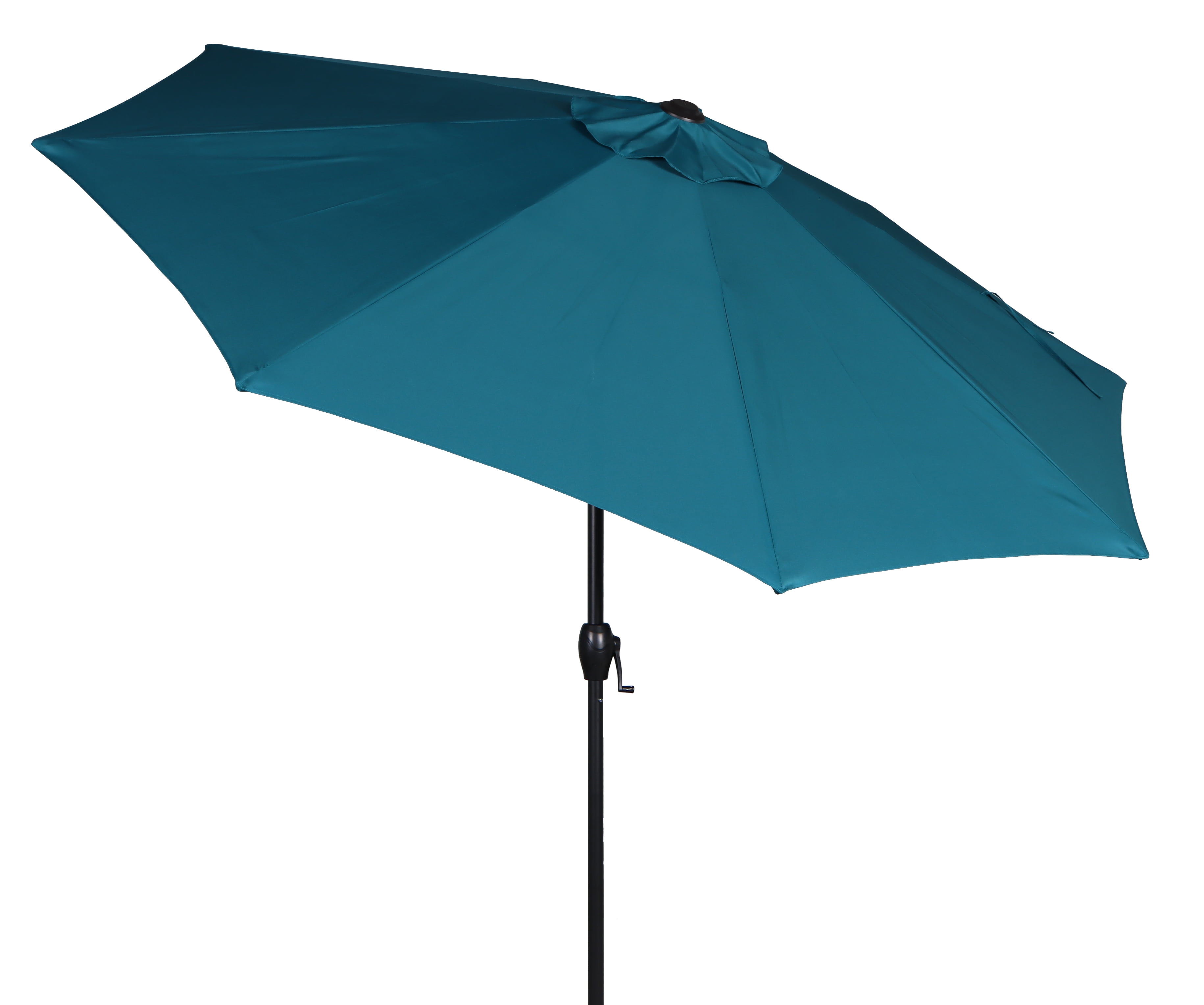 Crank feature easily opens the umbrella 3-way tilt offers protection from bright sunrays from several angles Great choice for garden patio or deck Durable and strong powder-coated steel helps extend the life of the umbrella Eight steel ribs provide canopy support Fade-resistant fabric for years of use Can be used either through a table (with a 26lbs. base) or freestanding (with a 75 lb. base) Base not included Supplies enough coverage to shade 42- to 54-inch table Care: Spot clean with mild soap and water, do not bleach Assembled product dimensions: 9′ x 9′ x 8′ No assembly required Product weight: 12lbs Product materials: Steel, polyester Color: Teal For product replacement parts email customer service at [email protected] or call Monday through Friday 10:30am to 4:30pm EST 1-877-980-6928.