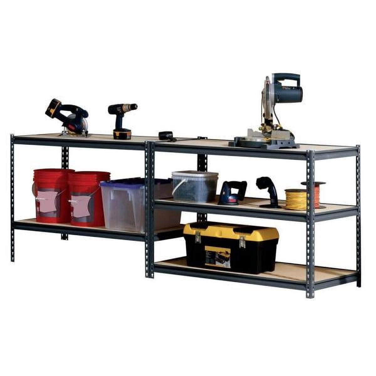 5-shelf unit with a steel rack and durable particleboard shelves will keep your garage or utility space organized Heavy-duty steel frame with black powder coat finish resists damage and corrosion Model number: UR245P-BLK Total weight capacity: up to 4,000 lbs. distributed evenly over the entire unit Corner post rivet holes are punched at 1.5 inches so you can customize shelf height Manufacturer warranty: 1-year warranty Instruction manual included Color: Black Muscle Rack shelving unit size: 48″W x 24″D x 72″H Assembles in minutes with just a hammer; no nuts or bolts required Includes: Beams, Braces, Post & Wooden Shelves