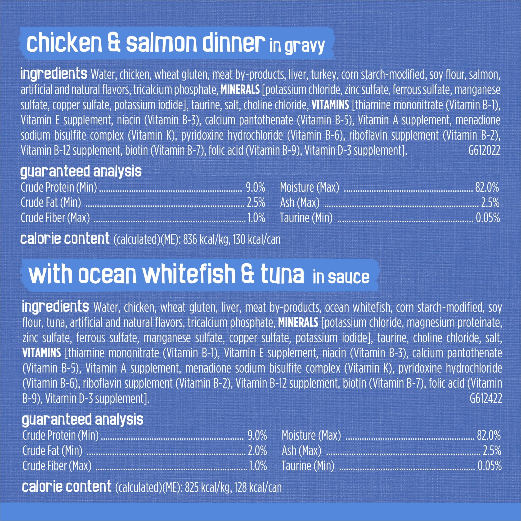 Serve up savory and nutritious goodness for your feline companion by filling her dish with Purina Friskies Shreds Variety Pack, Shreds With Beef, Turkey and Cheese Dinner, Chicken and Salmon Dinner, and With Ocean Whitefish and Tuna canned cat food at mealtime. Beef, turkey, chicken, salmon, ocean whitefish or tuna deliver the mouthwatering flavors she craves, while the tender and moist cat food shreds offer a pleasing texture she’s sure to purr for. A decadent, soft cat food gravy or sauce balances out these delectable recipes, giving your cat a mouthwatering reason to lick her dish clean. Open the pull-tab can and let the rich Friskies canned cat food aroma capture her interest and watch as she happily nibbles her way to a satisfied belly. She’ll adore the yummy flavors, and you can appreciate that this Friskies cat food delivers 100 percent complete and balanced nutrition for adult cats in every serving with no artificial colors or preservatives. These with beef, turkey, chicken, salmon, ocean whitefish or tuna cat food formulas are part of the full line of Purina Friskies wet and dry cat foods and are formulated to meet or exceed industry standards. Finding true value and quality ingredients is extremely important when shopping for cat food. End your search for both qualities today, and get back to spending precious time with your furry feline by ordering her Purina Friskies Shreds Variety Pack, Shreds With Beef, Turkey and Cheese Dinner, Chicken and Salmon Dinner, and With Ocean Whitefish and Tuna canned cat food at mealtime.