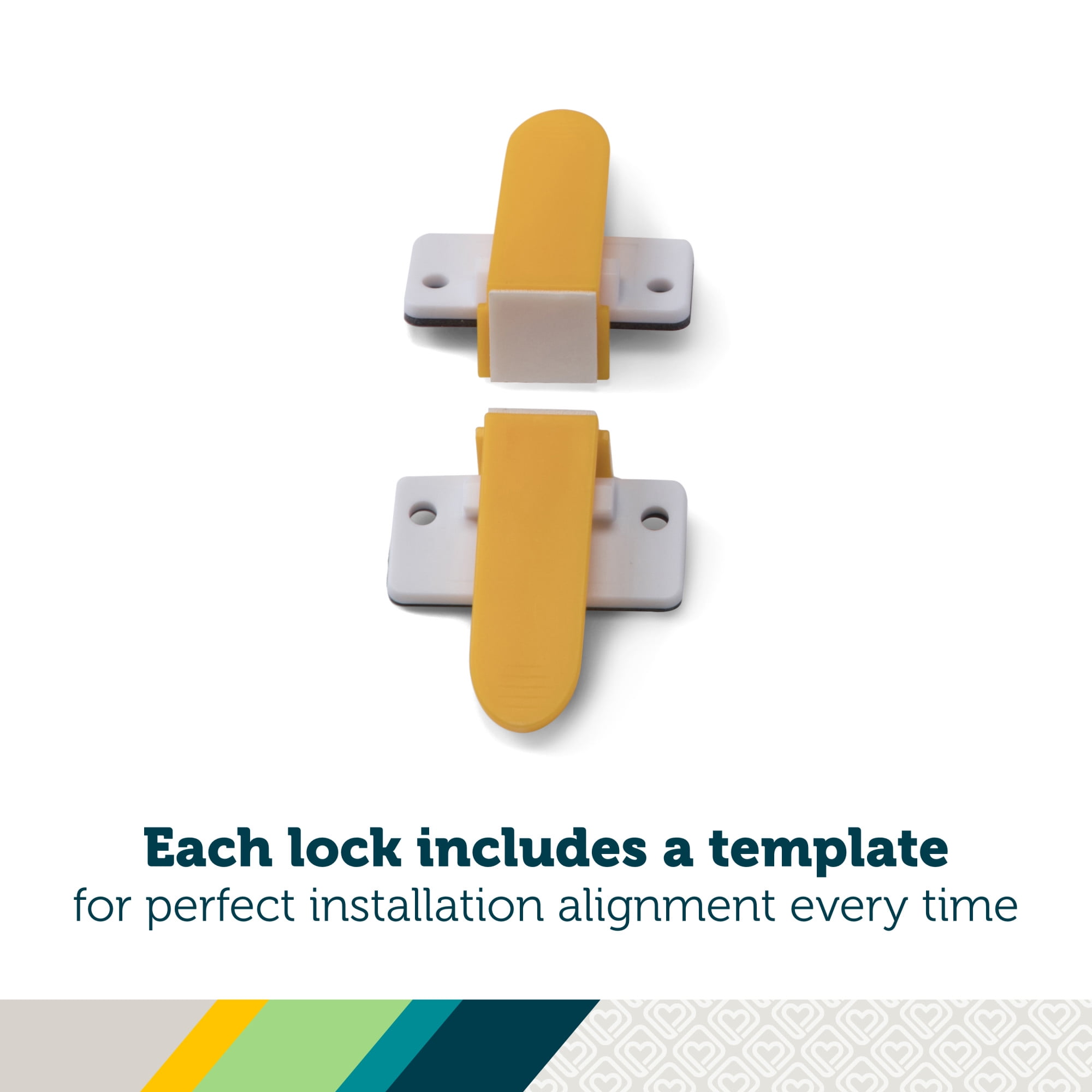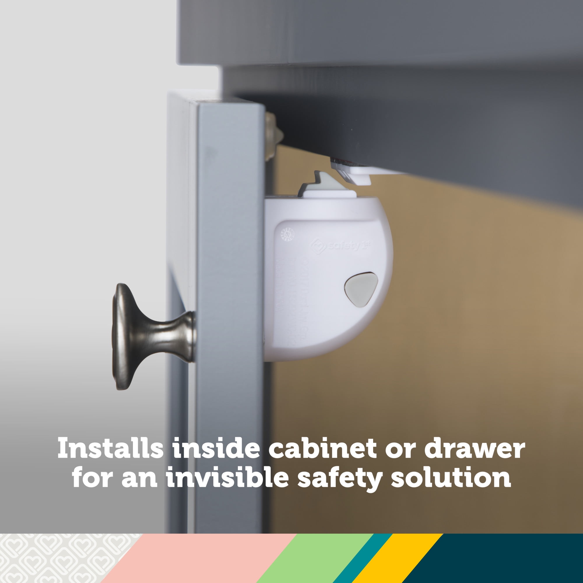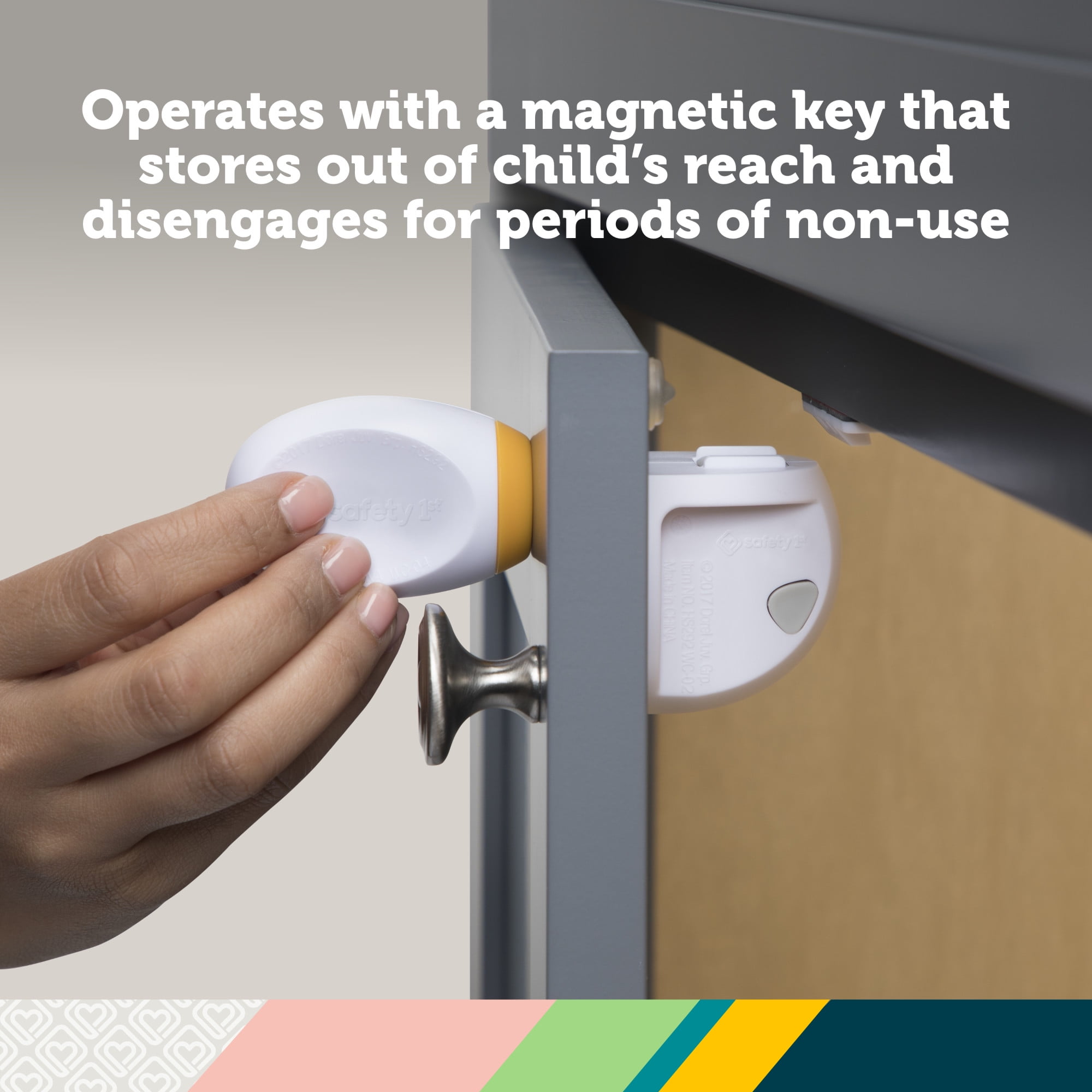 With the Safety 1st Adhesive Magnetic Lock System, you can easily secure cabinets and drawers to create a child-friendly space where your little one can safely explore. These locks are the perfect babyproofing option for any home, including those who are renting and grandparents to use on a semi-permanent basis, since they’re not screwed into cabinets and drawers. Installation is simple—just peel and stick, no tools necessary. The easy-to-follow yellow plastic template ensures proper alignment and secure installation every time. (Some cabinet and drawer materials, such as particle board, require the use of screws, which are included.) These ingenious locks install discreetly inside your cabinets and drawers, making them invisible from the outside to visitors. They unlock with a magnetic key that can be stored high up and out of your child’s reach. Also, for times when you need to temporarily unlock the cabinets or drawers, or for when grandparents only need to childproof during visits, you can disengage the locks during periods of non-use with the push of a button. When you’re ready to keep things shut, the locking indicator lets you know that the lock is properly engaged again. The Safety 1st Adhesive Magnetic Lock System includes eight locks and two keys. Safety 1st believes parenting should have fewer worries and more joyful moments. As the first and only leader in child safety, Safety 1st is here to give you peace of mind so you can spend less time worrying and more time enjoying every first you experience with your child.
