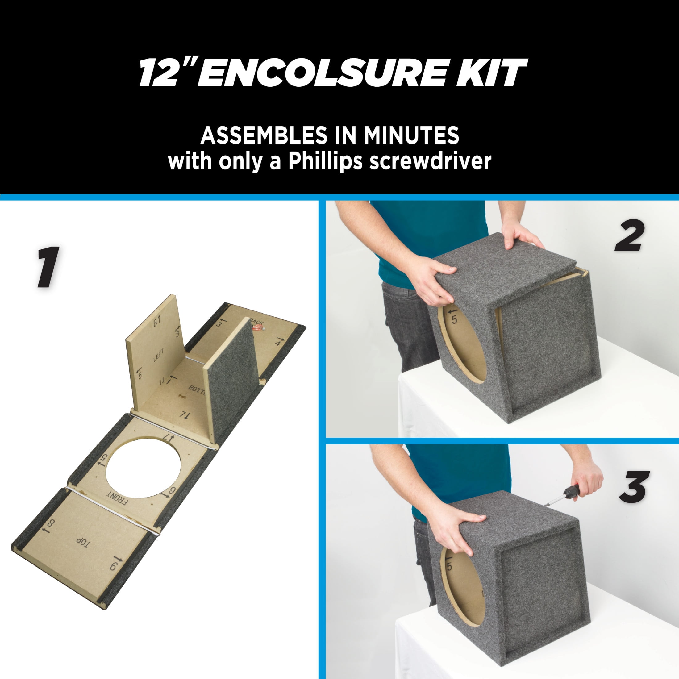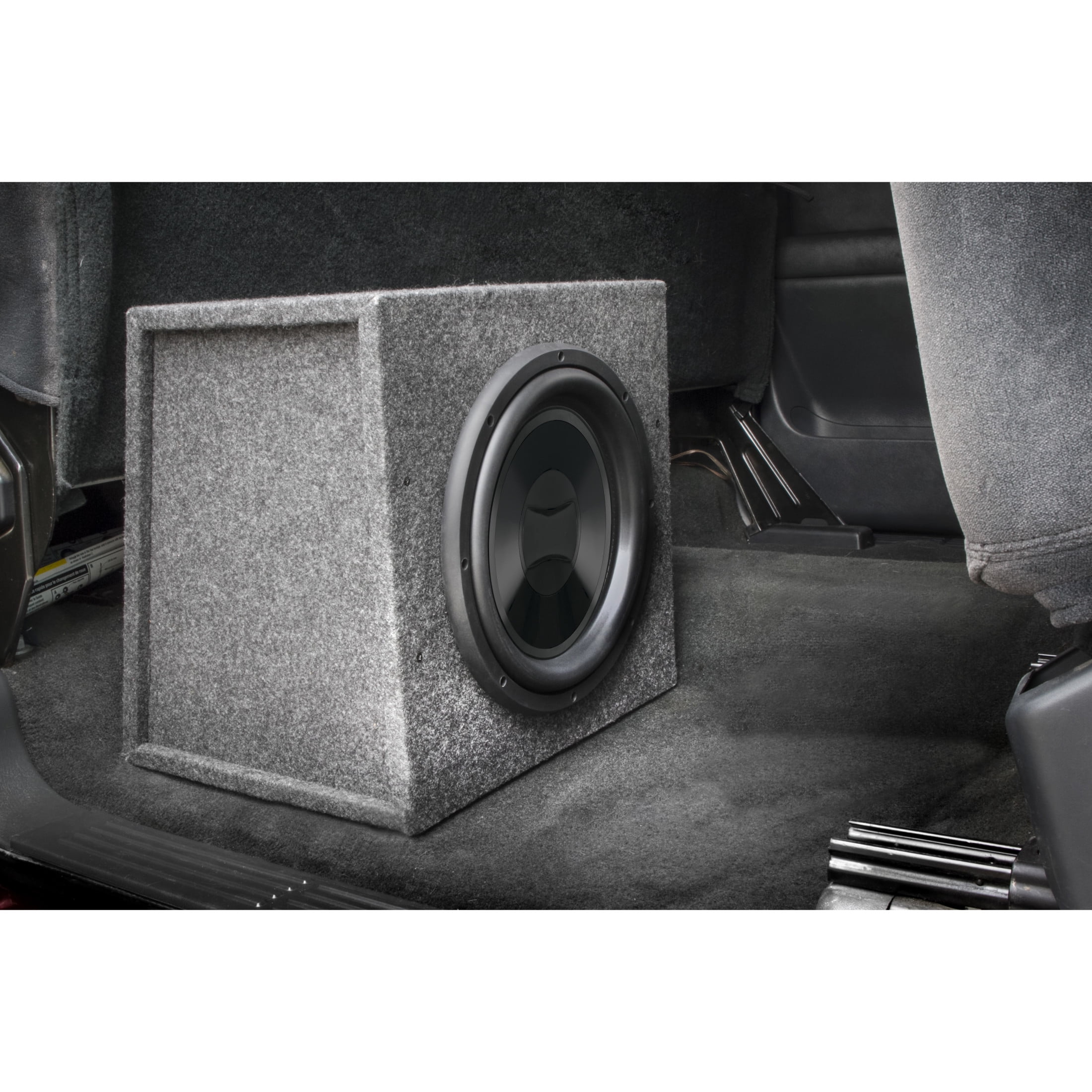 Scosche Build-your-own 12 Inch Subwoofer Stereo Enclosure Gray Carpet Speaker enclosure adds an additional 12-inch subwoofer that won’t fit on its own. The enclosure is constructed of 5/8″ MDF with a poly fiber damper lining. Nickel-plated spring terminals. Reinforced with glued joints and seams Speaker box comes carpeted with a standard grey trunk liner for maximum durability. Plastic wrapped with color packaging cards to repel dust and dirt. 1 pair of pre-wired enclosures, terminal cup, baffle material, and mounting screws. Recessed side panels for easy lifting in your car along with internally pre-wired fast-on terminals. I Subwoofer Box 16.75 x 17.75 x 20.55 inches