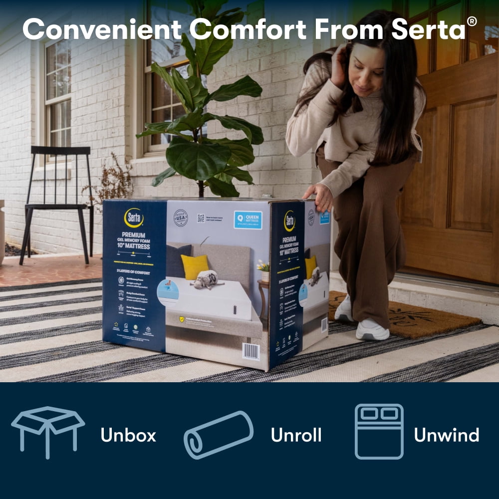 Discover the Perfect Sleep Solution with the Serta 10″ Medium Firm Tight Top Cooling Gel Memory Foam Mattress Experience unparalleled comfort and support with the Serta 10″ Queen Size Medium Firm Tight Top Cooling Gel Memory Foam Mattress. This mattress is designed to provide a cool, customized sleep experience, delivered directly to your doorstep in a convenient mattress-in-a-box format. Shipping and Convenience: The comfort you expect from Serta is conveniently packaged in a box and shipped to your door. Just unpack, unroll, and unwind on your new mattress for a great night’s sleep. Serta Always Comfortable As a pioneer in sleep innovation for over 90 years, every mattress across the Serta® portfolio is designed to provide superior comfort you can trust night after night. Serta mattresses undergo rigorous performance and durability testing to ensure yours is as comfortable on the 1000th night as it was on the first night. Serta also tests individual components, giving you quality and durability down to the last stitch. Shop smart and sleep comfortably. Optimize your sleep with the Serta 10″ Medium Firm Tight Top Cooling Gel Memory Foam Mattress. Enjoy the perfect blend of comfort, cooling, and support for a rejuvenating sleep experience.