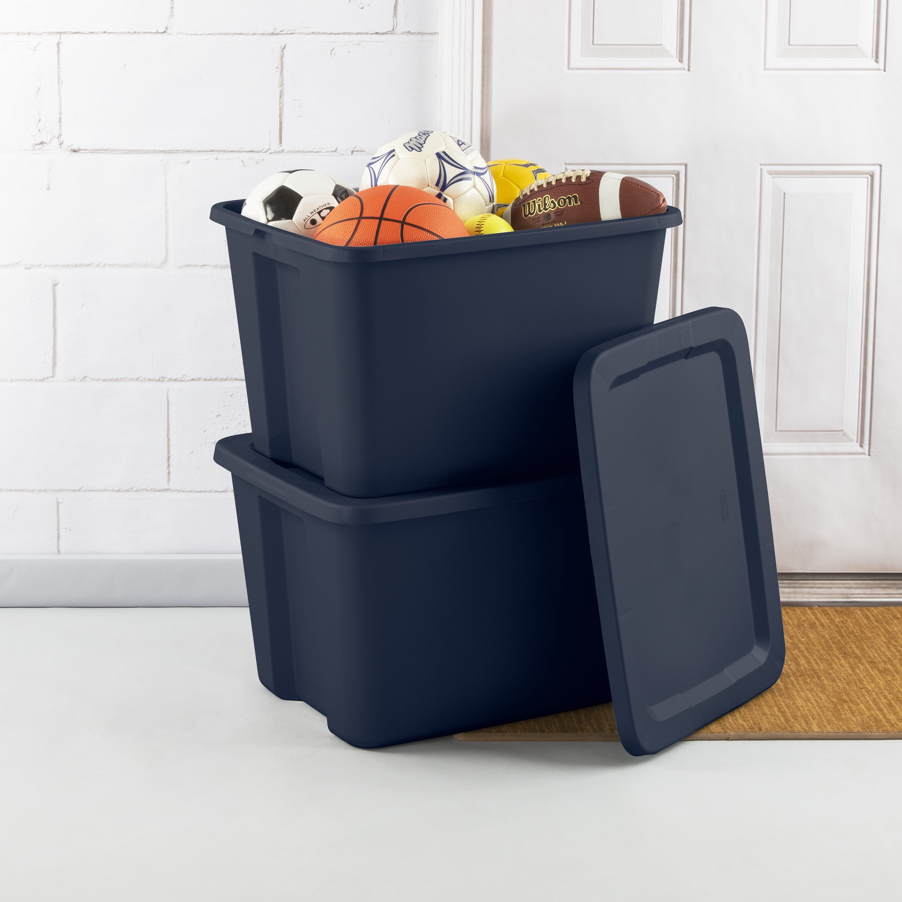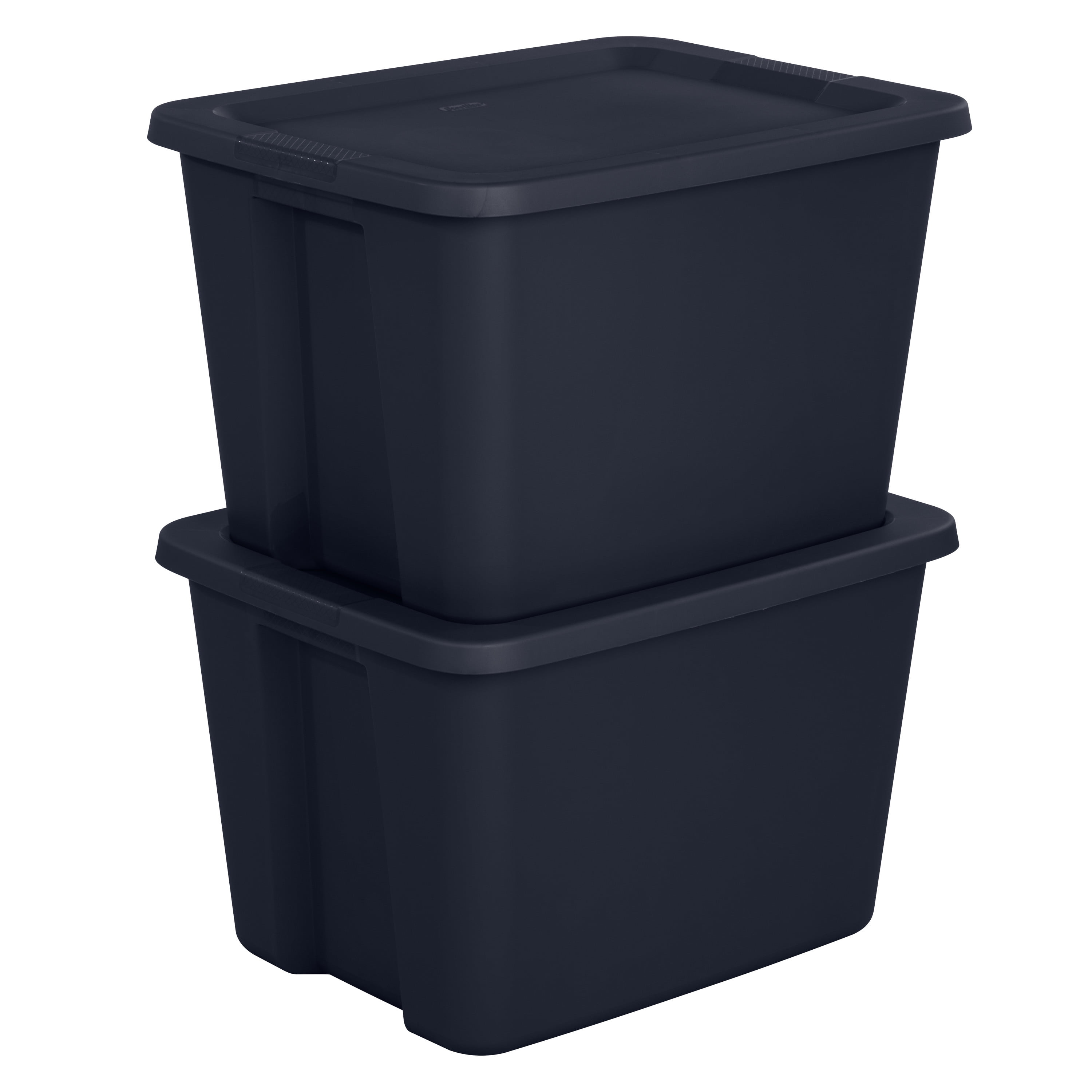 Sterilite Adult Plastic 18 Gal. Tote Box Blue Cove: Outside Dimensions: 23 1/8″ x 18 1/8″ x 14 7/8″ This popular size 18 Gallon Tote is ideal for a variety of basic household needs Single unit option Opaque base allows contents to be stored and concealed out of sight – Blue Cove Interior Dimensions at bottom: 16 3/4″ x 13 3/4″ x 14 3/8″ This popular size tote is ideal for a variety of lightweight household storage needs, such as clothing, toys, and linens Integrated handles with textured surface provides a sure grip for more comfortable carrying Lid snaps firmly to base to ensure contents stay contained and concealed Deep recessed lid allows for secure stacking to maximize vertical storage space BPA-free and phthalate-free