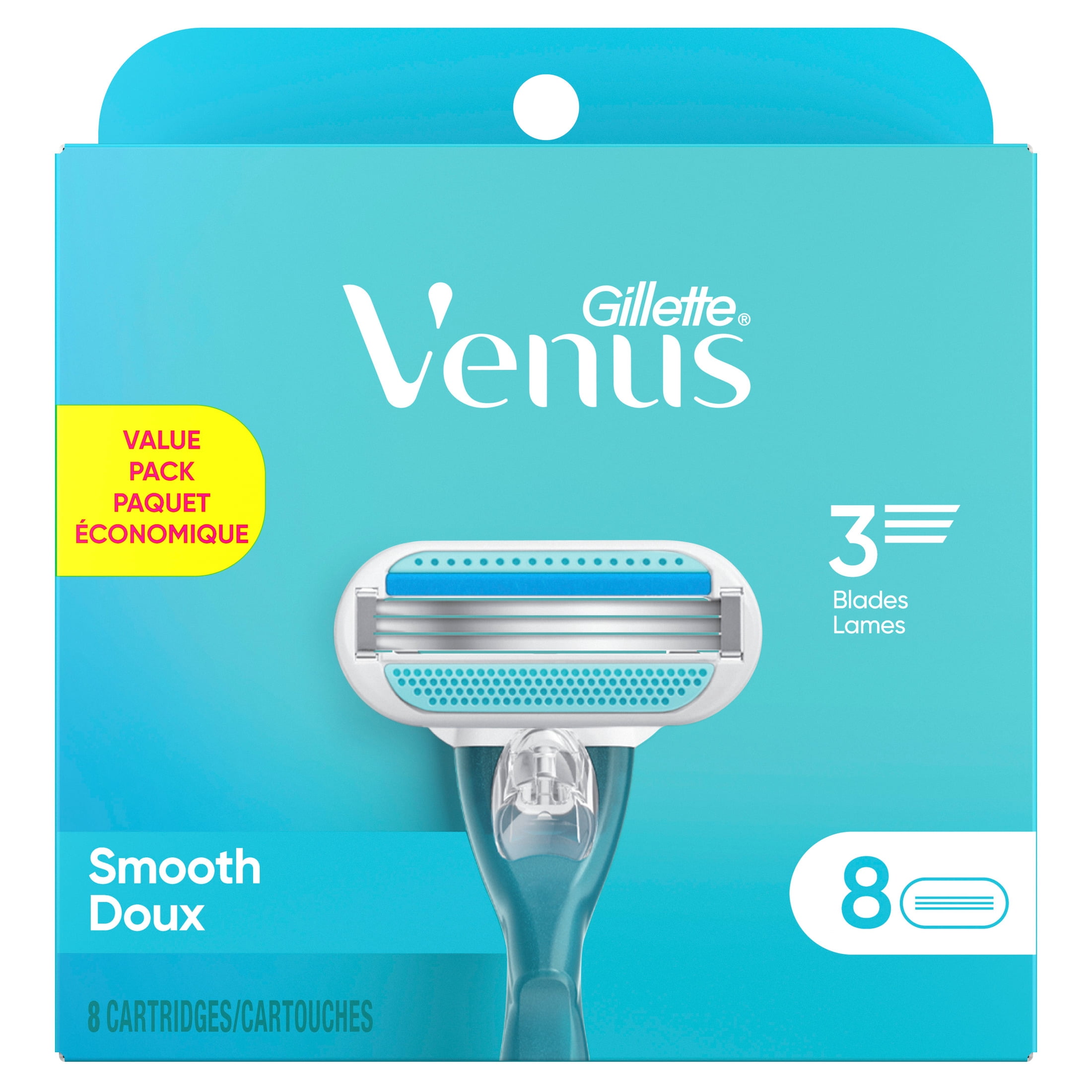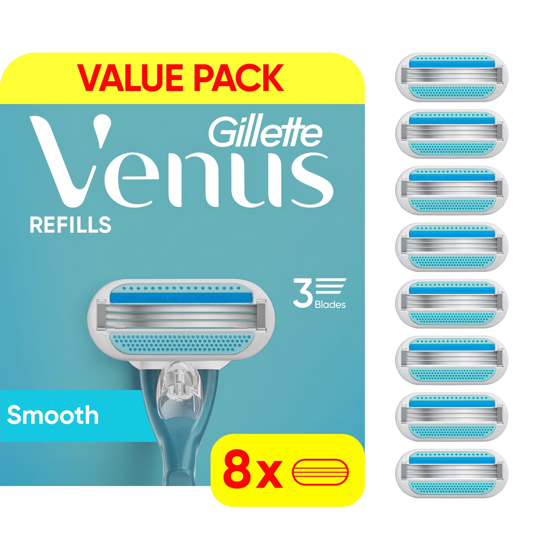 Gillette Venus razors for women are designed with a woman’s body in mind. From handles designed for a comfortable grip to pivoting heads that contour to curves, Venus razors are designed to help reveal smooth skin. The Venus Smooth women’s razors are the FIRST EVER 3 bladed razors designed for women. Featuring 3 curve-hugging blades surrounded by protective, elastomer comfort cushions smoothing skin for a quick and straightforward shave with results you can rely on. The pivoting head responds to subtle changes in your body’s contours. The razor blades also feature a blue indicator strip that fades away to tell you when you are no longer getting the optimal shave. Based on shaving twice per week, each razor blade refill will last for up to 1 month. Just use and replace when you are ready for a new one. Shave hair quickly and effectively. Shave right, not more. Did you know that any Venus blade refill fits any Venus razor handle? Shave your way without buying a whole new Venus handle. 0.14 lb