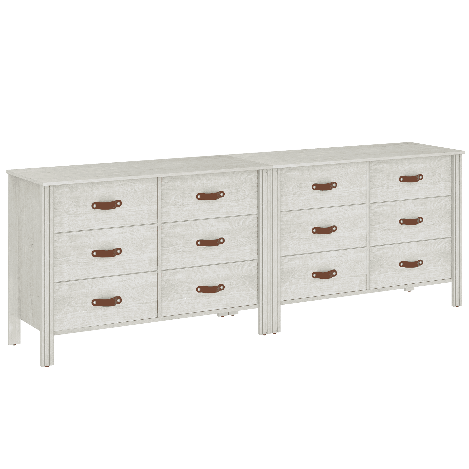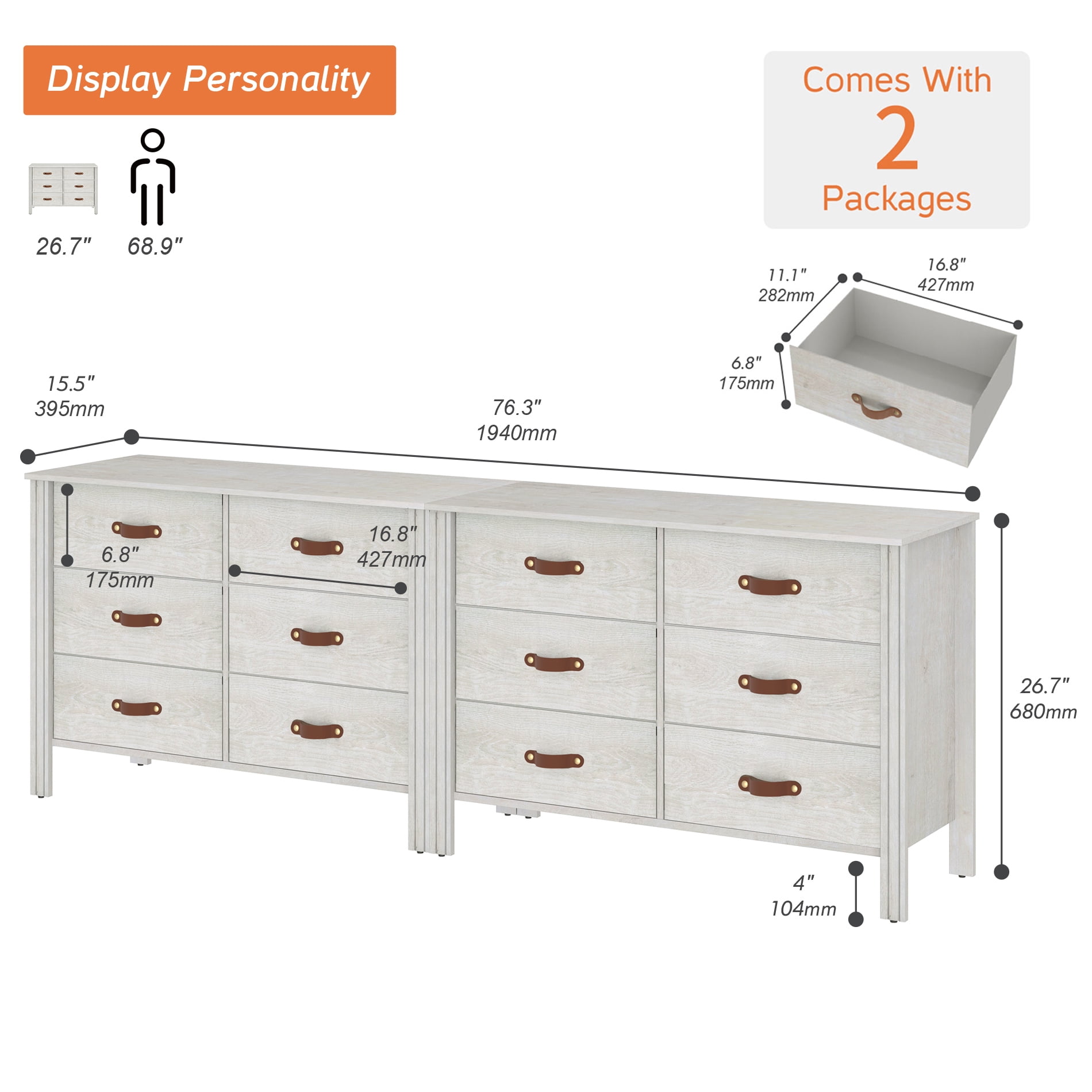【2 PCS Dresser Set】The dresser includes two white small dressers. Overall Dimension of each one: 38.1″×15.5″×26.7″(L×W×H). 【Large Drawer】With 6 wide drawers, the large dresser allows you to store many items. And the fabric drawers with wood grain surface is portable and elegant. 【Elegant and Simple Look】The white dresser is designed with wood grain surface and leather handle to offer more peculiarity. It also can be used as storage cabinet, console table, etc. 【Sturdy Frame】The wooden dresser is equipped with four solid wood legs to offer large weight capacity and long life span. Weight capacity of tabletop: 44 lbs. Weight capacity of drawer: 6.6 lbs. 【Convenient to Install】The chest of drawers features smooth waterproof surface so you could clean it effortlessly. And it is easy to assemble for you.