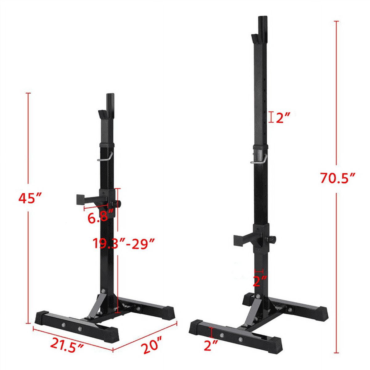 2-Piece Adjustable Squat Stand Rack or Barbell Free Press Bench, Black: G.W.: 19.9 Kg/ 43.9 Lb Material: Metal Black Finish Max Load: (Approx.) 200 kg / 441 lb Overall Size (Approx.): 54.5 x 50.5 x (114-179) cm/ 21.5 x 20 x (45-70.5)” (LxWxH) Adjustable Height (Approx.): 114-179 cm/45-70.5″ Base Size (Approx.): 54.5 x 50.5 cm/ 21.5 x 20″ (LxW) Square Tube (Approx.): 5 x 5 cm/2 x 2″ Hole Spacing: 5 cm/2″ Color: Black Quantity: 2PCS Please Note: Please allow slight measurement deviation for the data. Thanks for your understanding! Package includes: 2 x Squat Stands and 1 x Instruction For added safety and stability, this adjustable squat rack uses selective metal nuts paired with quality washers