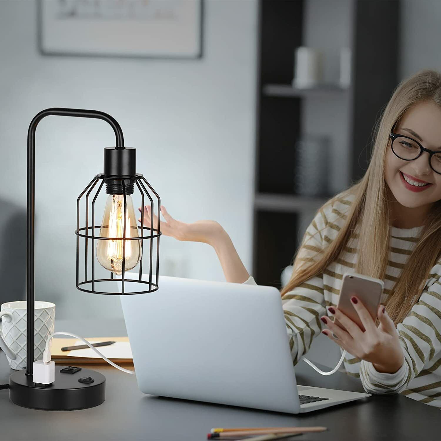 uD83DuDCA1ãSet of 2 Table LampãThe Edison lamp construct with heavy-duty metal body and metal cage which very easy to put together. Geometric hollow shape lampshade of the desk lamp offer maximum light output. Farmhouse design style is a fabulous desk decor for your living room uD83DuDCA1ãDesk Lamp with USB Charging Portsã There is also dual 5V/2.1A USB charging port on the base of the table lamp. So You can also charge your smartphones, tablets and other devices via USB charging port without extra adapter. Save anxiety and time to search around for a not readily noticeable tiny change port. uD83DuDCA1ãTable Lamp with Outletã The modern lamp contains a 2-prong outlet inside the base. You can charge your kindles, headsets or other devices. To ensure the safety while using, please don’t use the electric appliances with power more than 800W on the outlet. uD83DuDCA1ãReliable Quality for SafetyãThe Cord, Socket, Plug and charging station of modern nightstand lamp are UL listed. By giving products the listed, you don’t have to worry about the safety problem. The benefit is the USB ports and outlet also keep charging function when the rocker switch turns off. Specification Voltage: 110V-120V Power Up State: US Plug Bulb Type: E26 LED Bulb Switch Type: Rocker Switch Material: Metal Color: Black Shade: Metal Wire Cage Weight: 2.4Lb (1.1kg) Style: Modern / Contemporary / Industrial Cord Length: 1.65m (5.41ft) Package Content: 2 x Table Lamps(bulbs are not included)