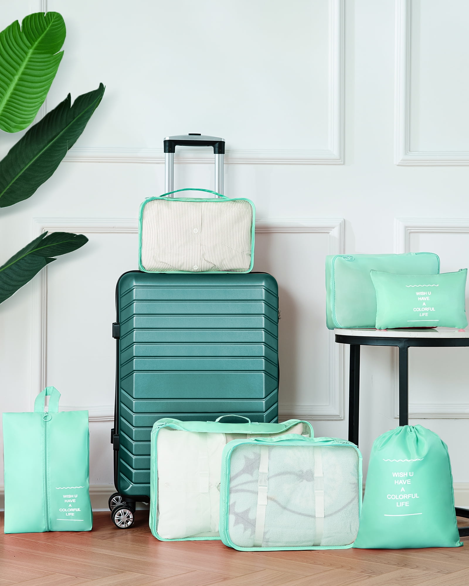 2 Piece Travel Luggage Sets (20″&28″) Hardside Suitcase with 7PC Organizer Bags,Green