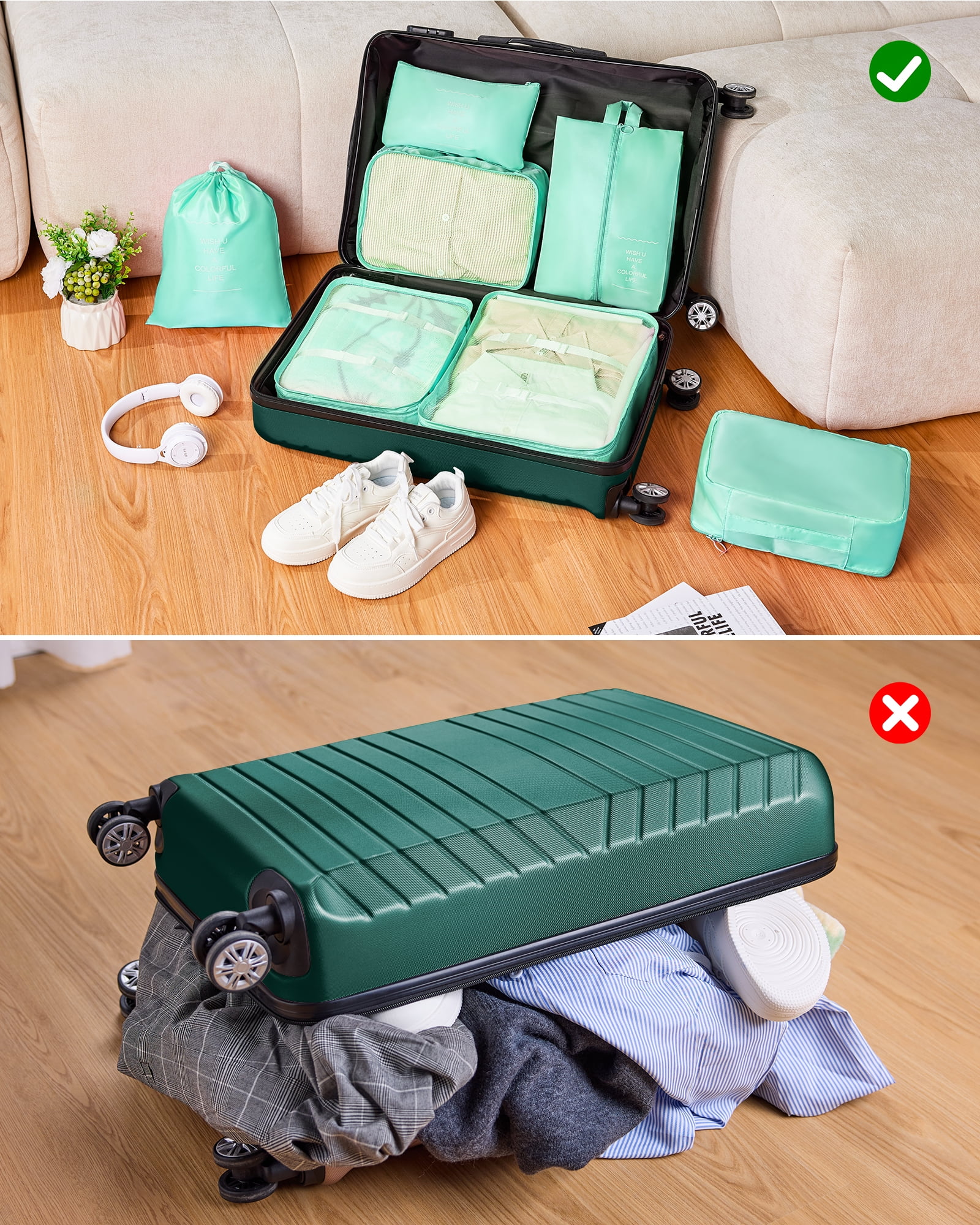 NESTED STORAGE: All the luggage and organized bags are nested to minimize storage and save space. with the double-sided and zipper storage, there is so much room in all the suitcases. 2-PIECE LUGGAGE: Perfect for all types for travelers, the 20-inch small suitcase meets carry-on needs for most international flights, while the 28-inch suitcases is designed for checked and larger storage. STURDY & DURABLE: Made of ABS materials to ensure long-lasting quality and reliability for your travels. EASY TO MANEUVER: Our luggage sets come with smooth wheels and 3 step adjustable handles for easy movement through airports, train stations and bustling city streets. 7 PIECES ORGANIZING BAGS: The travel set offers 7 organizing pockets: 1* Extra Large bag, 1* Large bag, 1* Medium bag, as well as 1* Toilet bag, 1* Shoe bag, 1* Laundry bag and 1* Lingerie bag. They can hold a lot and help you keep things organized and separated. Luggage Set Dimensions: 20″Carry-On – 15″L x 9″D x 22″H (in) 28″” Checked – 18.7″L x 10.5″D x 29.8″H (in) Organizer Bag Dimensions: Extra Large Size – 40*30*12cm Large Size – 30*28*12cm Medium Size – 30*20*12cm Toilet Bag – 27*12cm Shoe Bag – 36*21cm Laundry Bag – 36*27cm Underwear Bag – 26*15*9cm