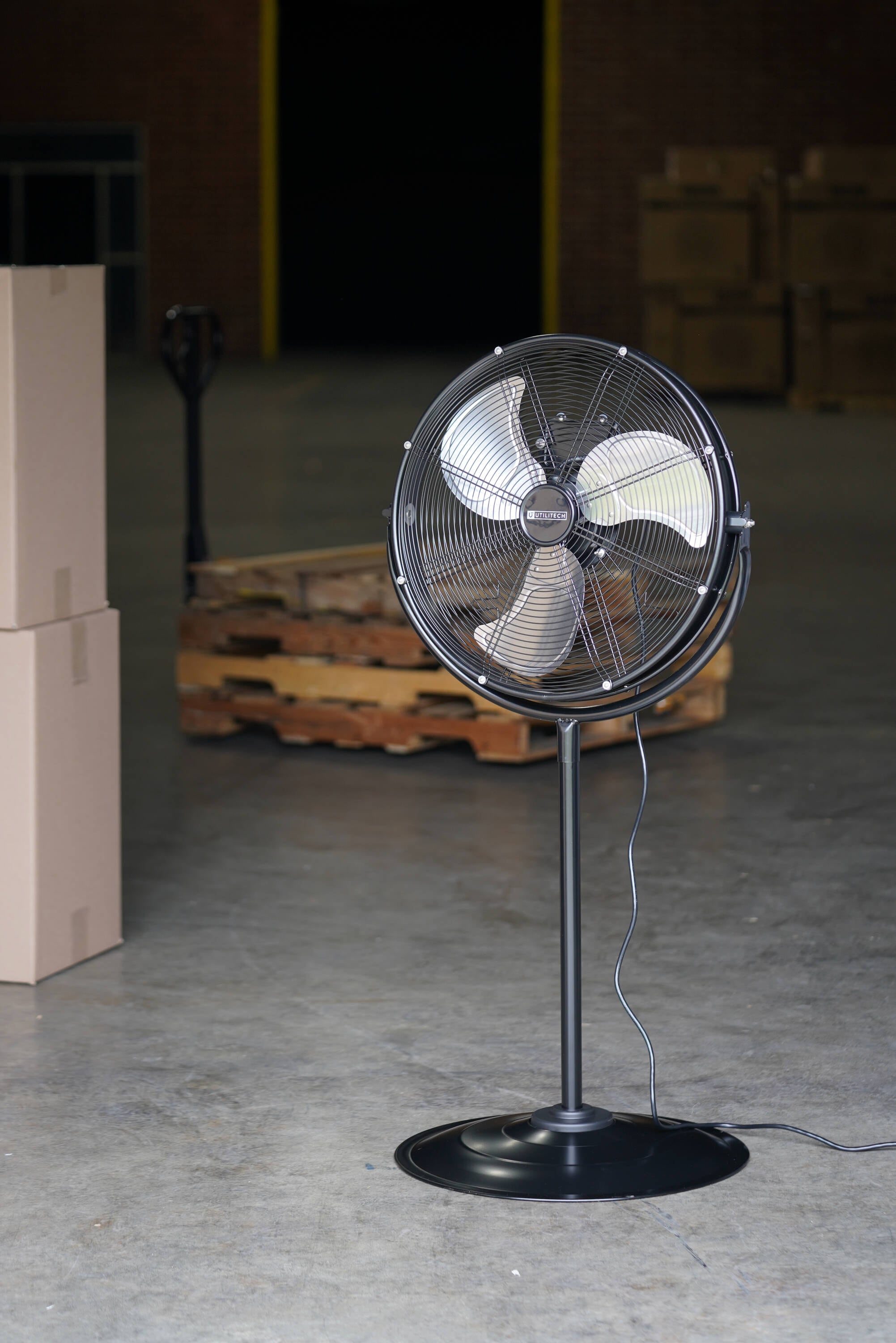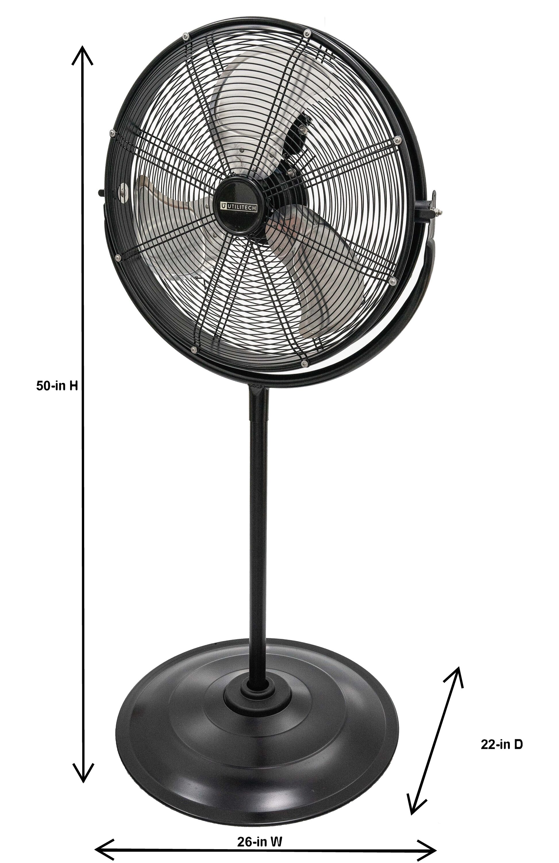 The Utilitech 20 inch high-velocity pedestal fan with shroud is a commercial-grade unit that performs on the job day in and day out. The fan is UL rated for indoor or outdoor use. It provides directed airflow, cooling large areas quietly and with ease due to its three high-velocity speeds and metal blades designed for maximum air movement. Versatile and portable, the height can be changed and the head tilts to provide air flow exactly where needed. Rugged and durable, this fan will help cool your warehouse, workshop, patio or garage. This Utilitech fan is packed with features to maximize air flow in your space.