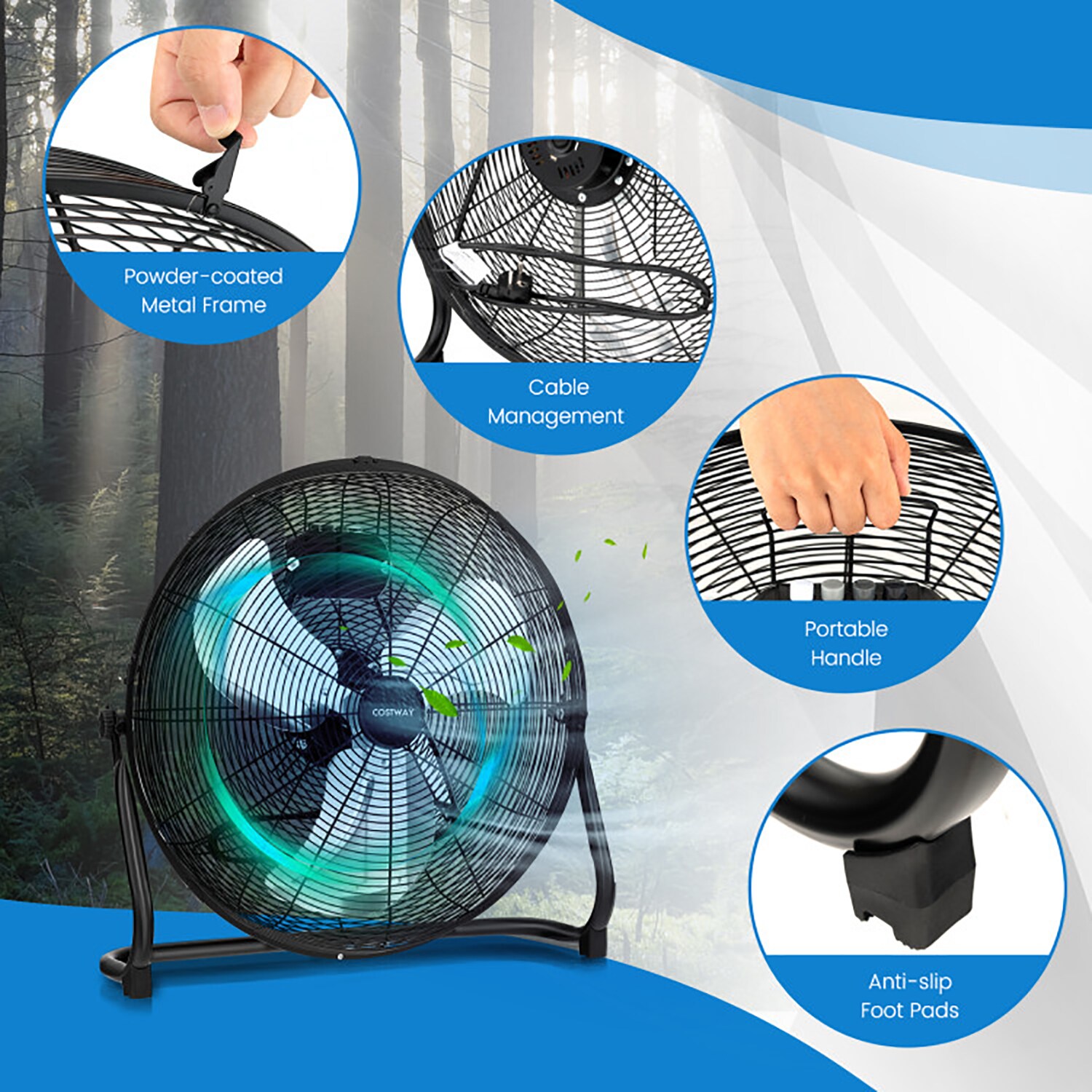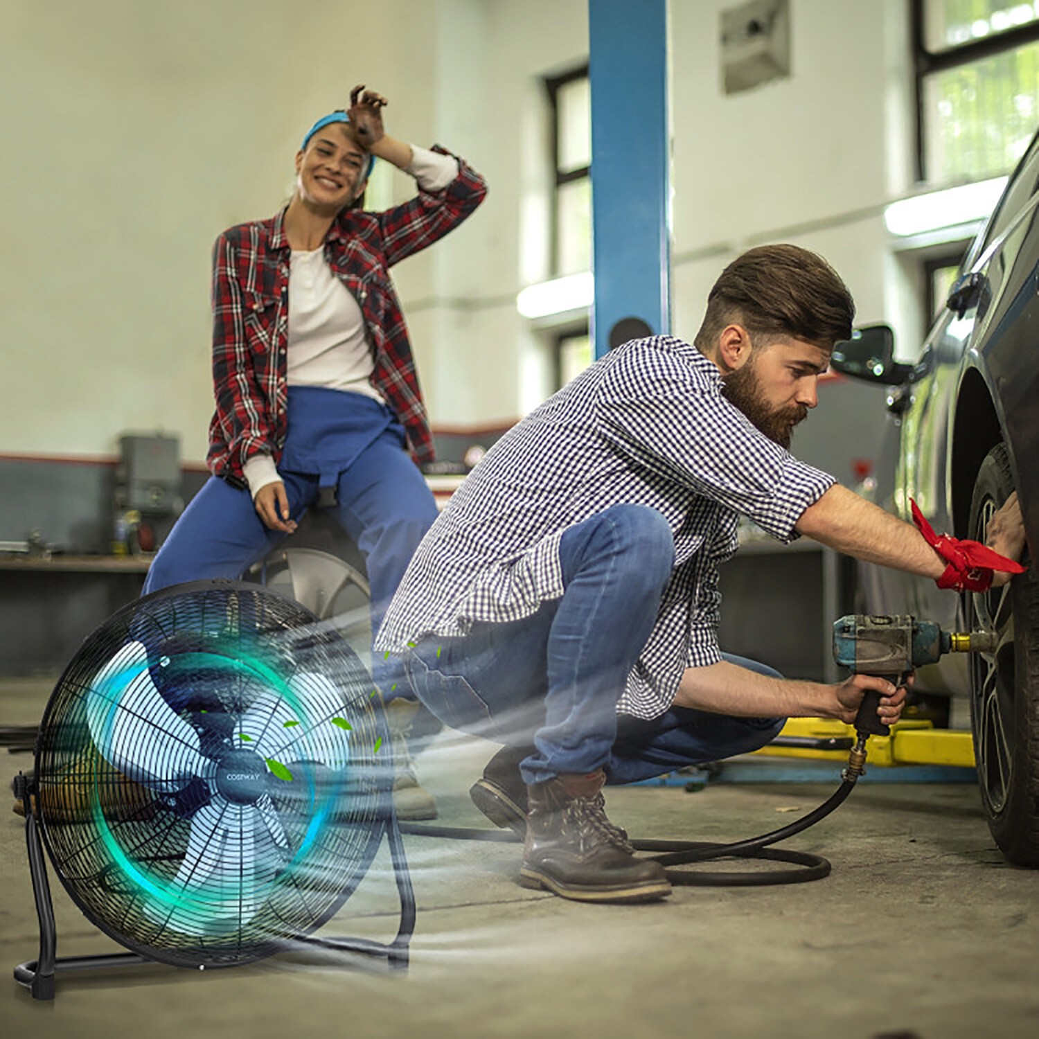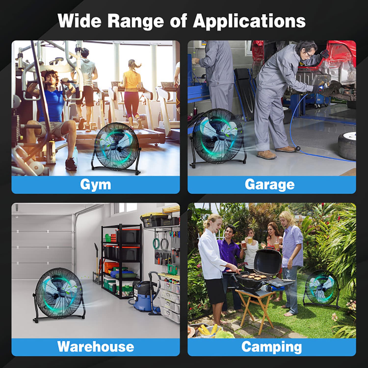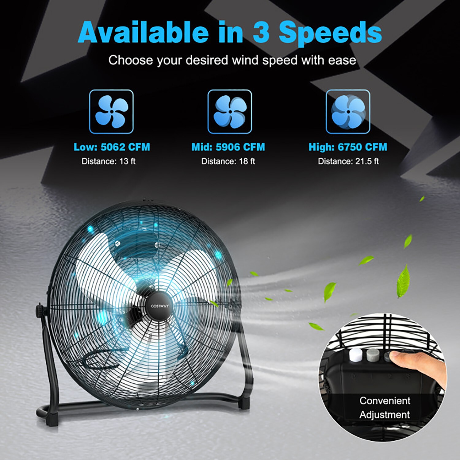The operation is easy with the control switch, and this floor fan is designed with 3 adjustable fan speeds: 5062 CFM (Low Speed)/5906 CFM (Medium Speed)/6750 CFM (High Speed). It also features a 145° adjustable tilt that provides flexible wind direction and meets different needs.