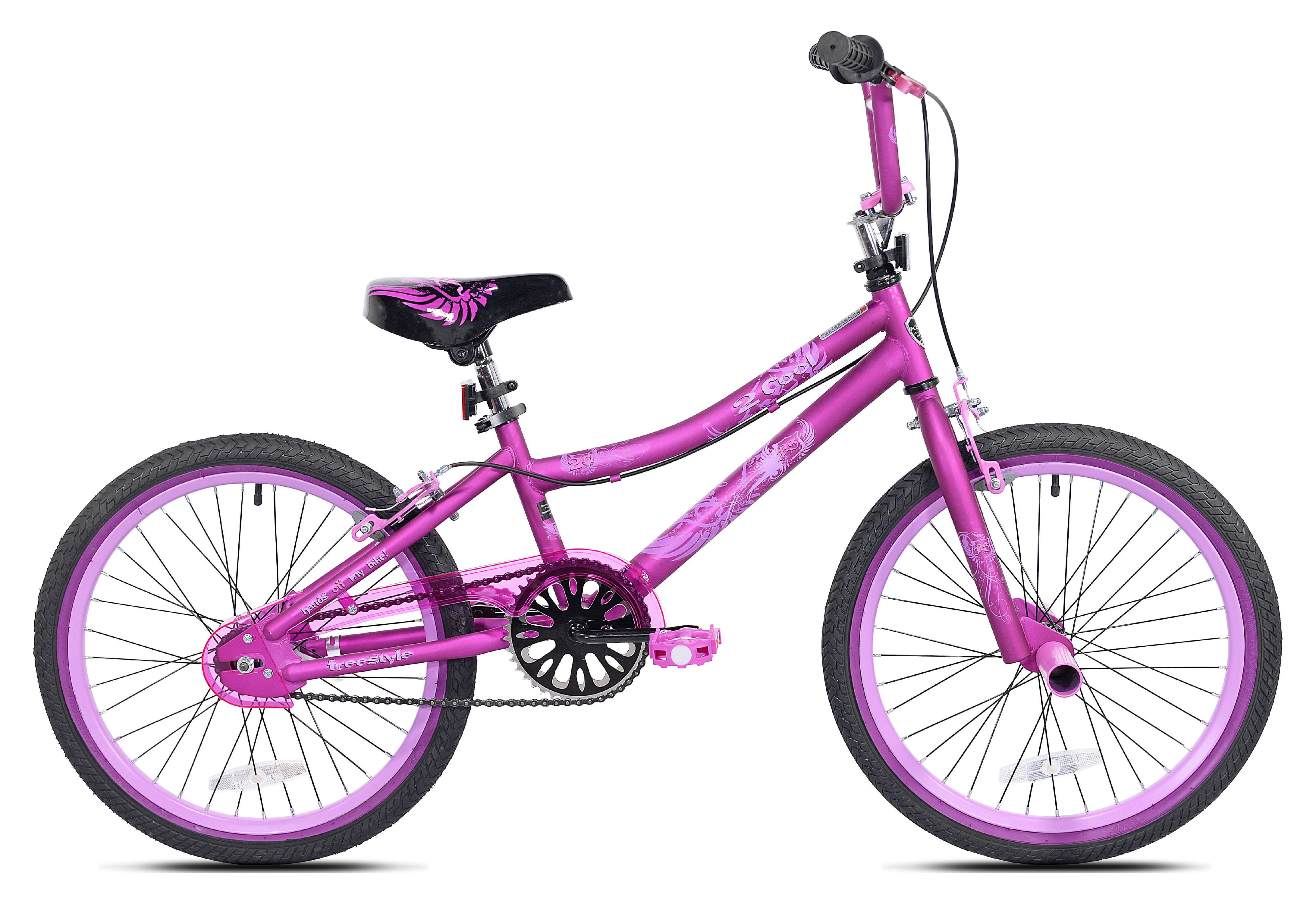 Young ladies will love riding this 2 Cool BMX Girls’ bicycle out with their friends. It features a durable steel frame with a drop bar to make mounting and dismounting easy. It has both a rear foot brake and dual hand brakes to give the rider improved control. This 20″ BMX bike includes single-speed gearing and plastic pedals that will provide her with plenty of power to ride on flat surfaces and small hills. Steel BMX handlebars provide exceptional steering capability. This fun girls’ bike comes with a colorful padded seat that will provide a comfortable place to sit while she rides. The Kent BMS bike comes in a fun satin purple color. If you select Site to Store delivery, you can call your local store, as complimentary assembly may be offered at that location. Perfect for your child.