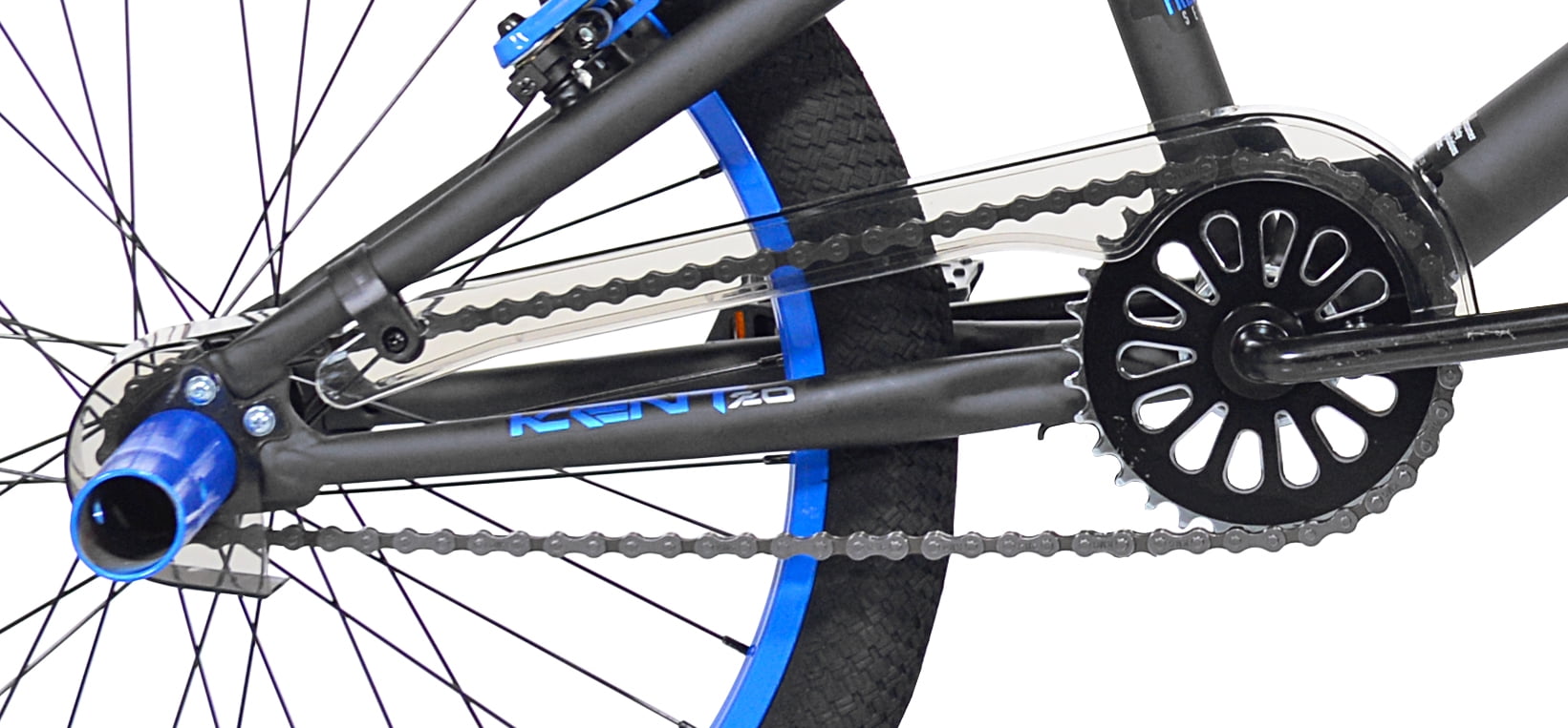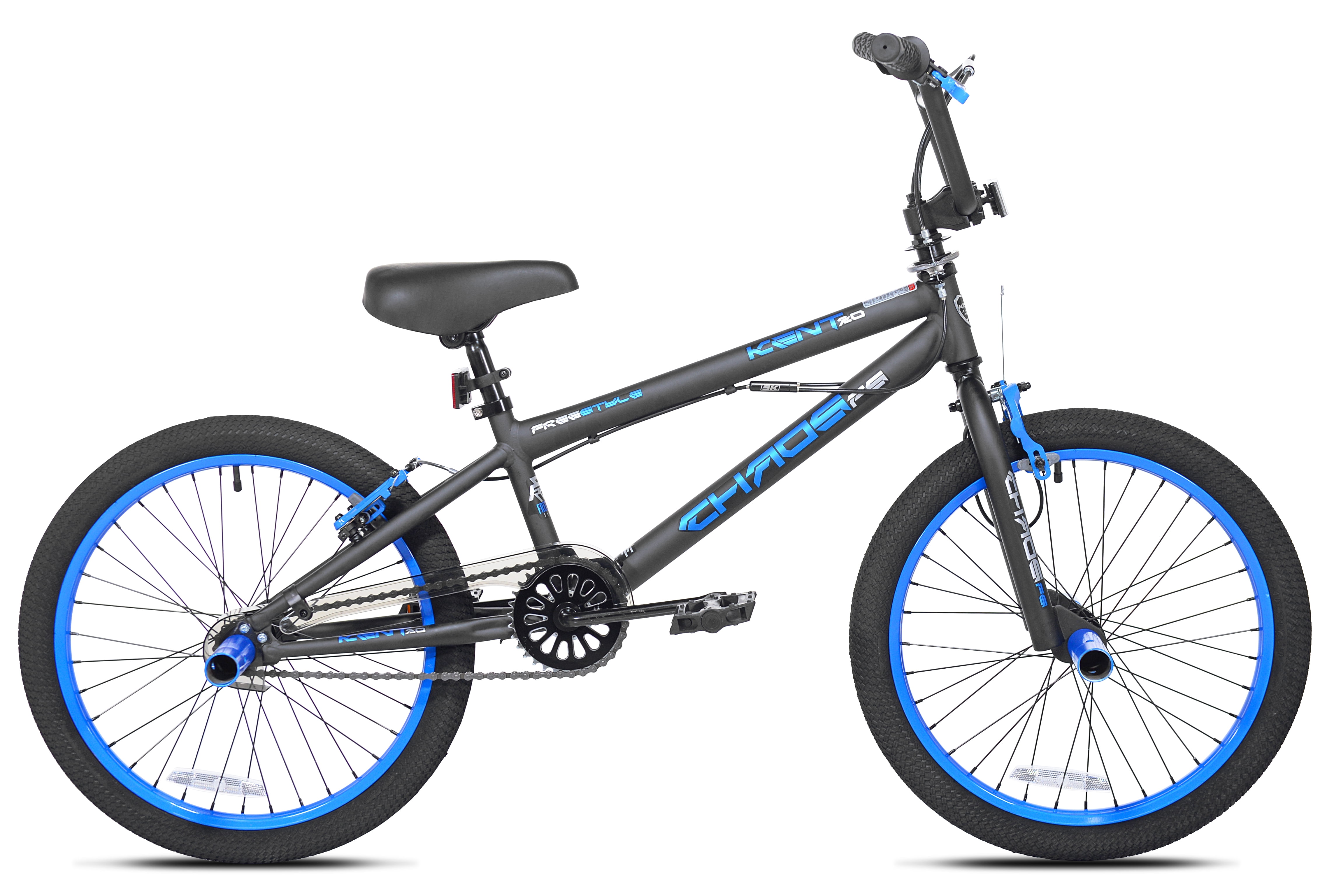 This single-speed 20-inch Kent chaos boys freestyle bicycle is a tricked-out ride that is made for action. It is an ideal bike for learning new stunts, improving your freestyle chops, and short cruises around the neighborhood. This Kent freestyle bike is equipped with a reinforced high-tensile steel frame, 20-inch by 2.1-inch freestyle tires, and front and rear steel pegs. An alloy rotor system makes it easy to perform a variety of tricks and allows you to do 360-degree handlebar rotations. This 20-inch freestyle bike also has sturdy alloy rims, dual-caliper hand brakes, and a clear PVC chain cover. It is designed for riders from 8 to 12 years of age. Age Group: Child/Tween Gender: Male