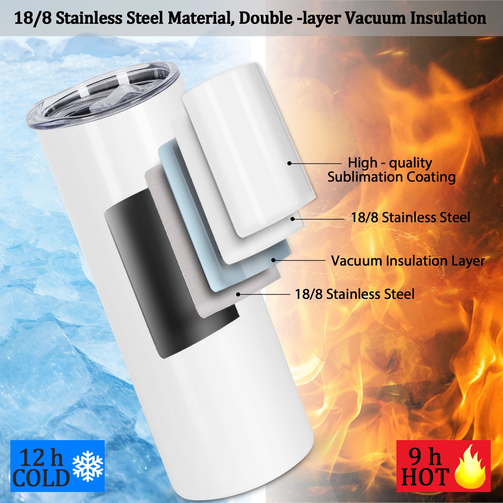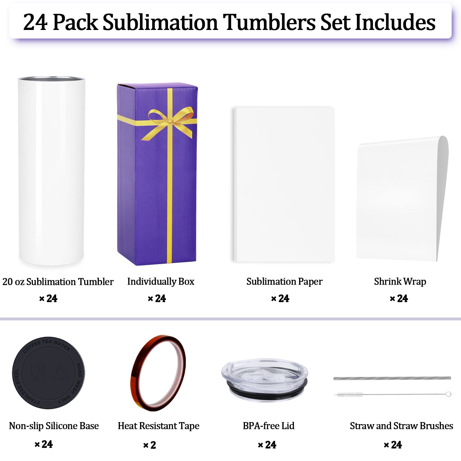20 Oz Sublimation Tumblers Feature: 【High -Quality Sublimation Coating】The 20 oz sublimation sippy cup has a high -quality sublimation coating, which can ensure your pattern transfered clear and bright. 【Healthy and Safe Material】The sublimation tumblers is made of 18/8 stainless steel material, and the straws and lids do not contain BPA, which protect your drink safely. 【Double -Layer Vacuum Design】With double wall vacuum design, the 20 oz sublimation sippy cup can keep cold 12h and hot 9h. 【Individually Packaged】Each cup is equipped with a separate box, which is convenient for gifting. 【Satisfied Service】If you have any questions about the product, please contact us at any time. We will provide 100% satisfactory service for every customer. You will receive: 20 oz sublimation tumbler × 24 BPA-free lid × 24 straw brushes × 24 shrink wrap × 24 non-slip silicone base × 24 individual box × 24 Sublimation paper × 24 Heat resistant tape × 2