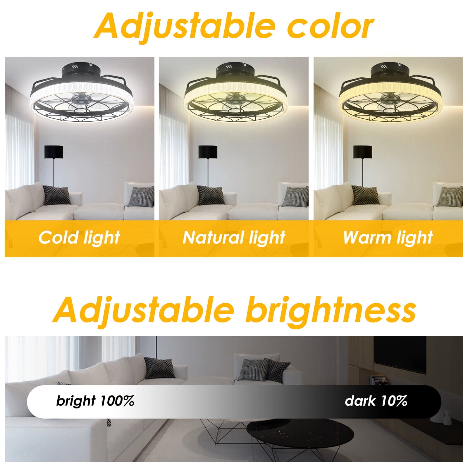2-in-1 Low Profile Ceiling Fans with Lights: This is a modern industrial style decorative ceiling fan light, equipped with a metal cage enclosure, which not only has the beauty of a lamp but also the practicality of a fan, making it the first choice for indoor decoration. The lamp and fan of the ceiling fan light are individually controlled, which can provide you with lighting and allow you to enjoy the cool breeze. Excellent Acrylic LED Light: Acrylic has good transparency and a clear and delicate texture, which can perfectly reflect the light emitted by the LED lamp, thus ensuring the service life of the lampshade. In addition, it also has the effect of energy conservation, as it has the characteristic of high temperature resistance, which can effectively block the high temperature outside the lampshade, thereby reducing the electricity consumption of LED lights during use and saving energy. APP & Remote Control: The small ceiling fan with light can be freely adjusted through the remote control or APP for functions such as light brightness, color temperature, and wind speed. Technology transforms life, let this small ceiling fan with light create a beautiful living atmosphere with you! Professional Noise-cancelling Design: The flush mount ceiling fan light has 5 blades and produces no more than 40 decibels of sound when in operation, the equivalent of a person whispering. This quiet flush mount ceiling fan light is ideal for children’s rooms, attics, studies, bedrooms and rooms with low ceilings. Multi Functional Ceiling Fan Light: This small ceiling fan with light has complete functions, with 6 wind speeds, color temperature, and brightness can be freely adjusted. In addition to the night light mode, timing function, and natural wind mode, it is also equipped with a forward and reverse rotation function of the fan blades, which can bring you fresh air even in winter.
