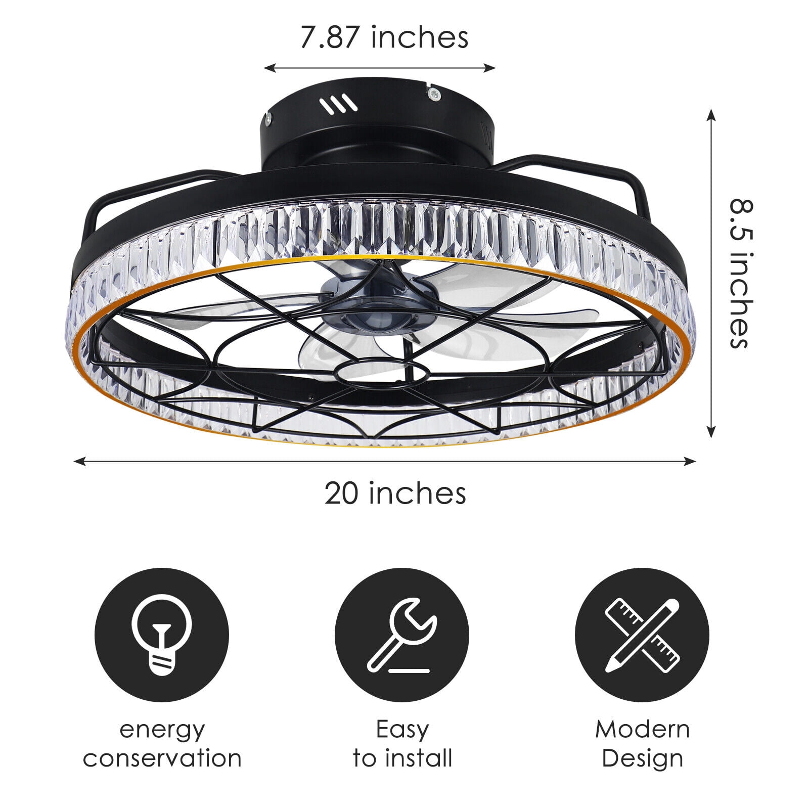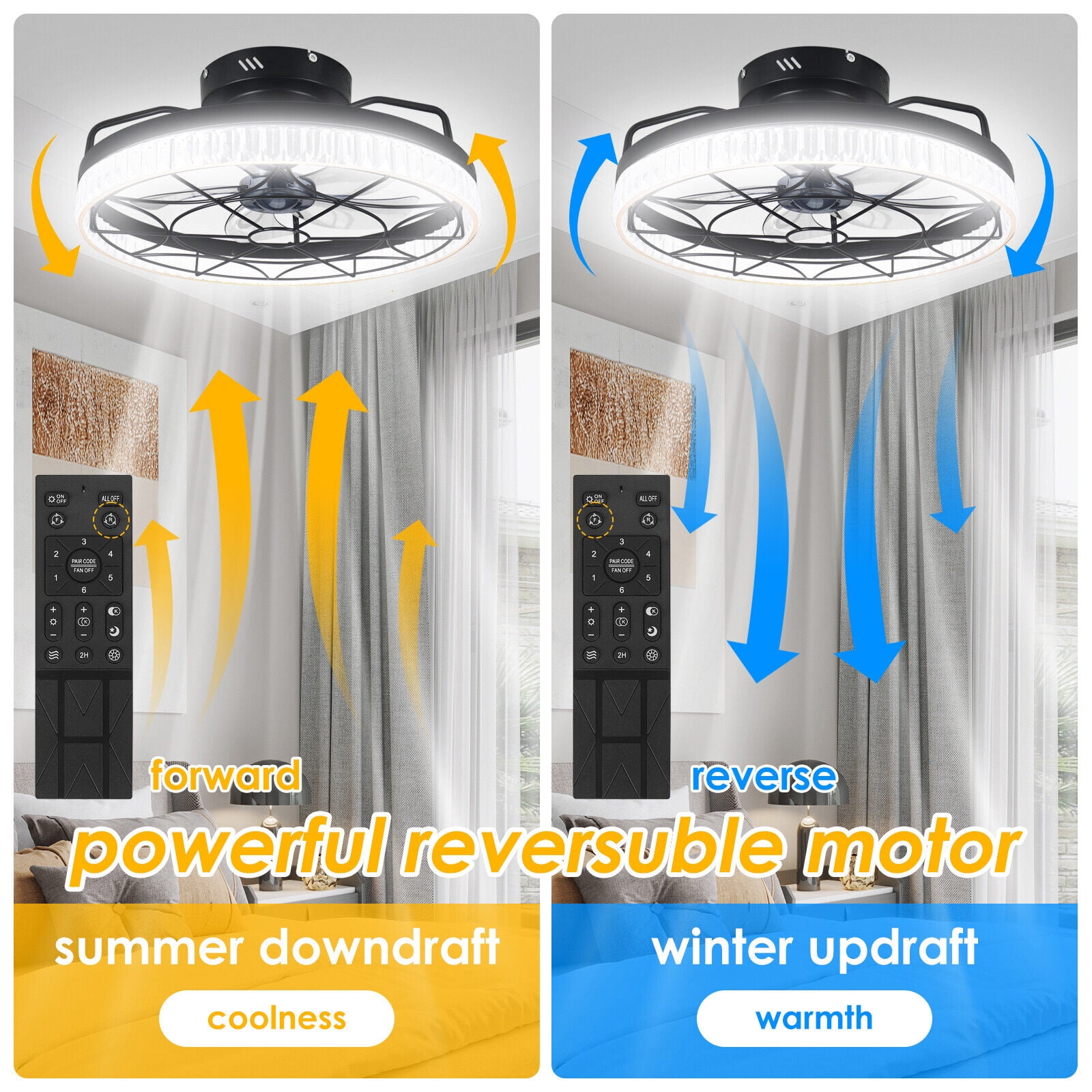 What are the advantages of 6 wind speeds compared to 3 wind speeds? 1. It is smoother and less abrupt when shifting gears. 2. It has a better economy, relatively low consumption, and is more energy-efficient. 3. The requirements for motors are higher, and motors with 6-speed wind speeds have stronger power performance. 4. This small ceiling fan light with 6-speed wind speed is more user-friendly, and the 1-2 speed range is suitable for sleeping at night. The flush mount ceiling fan light can not only adjust the brightness but also adjust the color of the light. 1. 100% without dark areas. The light emitted by acrylic lamps is pure and natural, without flickering or dazzling. 2. No ghosting. This flush-mount ceiling fan light has a large luminous surface, a scientific lighting height, and a uniform luminous effect. 3. High-color rendering. Select high-quality LED emitting chips with a color rendering index greater than 82, which is closer to natural light. 4. Do not harm the eyes. The light is softened by the light guide and the transparent acrylic cover, which makes the light dazzling but not harsh to the eyes. The low-profile ceiling fan with light is equipped with a reverse function, which can be used in winter and summer. In summer, set it to a forward direction, with the fan blades rotating forward, and the wind feeling gentle and cool; In air-conditioned rooms, auxiliary air conditioners can be used to increase the flow of cold air, reducing electricity consumption, saving energy, and preventing air conditioning syndrome. In winter, when set to reverse, the fan blades can reverse and press down the rising hot air in the room. Although indoor people do not feel there is wind, it increases air circulation. In rooms with heaters, it can also increase the convection rate of warm air, making the indoor heat even and warm like spring. Package included: 1 x caged ceiling fan with light 1 x mounting accessories 1 x remote control