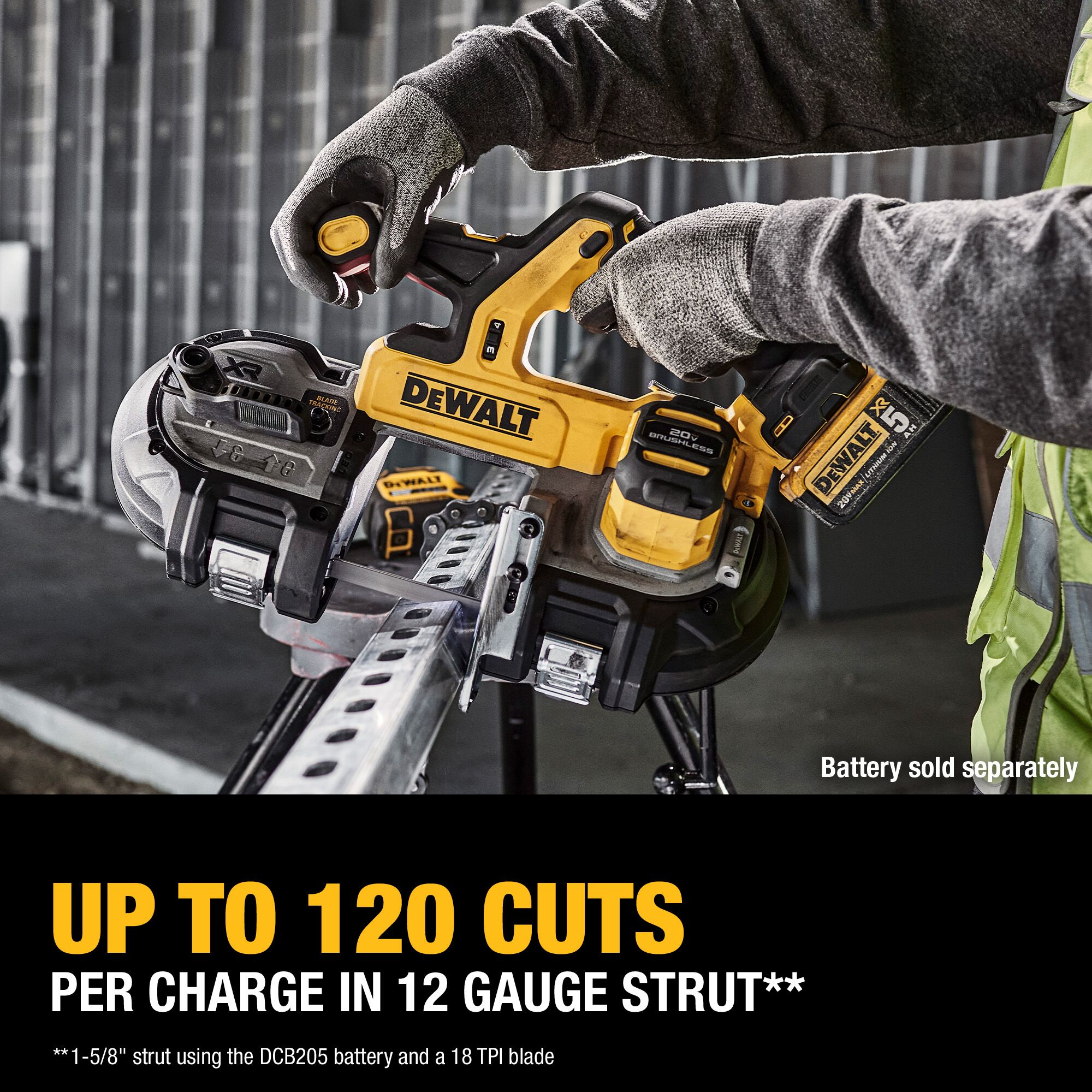 Take on tough cutting needs with the 20V MAX* XR® Brushless Cordless Dual-Trigger Bandsaw. Featuring a secondary trigger on the auxiliary handle for added control on the foregrip that helps ensure proper operation and a brushless motor that delivers 535 MWO at 570 SFPM. This dual-trigger bandsaw is designed to deliver quick and efficient performance; it gets up to 120 cuts per charge through 12 gauge strut**. This bandsaw cuts 12 gauge strut as fast as 5.1 seconds**. Finish the job effectively with this XR® tool equipped with a large 3-3/8 in. cut capacity suitable for a wide range of bandsaw applications. (Battery and charger sold separately.)