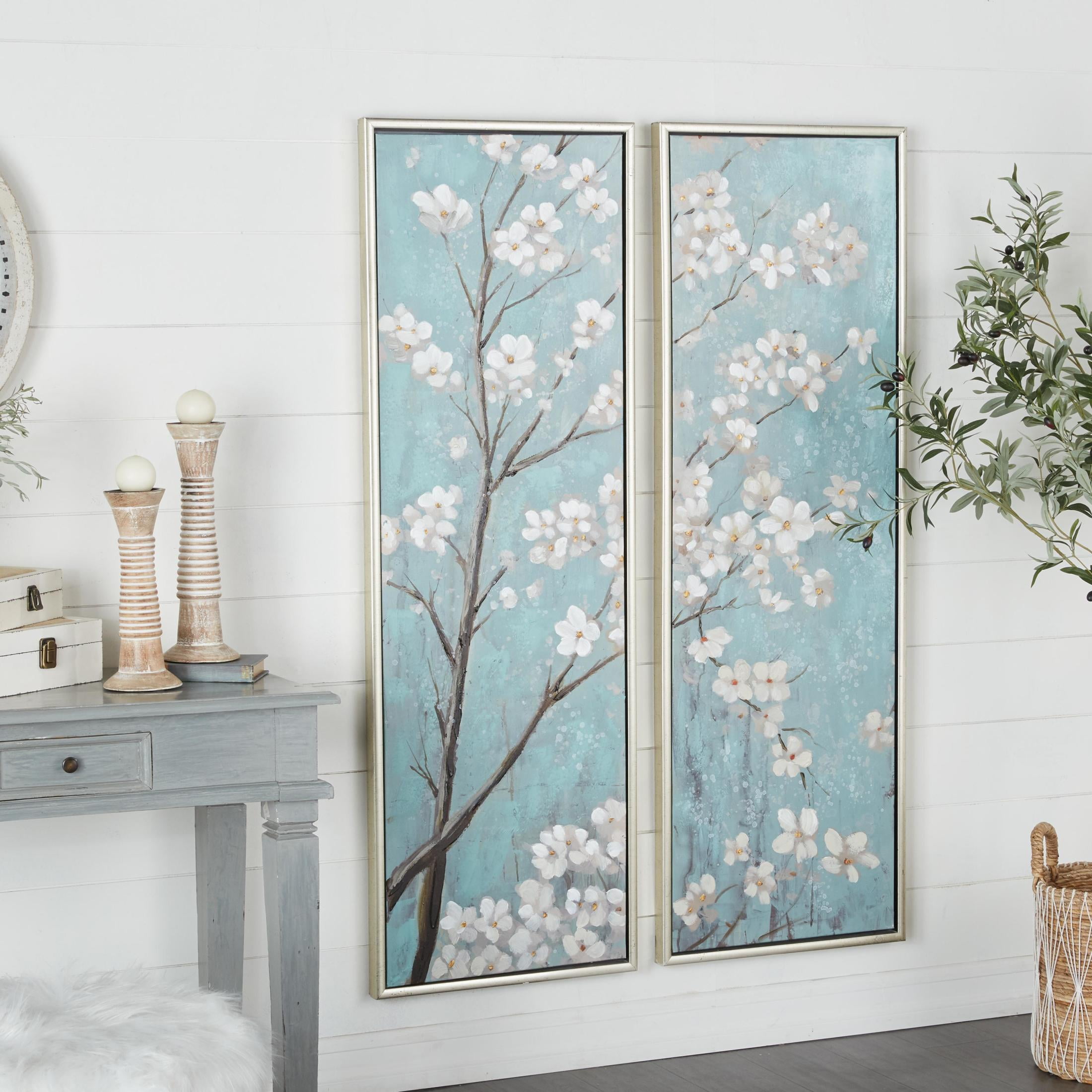 Designed with timeless sophistication, rich old-world textures and warm hues come together for a refined classic taste of luxury This teal living room framed wall art set is crafted from polystone, fir wood, and canvas materials This rectangle decorative framed wall art set highlights a textured finish with a blue background with white and dark brown flowers in a silver frame The canvas set of 2 framed wall arts features stylish paintings of cherry blossoms divided into two panels within silver frames Each teal canvas framed wall art measures 20L x 1.50W x 59H inches, and weighs 6.58 lbs The textured teal wall framed art accentuates vertical rectangular shapes adorned with intricate cherry blossom patterns and details Wipe clean with a dry cloth The traditional set of 2 framed canvas art is crafted with floral paintings on a canvas that is encased in a fir frame Traditional style 20″ x 59″ Cherry Blossom Floral Framed Wall Art with Silver Frame, by DecMode (2 Count) makes a perfect addition to any home