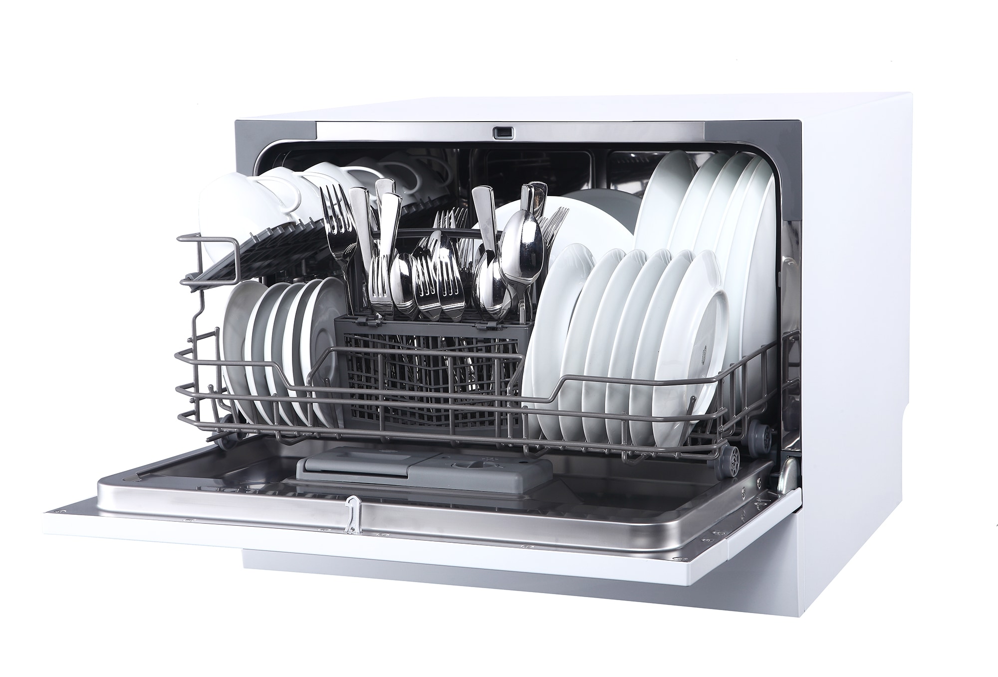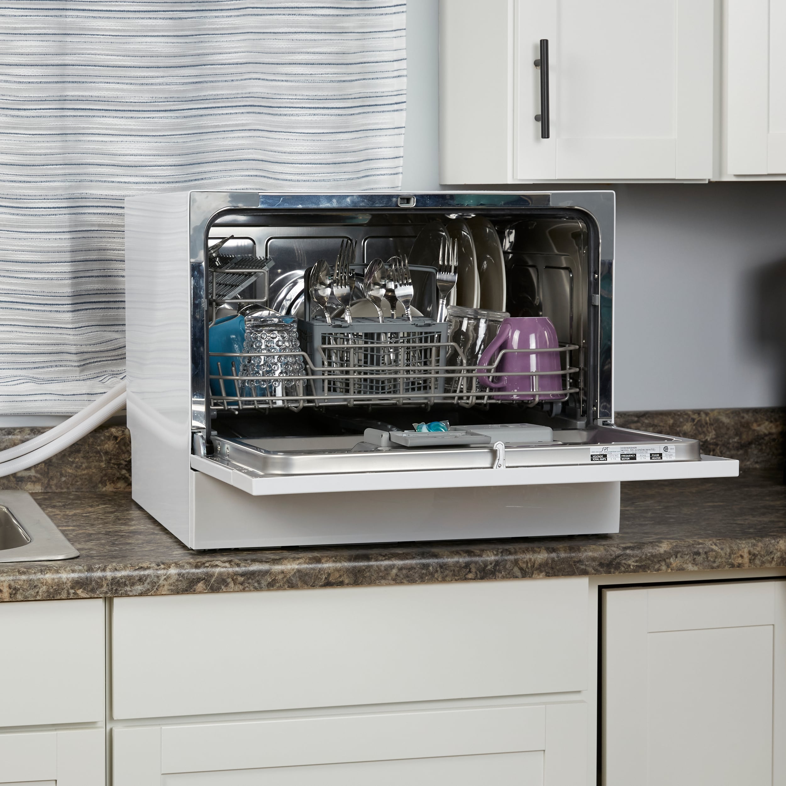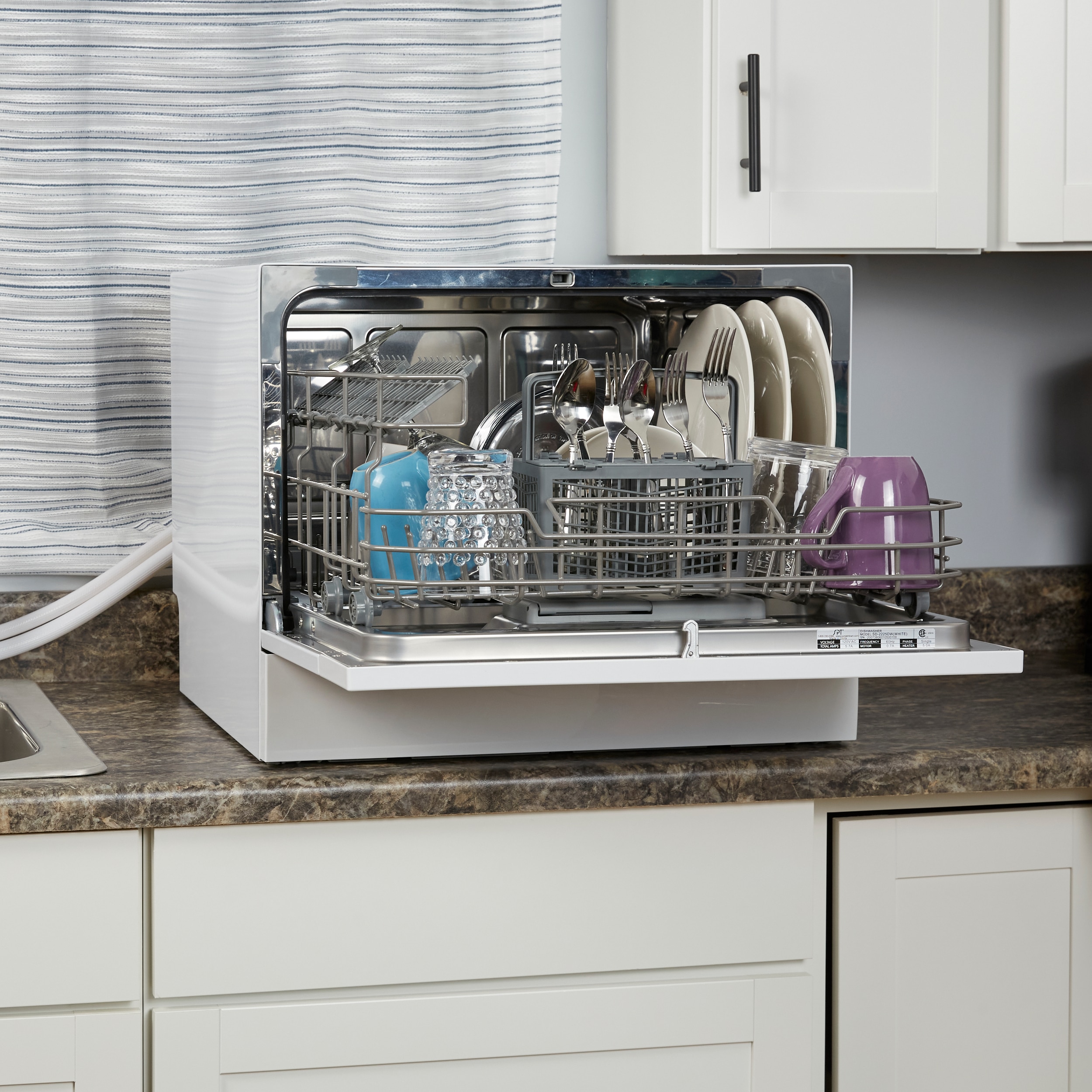 Perfect for apartments, office kitchens or any small-sized kitchens; offers full-size power in a compact design. With a height of only 17.24 inches, this unit will fit between most countertop and cabinetry. Spacious cavity loads up to six standard place settings. Features automatic detergent and rinse-aid dispenser. Quick connect to most kitchen faucets eliminates the need for direct plumbing or permanent installation. NOTE: Depth of dishwasher with door fully open is 31.8 inches.