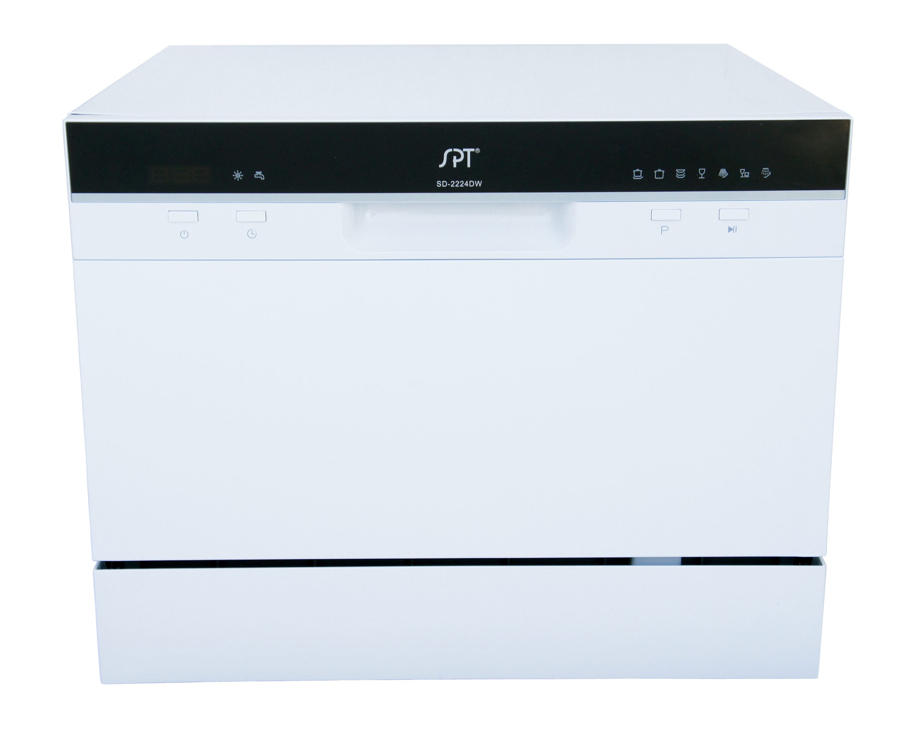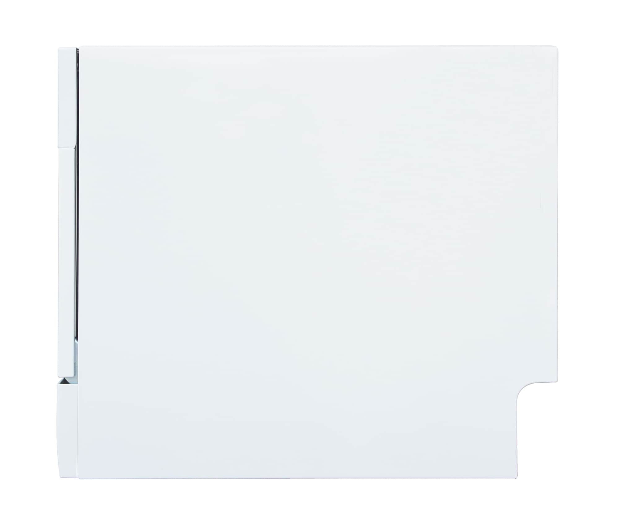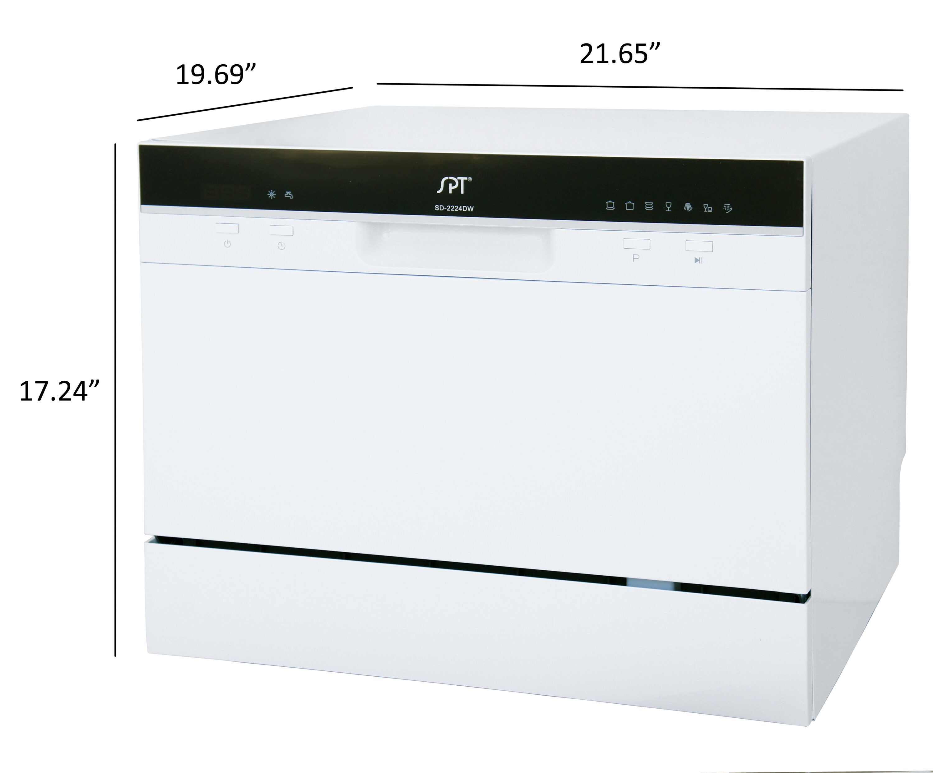 Perfect for apartments, office kitchens or any small-sized kitchens; offers full-size power in a compact design. With a height of only 17.24 inches, this unit will fit between most countertop and cabinetry. Spacious cavity loads up to six standard place settings. Features automatic detergent and rinse-aid dispenser. Quick connect to most kitchen faucets eliminates the need for direct plumbing or permanent installation. NOTE: Depth of dishwasher with door fully open is 31.8 inches.