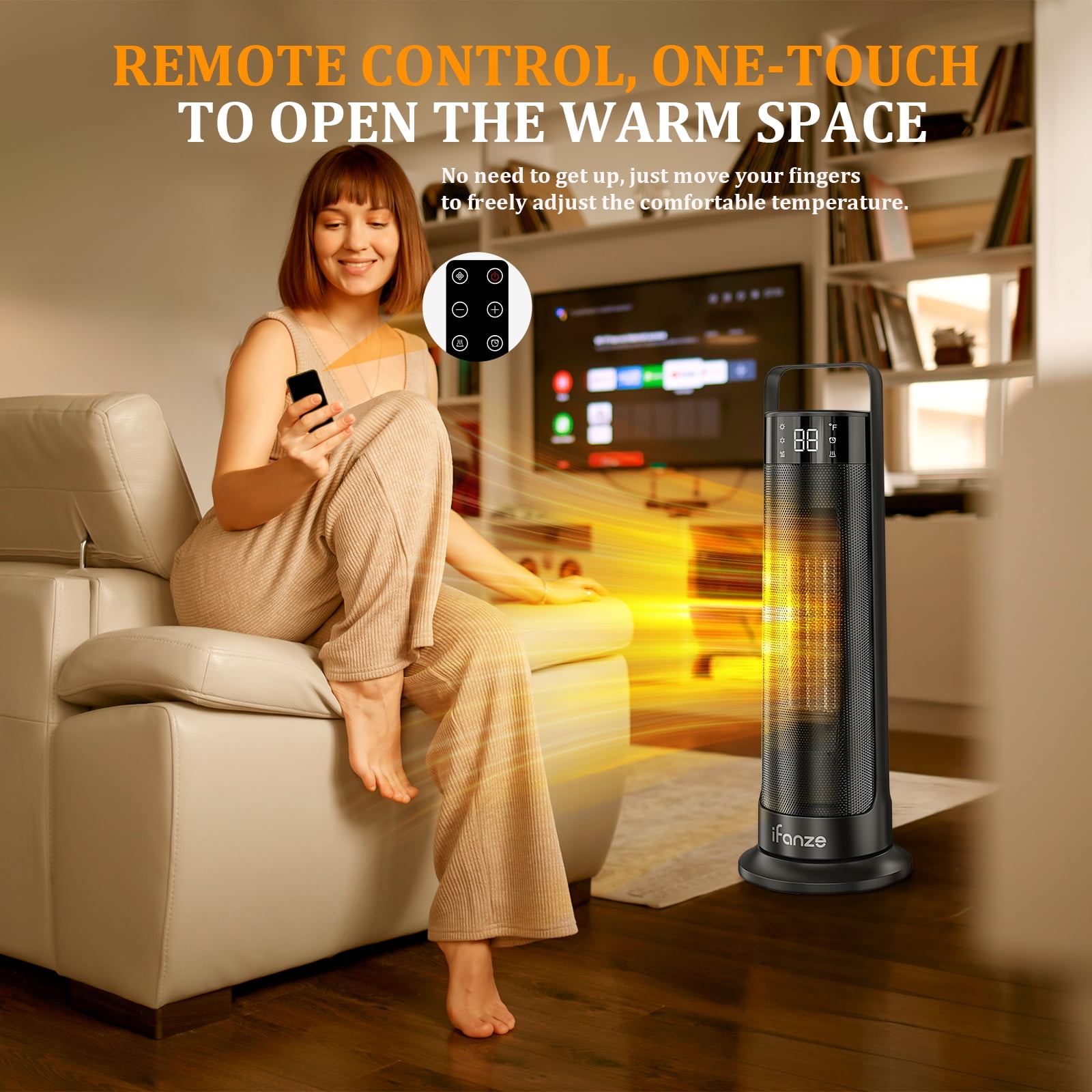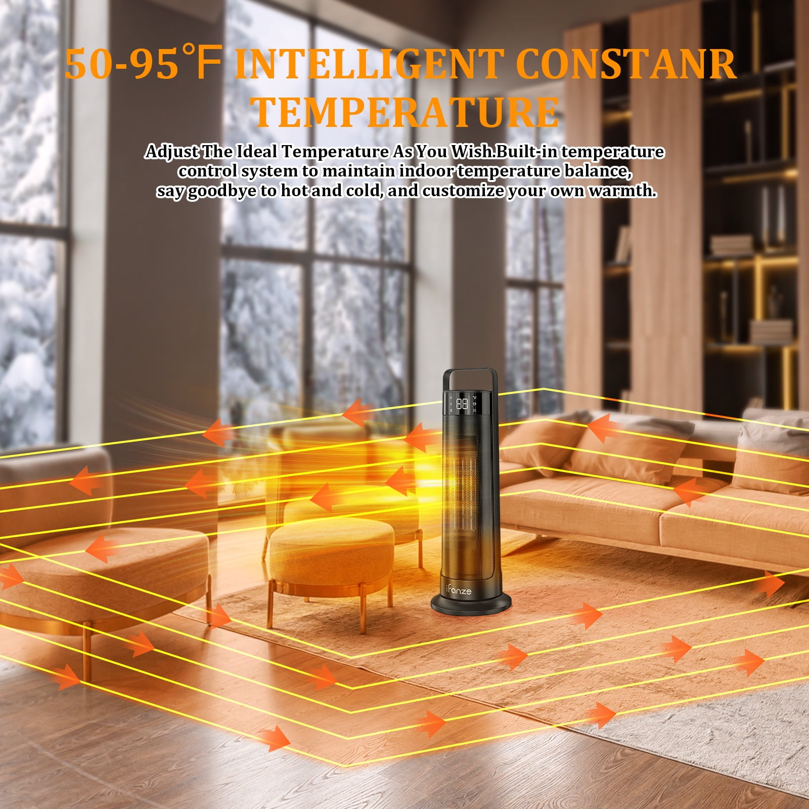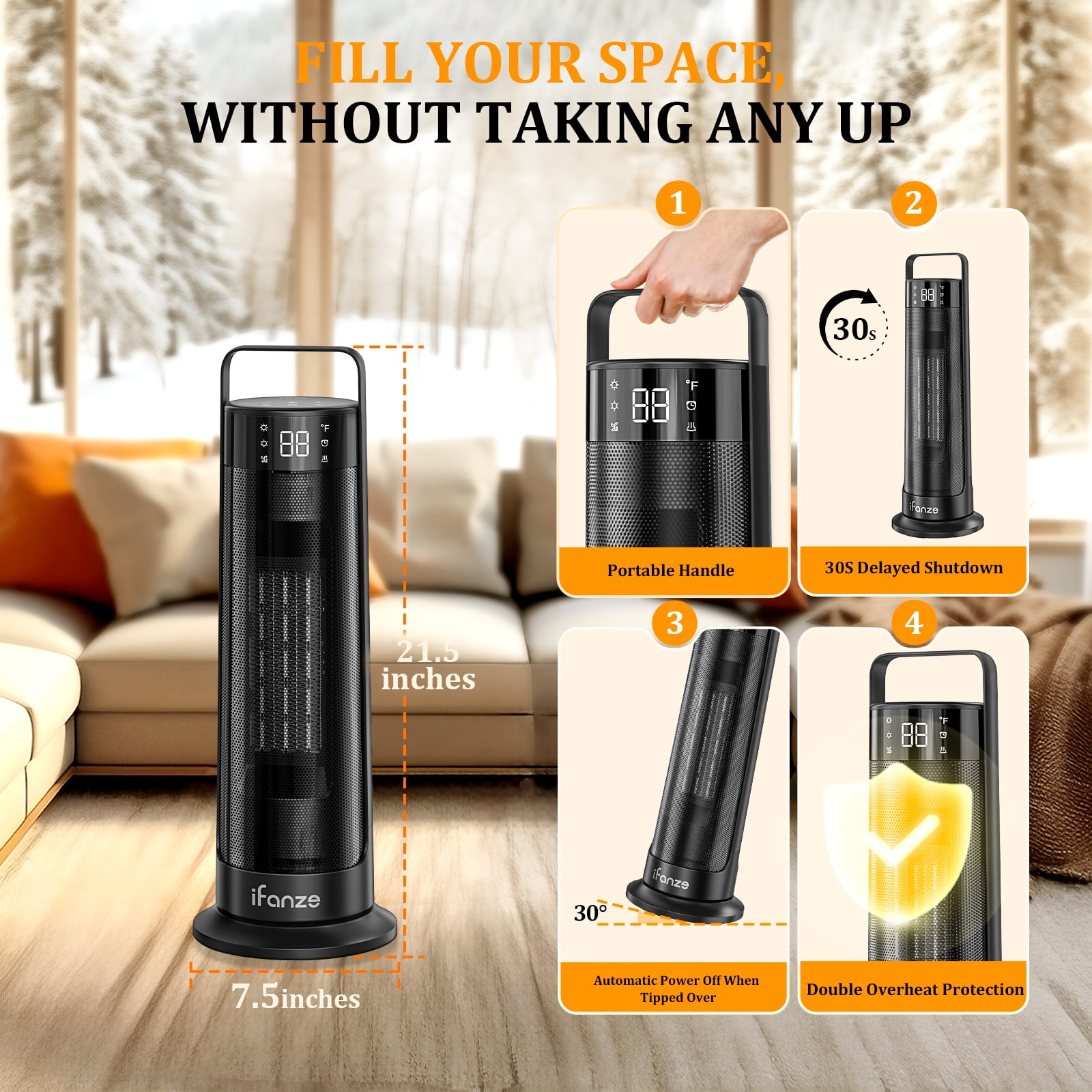 Rapid And Potent Warmth Prepare for the cold months with your perfect ally — Our-warming room heater for maintaining cozy temperatures. An indoor space heater, enhanced with a robust DC motor and 1500W PTC heating innovation, warms rooms in 3 seconds, beats winter blues. The quiet ceramic heater operates at a sound level below <40db, ensuring peaceful sleep. Always At The Perfect Temperature This electric heater with Thermostat allows you to set your desired heat level within a wide range of 50-95℉ with ±1℉ increments, ensuring precise and efficient heating. This feature not only keeps you comfortable but also helps save energy. 1-12h timer automatically stops the heater, saving more energy. Just set it and focus on your own matters without worries. Total Control At Your Fingertips Take charge of your comfort with the user-friendly operation of our 21" space heater. Whether you prefer the ease of the backlit display or the convenience of the included remote control, you have the power to customize your heating experience. The clearly labeled buttons allow you to easily set the desired temperature, activate the 1-12h timer, choose the 3 modes, engage the oscillation, or power the space heater on and off. With intuitive controls, you can personalize your heating settings with ease. Enjoy Cozy Comfort In Every Corner With its 50-degree oscillation feature, this heater ensures wide coverage throughout the room, spreading warmth to every corner. Experience cozy comfort no matter where you are, as the oscillation helps distribute heat evenly and efficiently. Stay warm and snug without any cold spots, thanks to the wide-reaching warmth of this versatile heater. 3 Modes And Convenient Carry Handle Cold( fan mode) and warm(low heat and high heat) air supply, suitable for all seasons. LED smart touch screen, three modes to switch freely, adjust the appropriate temperature, decide yourself warmth. The convenient carrying handle brings much comfort for you to carry this 21" lightweight heater from one room to another. Great for quickly heating small to large rooms including office, bedroom, living room, baby room, basement, and garage on cold days. Warm Tips: There is 15 seconds countdown delay after it is turned off because the fan keep working for a while to dissipate heat, for extending life of your heater. What‘s In The Box 1x User Manual 1x PTC Ceramic Space Heater 1x Remote Control ( 2 AAA Batteries not included )