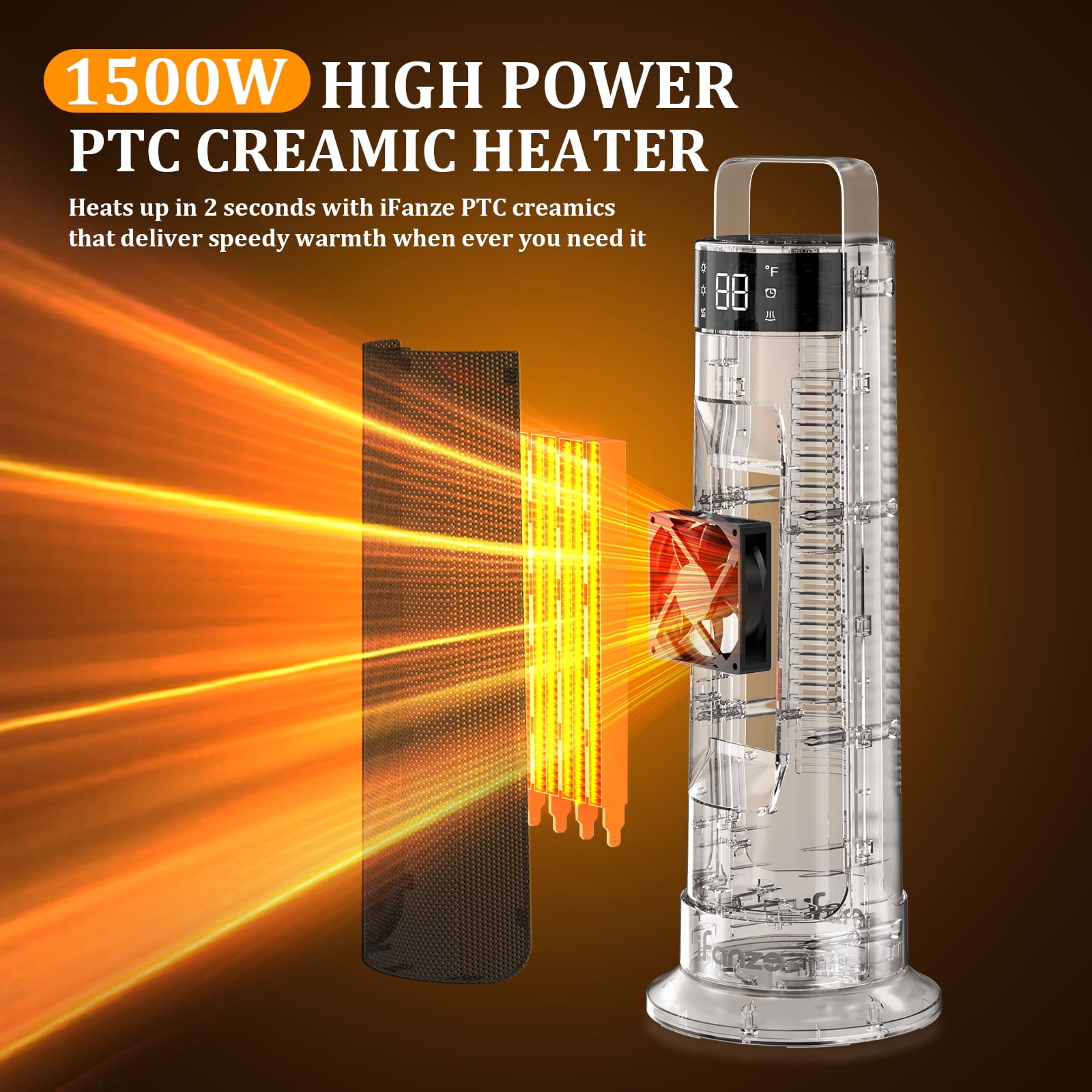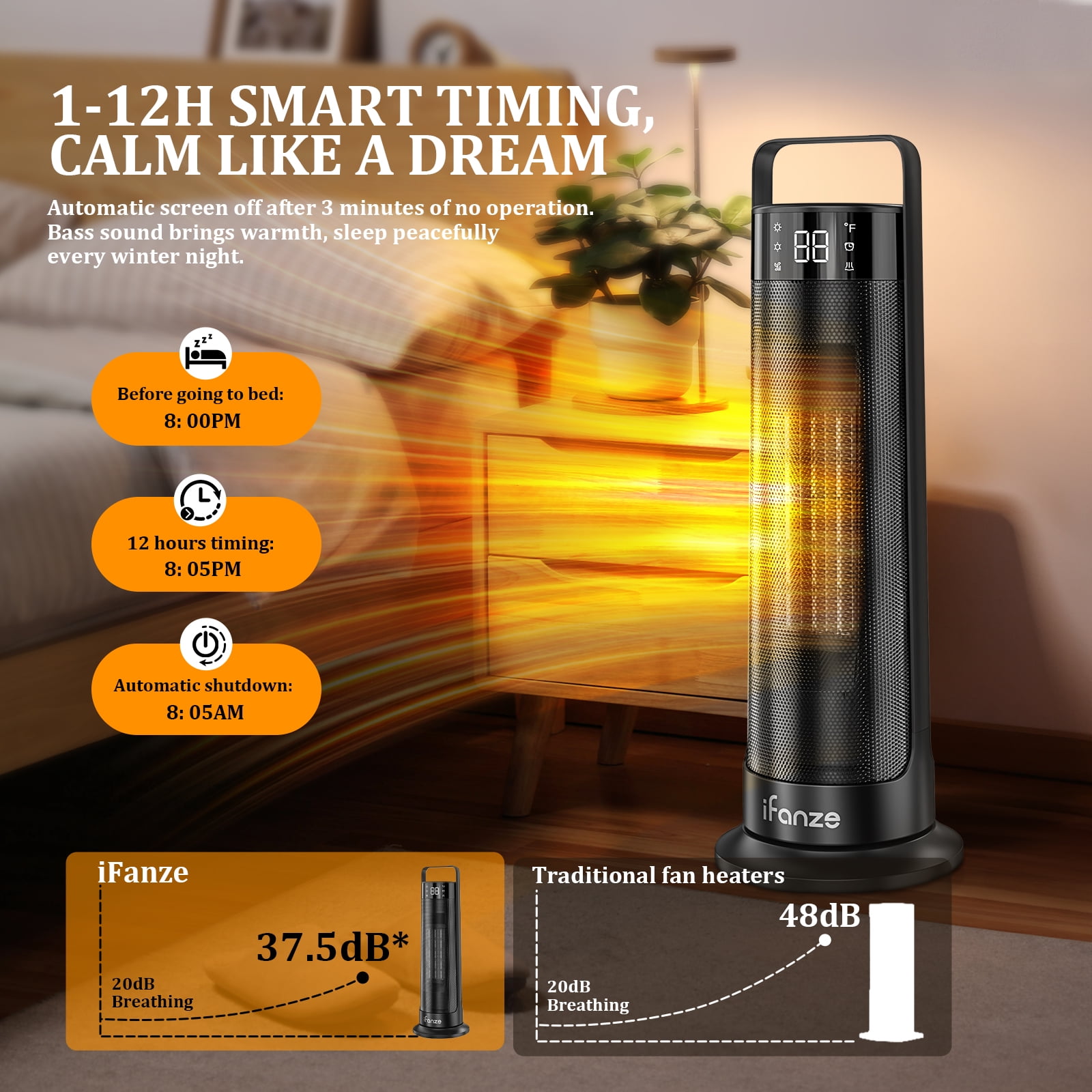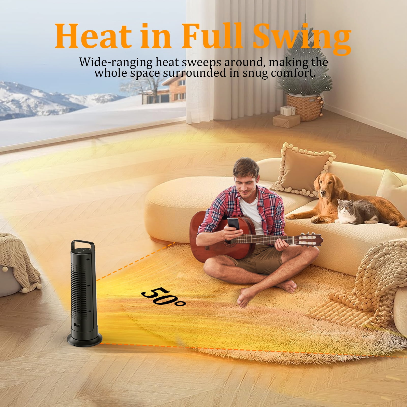 Rapid And Potent Warmth Prepare for the cold months with your perfect ally — Our-warming room heater for maintaining cozy temperatures. An indoor space heater, enhanced with a robust DC motor and 1500W PTC heating innovation, warms rooms in 3 seconds, beats winter blues. The quiet ceramic heater operates at a sound level below <40db, ensuring peaceful sleep. Always At The Perfect Temperature This electric heater with Thermostat allows you to set your desired heat level within a wide range of 50-95℉ with ±1℉ increments, ensuring precise and efficient heating. This feature not only keeps you comfortable but also helps save energy. 1-12h timer automatically stops the heater, saving more energy. Just set it and focus on your own matters without worries. Total Control At Your Fingertips Take charge of your comfort with the user-friendly operation of our 21" space heater. Whether you prefer the ease of the backlit display or the convenience of the included remote control, you have the power to customize your heating experience. The clearly labeled buttons allow you to easily set the desired temperature, activate the 1-12h timer, choose the 3 modes, engage the oscillation, or power the space heater on and off. With intuitive controls, you can personalize your heating settings with ease. Enjoy Cozy Comfort In Every Corner With its 50-degree oscillation feature, this heater ensures wide coverage throughout the room, spreading warmth to every corner. Experience cozy comfort no matter where you are, as the oscillation helps distribute heat evenly and efficiently. Stay warm and snug without any cold spots, thanks to the wide-reaching warmth of this versatile heater. 3 Modes And Convenient Carry Handle Cold( fan mode) and warm(low heat and high heat) air supply, suitable for all seasons. LED smart touch screen, three modes to switch freely, adjust the appropriate temperature, decide yourself warmth. The convenient carrying handle brings much comfort for you to carry this 21" lightweight heater from one room to another. Great for quickly heating small to large rooms including office, bedroom, living room, baby room, basement, and garage on cold days. Warm Tips: There is 15 seconds countdown delay after it is turned off because the fan keep working for a while to dissipate heat, for extending life of your heater. What‘s In The Box 1x User Manual 1x PTC Ceramic Space Heater 1x Remote Control ( 2 AAA Batteries not included )