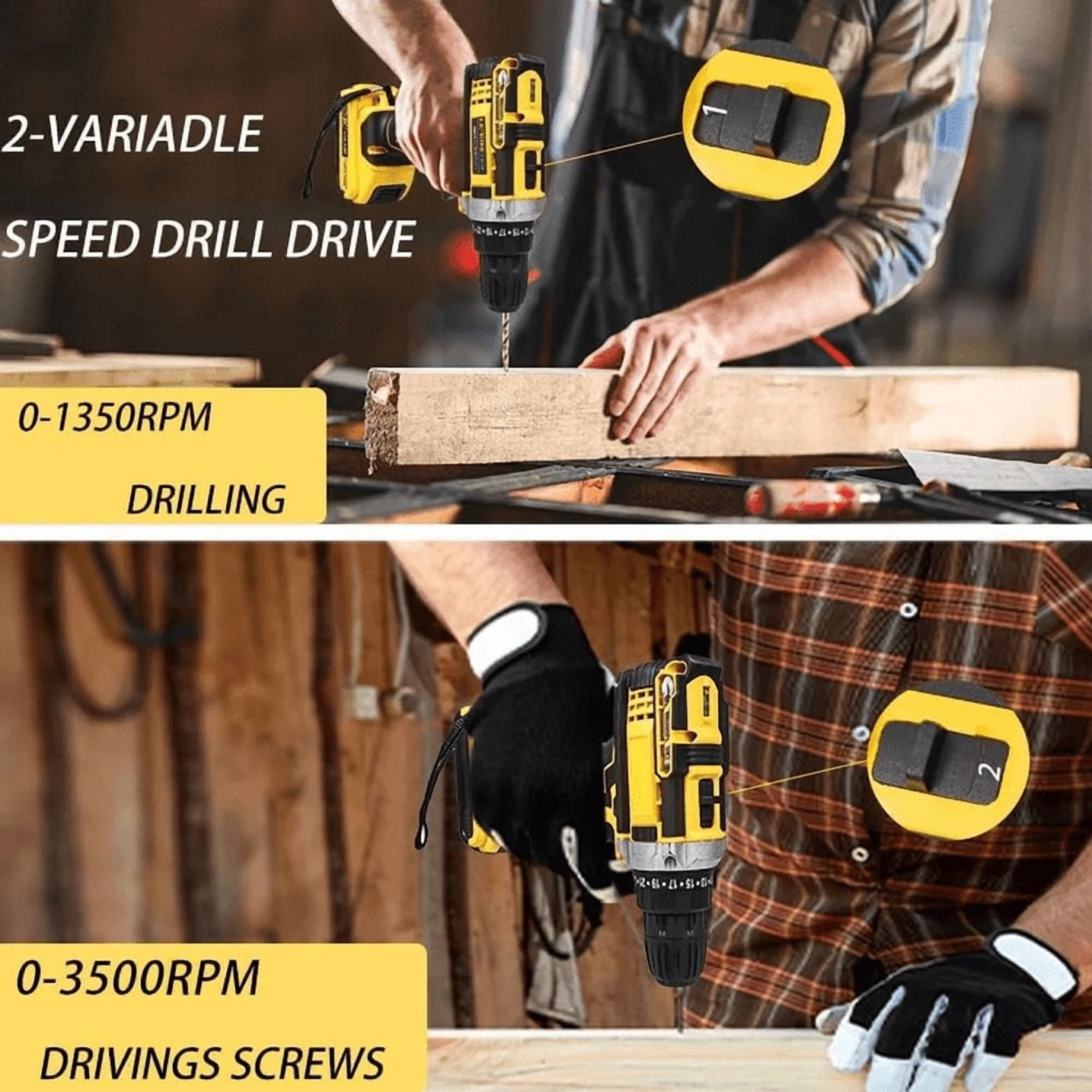 3/8√¢¬Ä¬ô√¢¬Ä¬ô Auto Chuck, 25+3 Clutch & 2-Variable Speed Cordless drill set with a large 3/8″ (10mm) keyless chuck for superior bit retention Features a 3-in-1 working mode (Screw Driver, Drill, and Impact Hammer) and variable speeds (0-450RPM, 0-1500RPM) for enhanced performance Powerful Robust Motor, Max 398 IN-LB for Versatile Use Equipped with an all-copper double-bearing gear motor, this high-performance drill delivers strong and steady power with a maximum torque of 398 IN-LB (45NM), suitable for various projects including screwing and drilling in metal or wood 20Ah Batteries & 1H Fast Charger