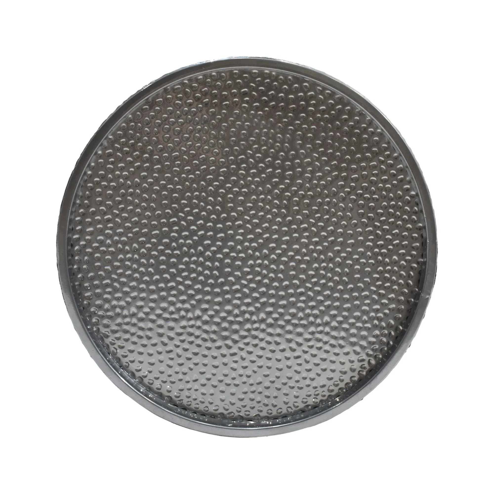 Silver contemporary hammered surface accent table Convenient table lip with textured finish and a metallic sheen Iron frame welded together to form a cylindrical silhouette Comes with handcrafted details; recommended for indoor use Table measures 22.25 inches high by 16 inches in diameter