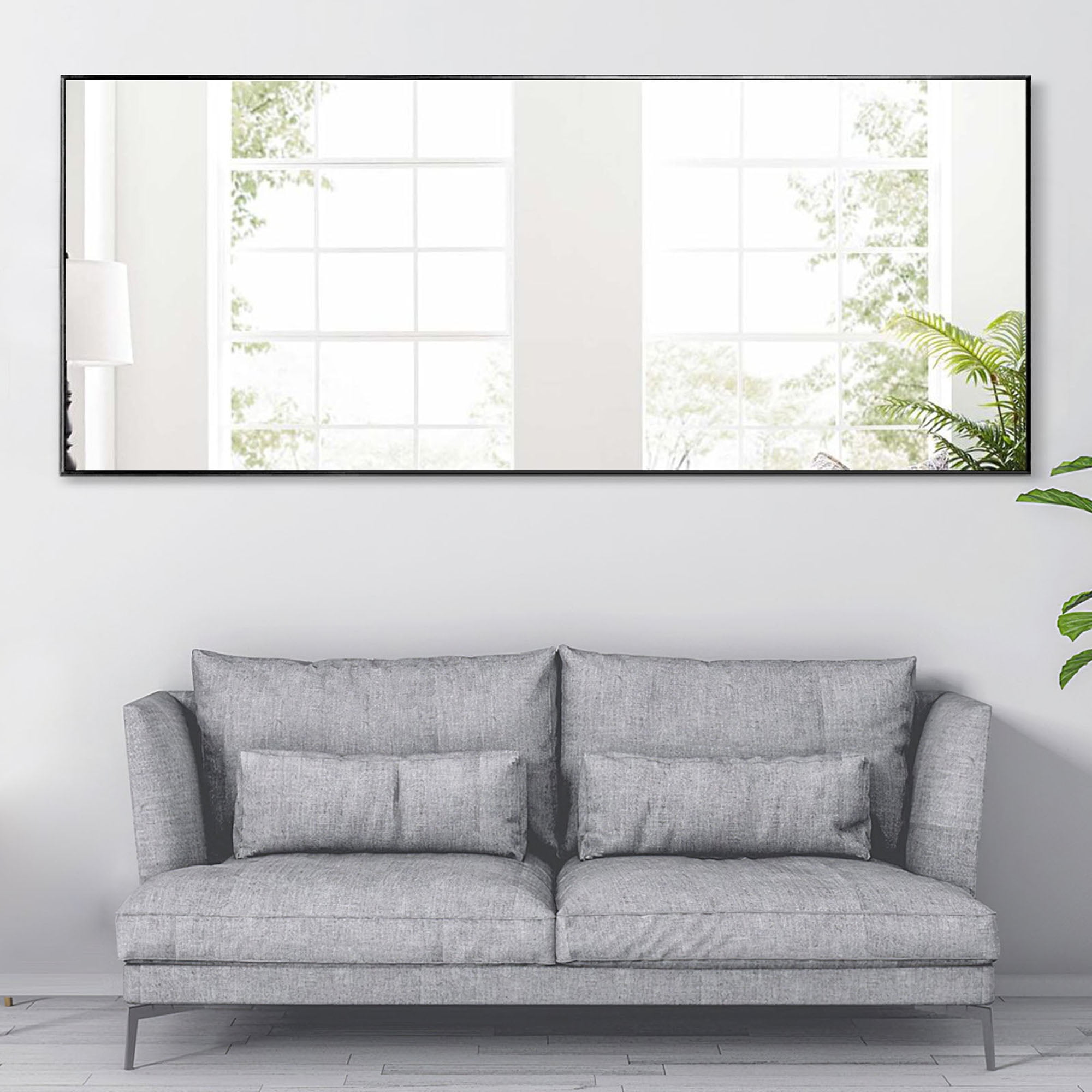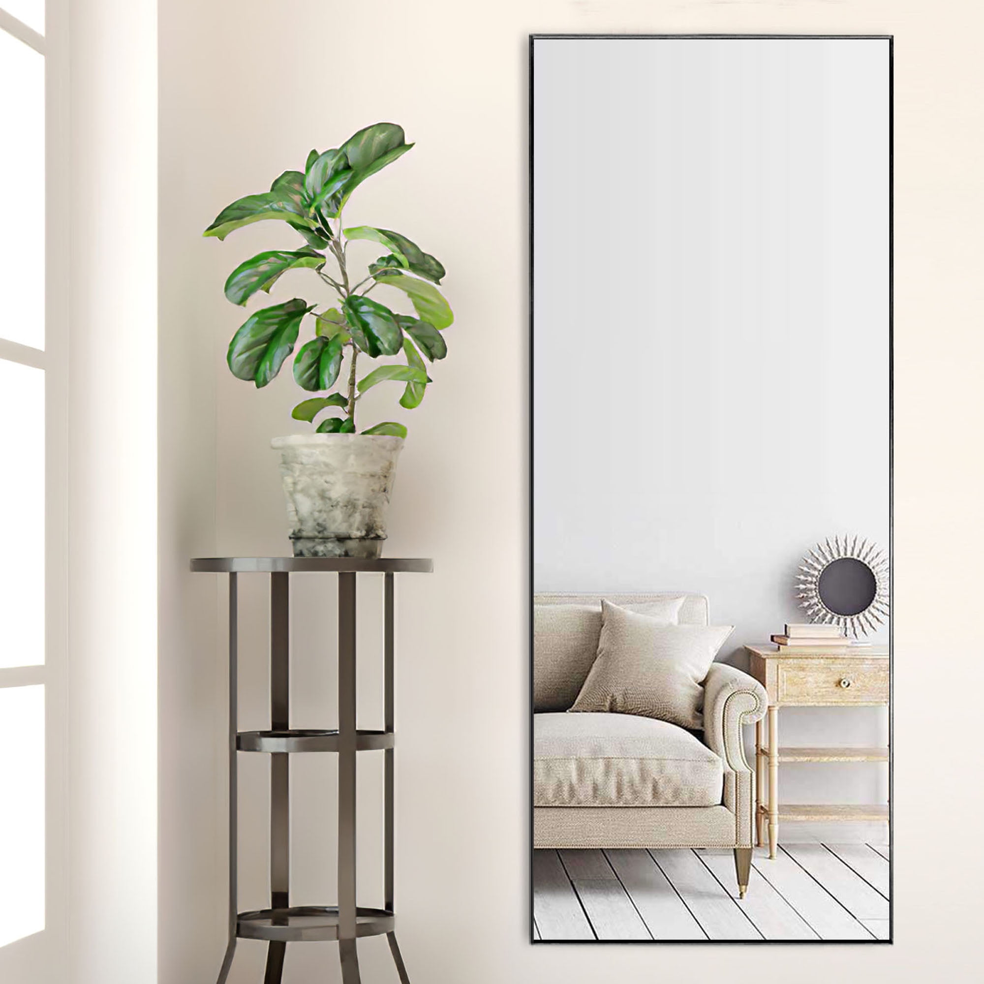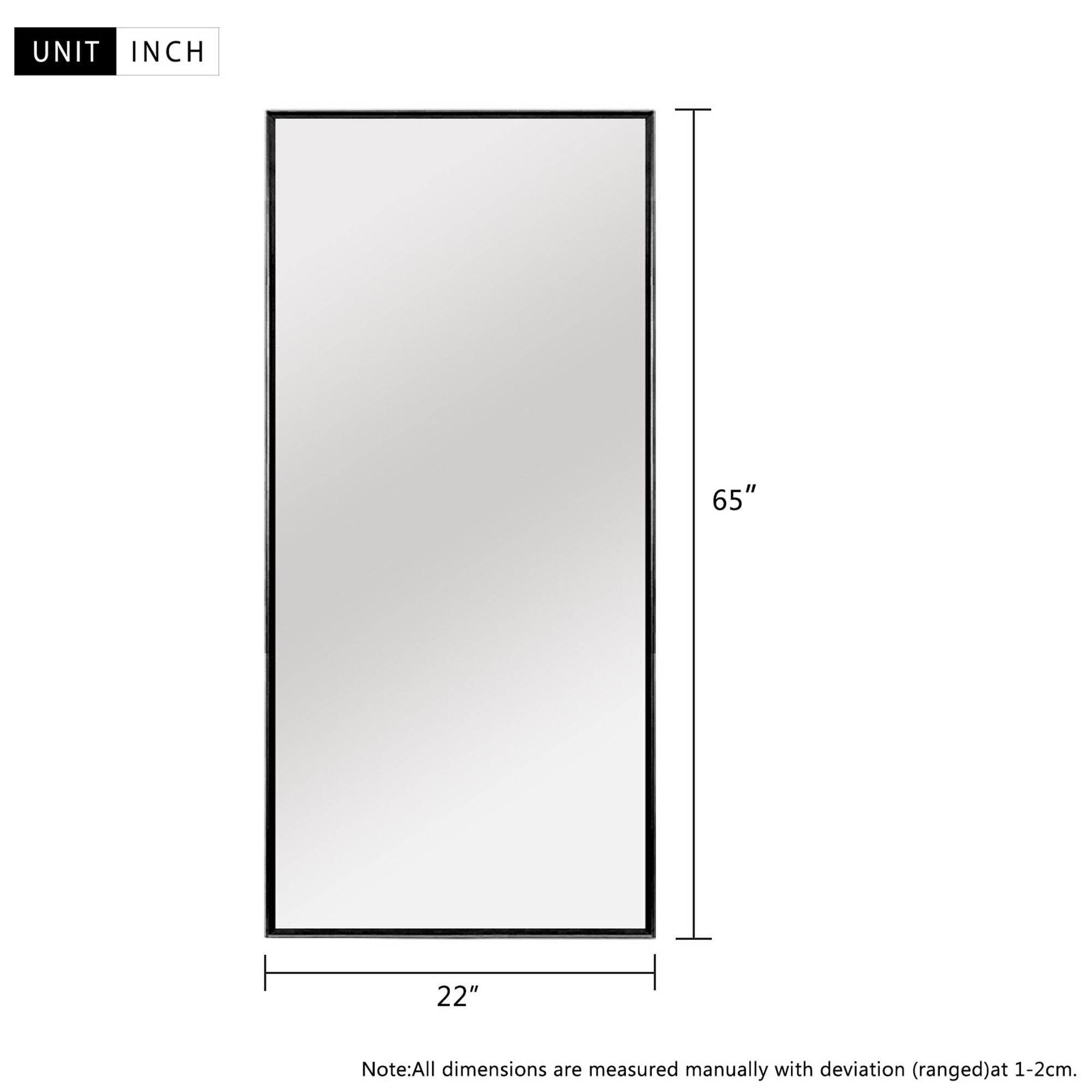 MIRROR SIZE: Height: 64in, Length: 22in. Perfect size to place it in bedrooms, bathrooms, living rooms, and entryways. EXQUISITE WORKMANSHIP: The full body mirror is made of high-quality aluminum alloy frame, which is durable and has a shiny appearance. The sides of the floor mirror are smooth. We have added an explosion-proof membrane to prevent the mirror from being broken and hurting people. We use multiple packing materials to pack the floor mirror to protect the mirror. EASY TO INSTALL: The floor mirror has a bracket and just easily pull out the stand in seconds to use it. If you want to hang it on the wall, we have attached an installation manual in the box, and you can install it easily according to the installation instructions. HD Imaging: The floor mirror glass is high-definition and is clear with great reflective value with no distortion. The full length mirror uses high definition imaging to truly restore and reflect the real world. High transparency glass and quality silver coating will also give you a good image on top. Designed with simplicity and precision, rectangle frame, clean and sleek surface, aesthetic styling, with tight black alloy frame, perfect for both vintage and modern style environments. MULTIPLE PLACEMENT METHODS: The full length mirror is with a stand and can stand everywhere. The floor mirror can be leaned against the wall anywhere. The mirror can be hung on the wall horizontally or vertically as a wall mounted mirror.