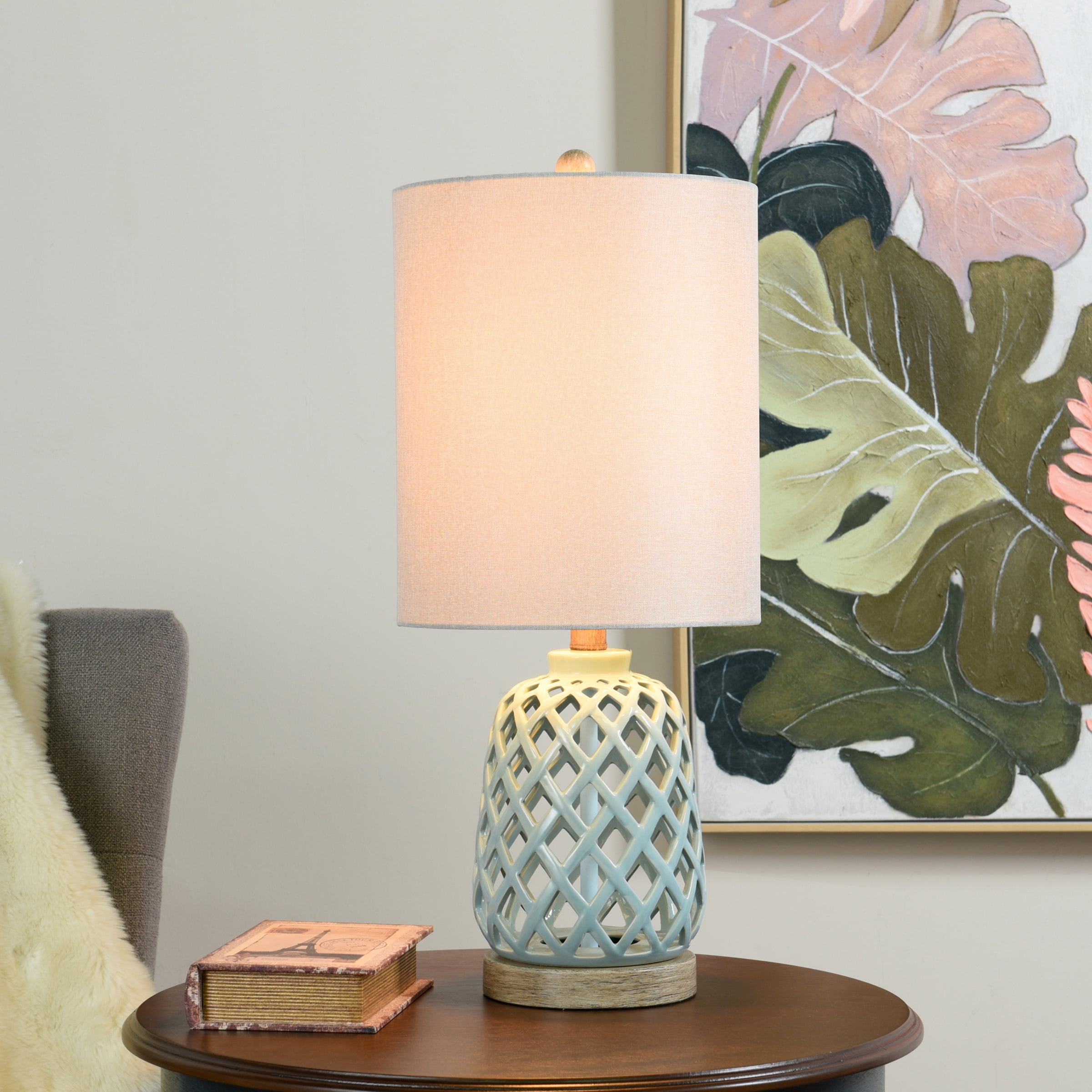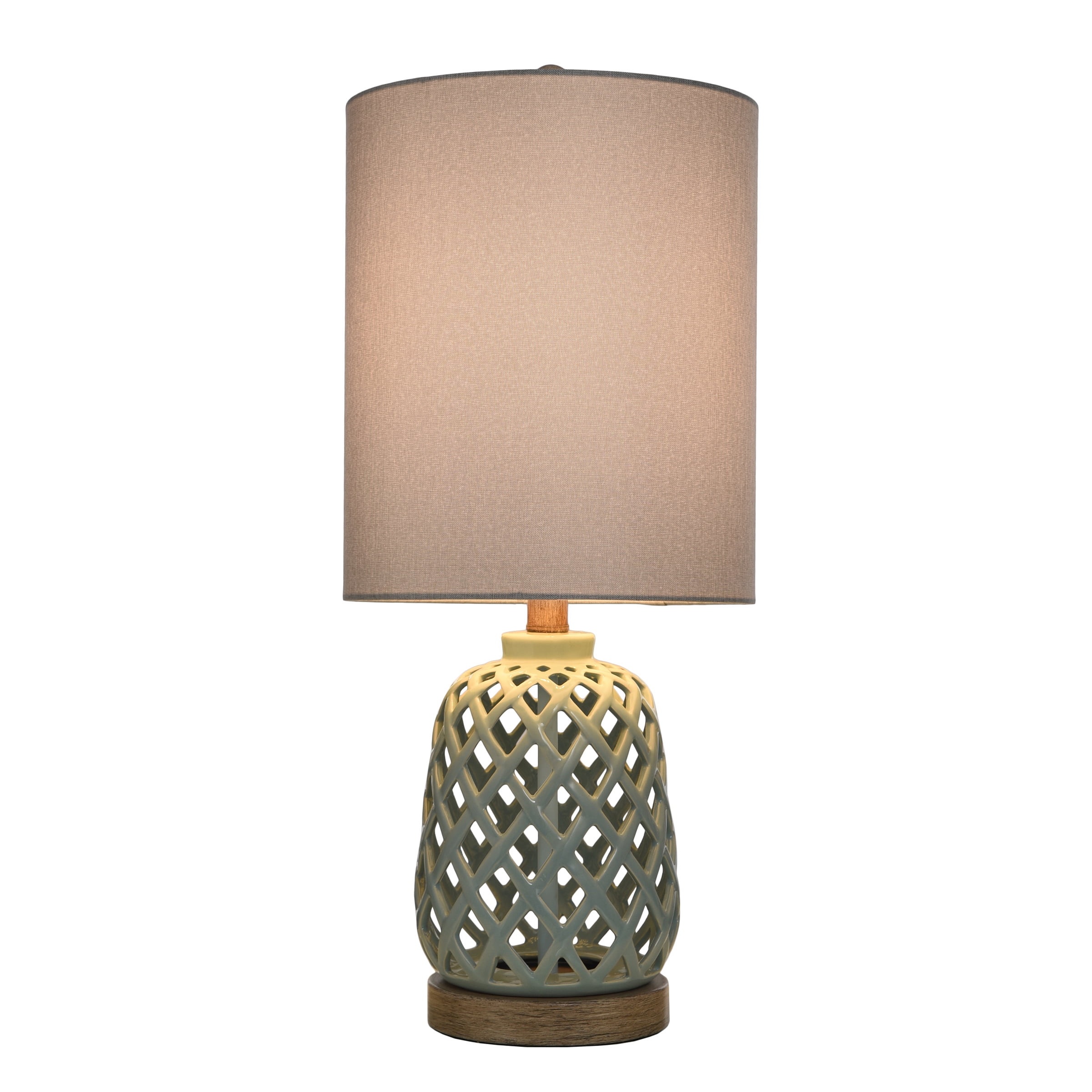 A cool new take on a vintage style, this ceramic table lamp is finished in a soft blue for a standout quality that’s equally easy to match. Made to meet exacting artisan standards, this lamp is designed with an open lattice body and fabric hardback shade in white. It’s a bold selection for bringing life to tabletops throughout your mid-century inspired decor.