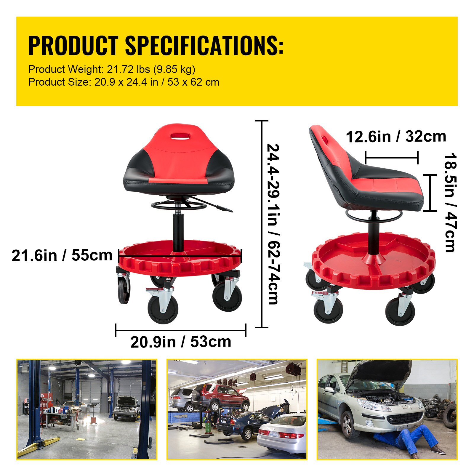 Discover ultimate comfort and flexibility with the SVOPES rolling garage stool; Built to support up to 300 LBS, this durable stool features an ergonomically designed seat cushion (18.5″) for long-lasting comfort during your workshop tasks; The height-adjustable pneumatic system (from 18″ to 23″) ensures you can easily find your preferred working position, making it ideal for different projects; Stay organized with the included storage tray, which holds tools and accessories within easy reach; Large 5″ casters make mobility a breeze, while the built-in brakes guarantee stability during your work.