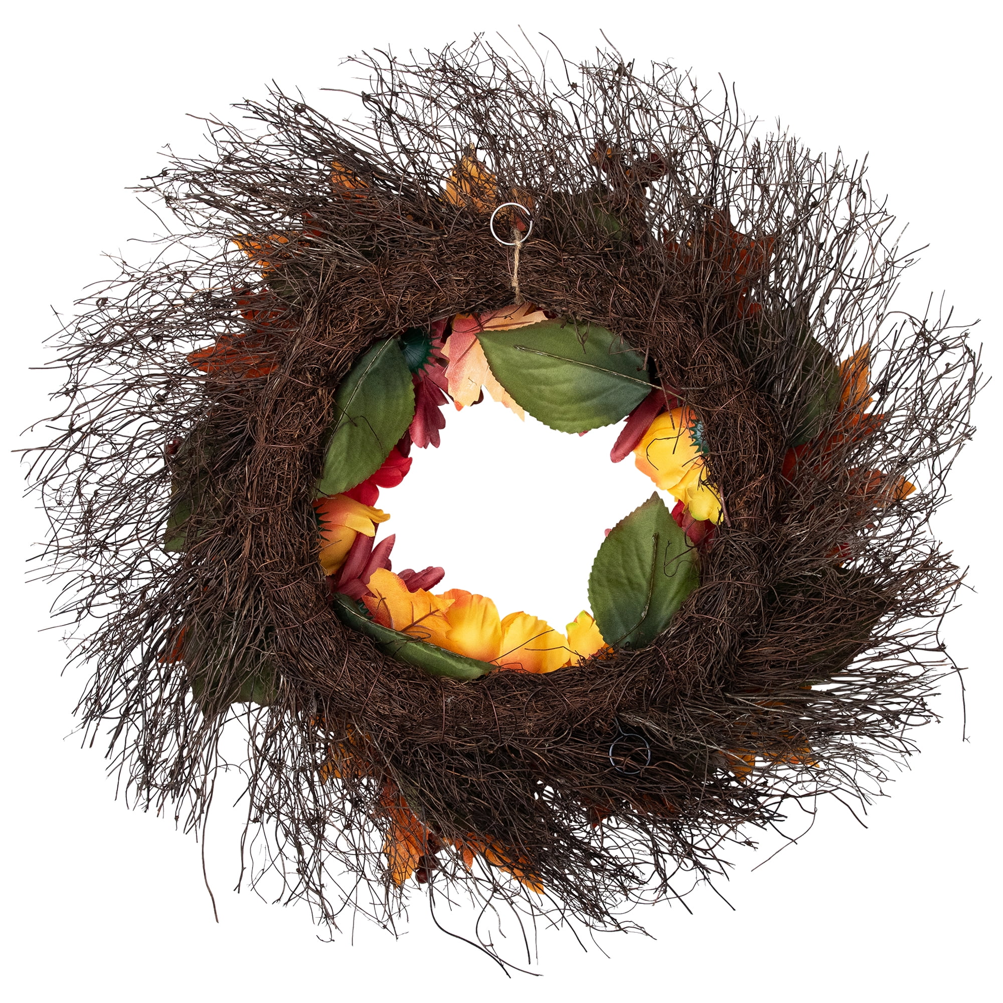 Bursting with rich orange and yellow peonies burgundy mums and hydrangea’s with feather accents this wreath is perfect for Thanksgiving or autumn harvest decorating Foliage rests atop a natural grapevine twig base for easy hanging No assembly required – wreath comes in 1 piece Recommended for indoor use – if using outdoors place under a covered area Dimensions: 24″ diameter (measured from outermost tip to outermost tip across the wreath) Material(s): grapevine/polyester/foam