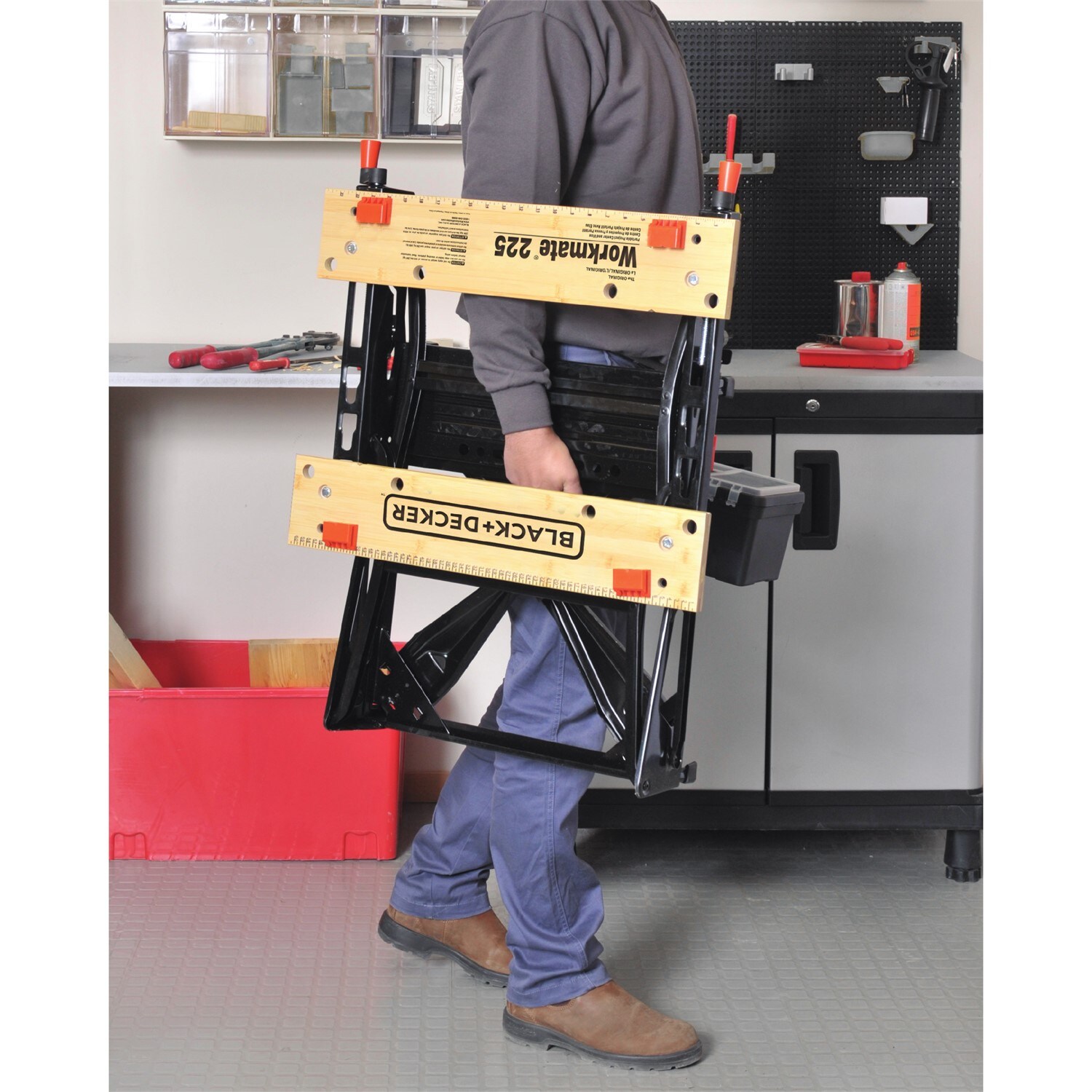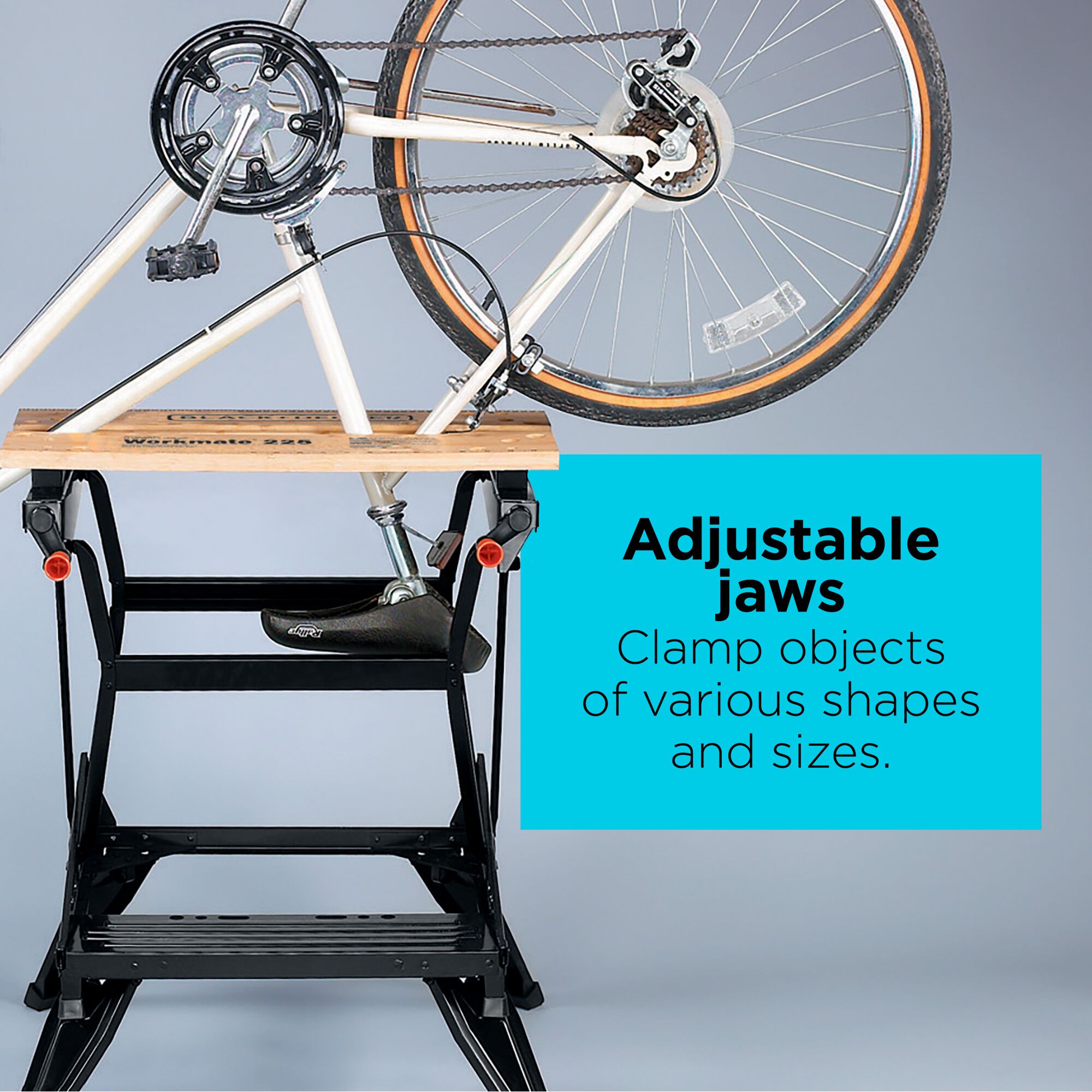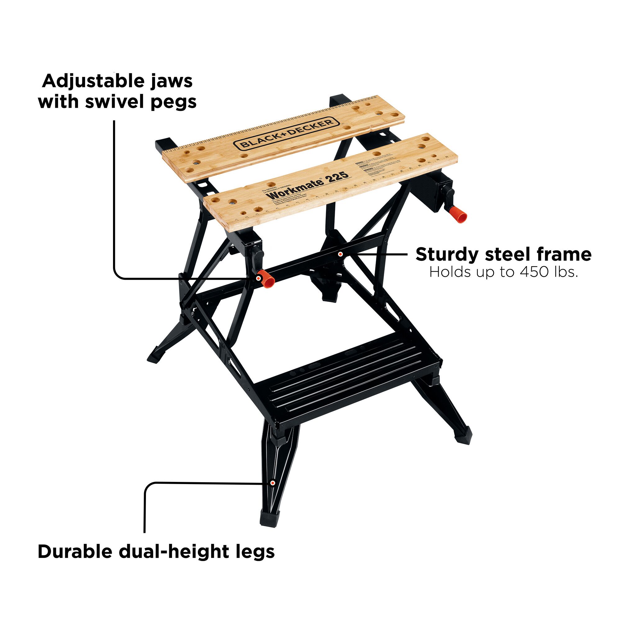 Lightweight and portable. Holds virtually anything. Folds for easy storage. Steel construction. Dual height for use as a workbench, bench tool stand, vise or sawhorse.