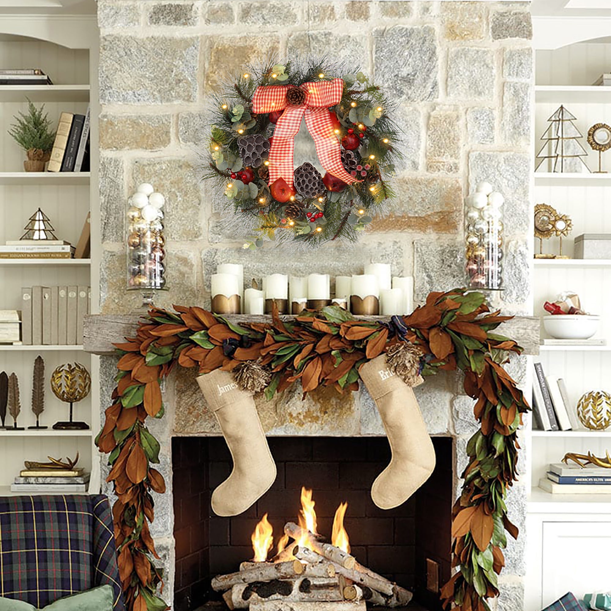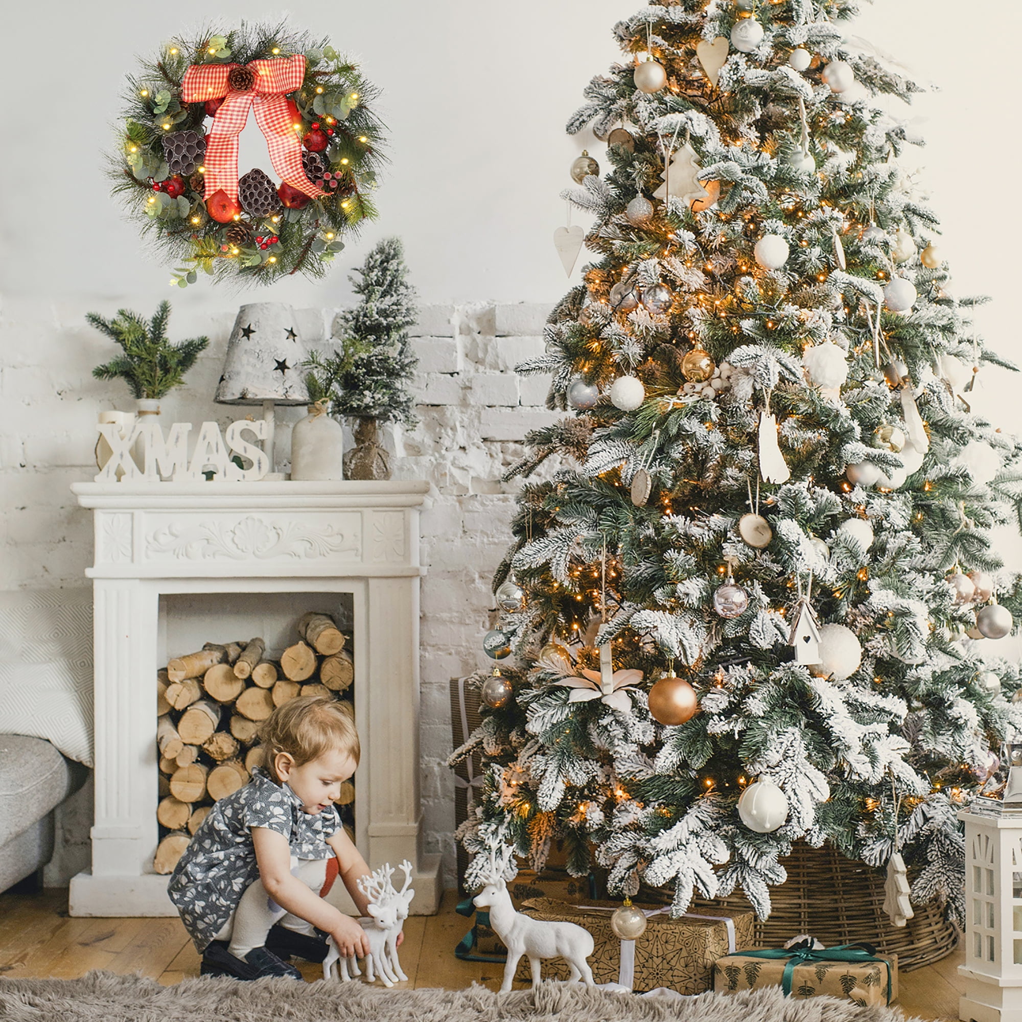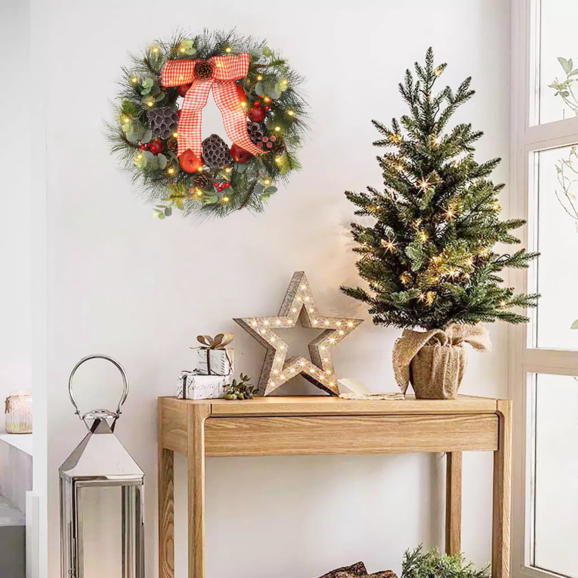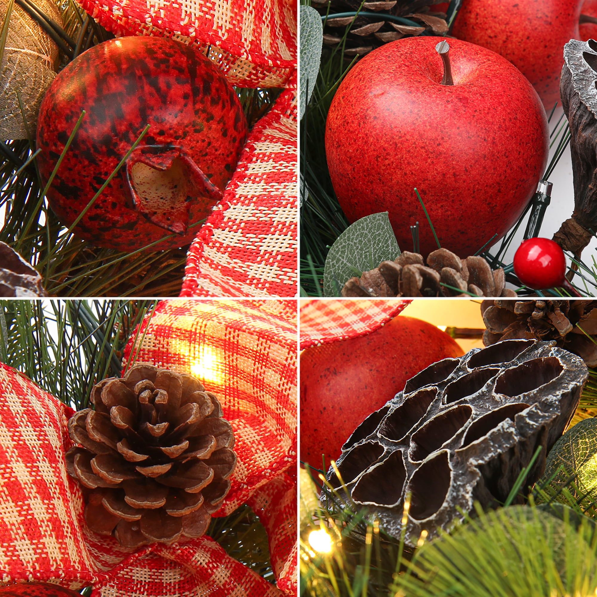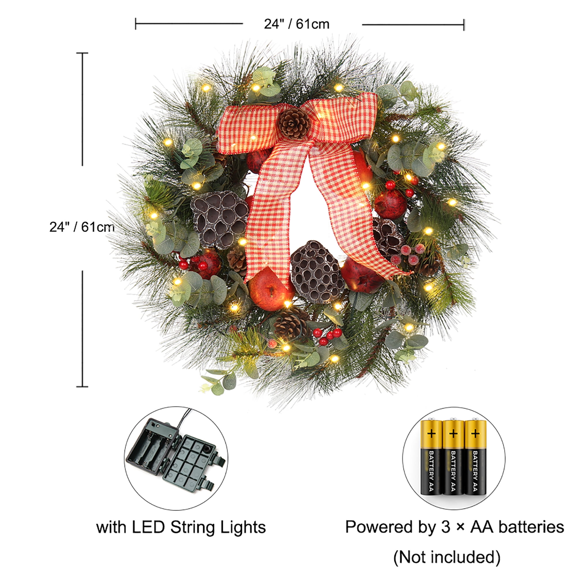 Christmas wreath with lights, big red bowknot, red balls, flowers, pine cones, green pine twigs Christmas Elements, lighted Christmas wreath looks beautiful and lifelike, prelit Christmas wreath battery operated add joy to your Christmas. Holiday wreaths make a great atmosphere to your Christmas and holiday decorations, christmas door wreaths transform your bland front door into a vibrant, attractive entryway that welcomes your closest family and friends into your home all winter long, winter wreaths are not just for Xmas. Christmas wreath decorations can be used indoors or outdoor christmas wreath, Christmas decorations are great for decorating home, shop, office, and classroom decorations. Hang Christmas door decorations above your fireplace, on your front door, on a living room wall, or as table decoration, lighted Christmas wreath outdoors. This Christmas wreath for the front door outside is a perfect gift for your friends and family, and wishes them a Merry Christmas, There christmas reef is no better way to be greeted when someone enters your home than by an exquisite display of door wreath. Large wreath measures 61cm/24 inches, each Christmas window wreath is packaged in a sturdy box for safe shipping and seasonal storage.