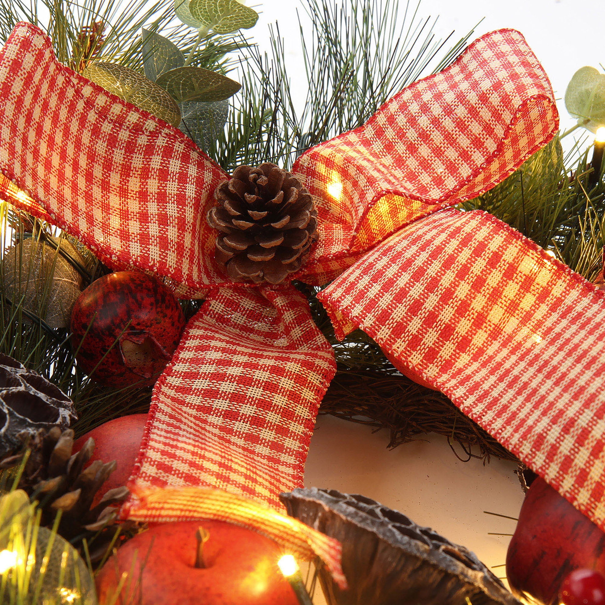 24 inch Christmas Wreath for Front Door Large Xmas Wreath with Bow Ribbon Ornament Pinecone Red Berries Battery LED Lights