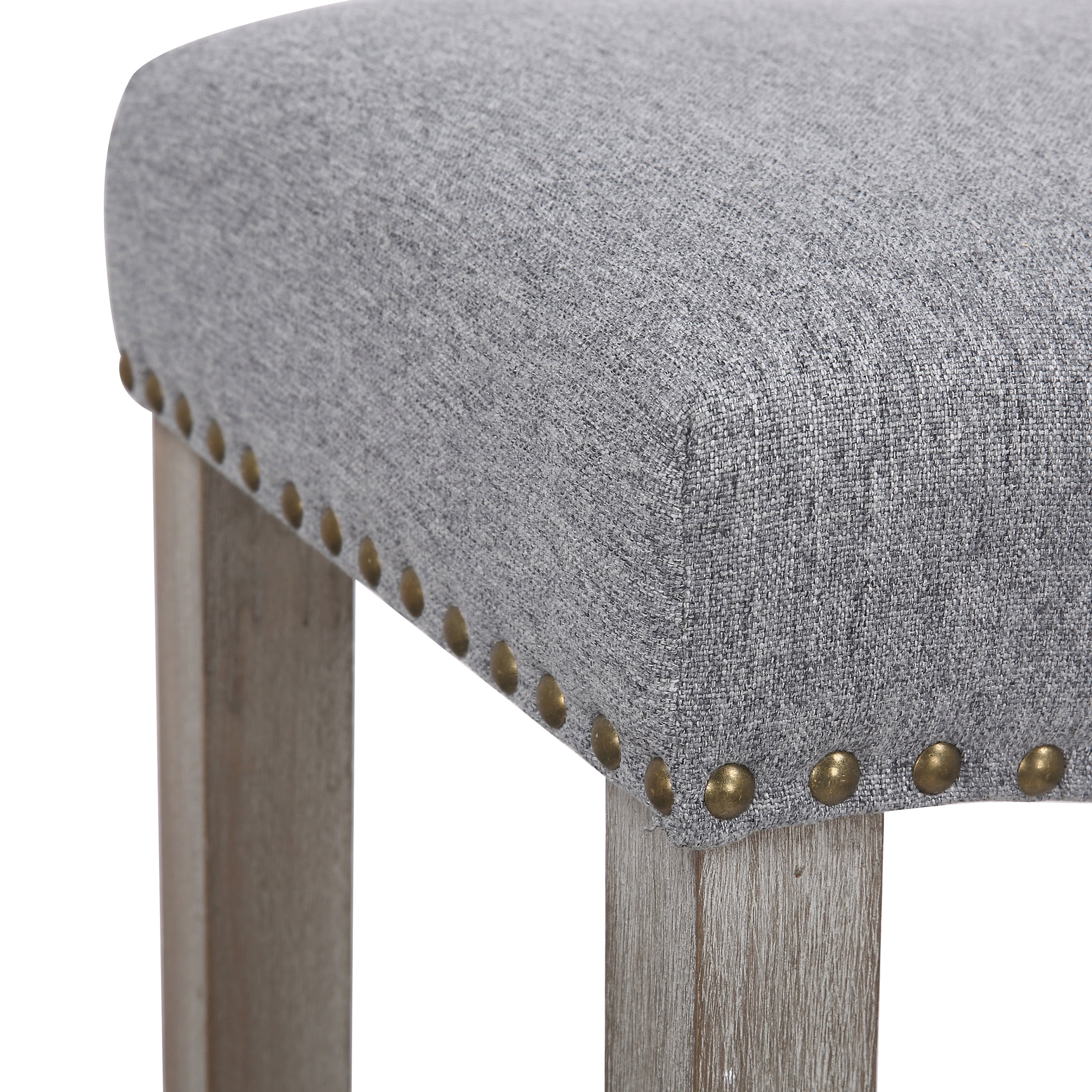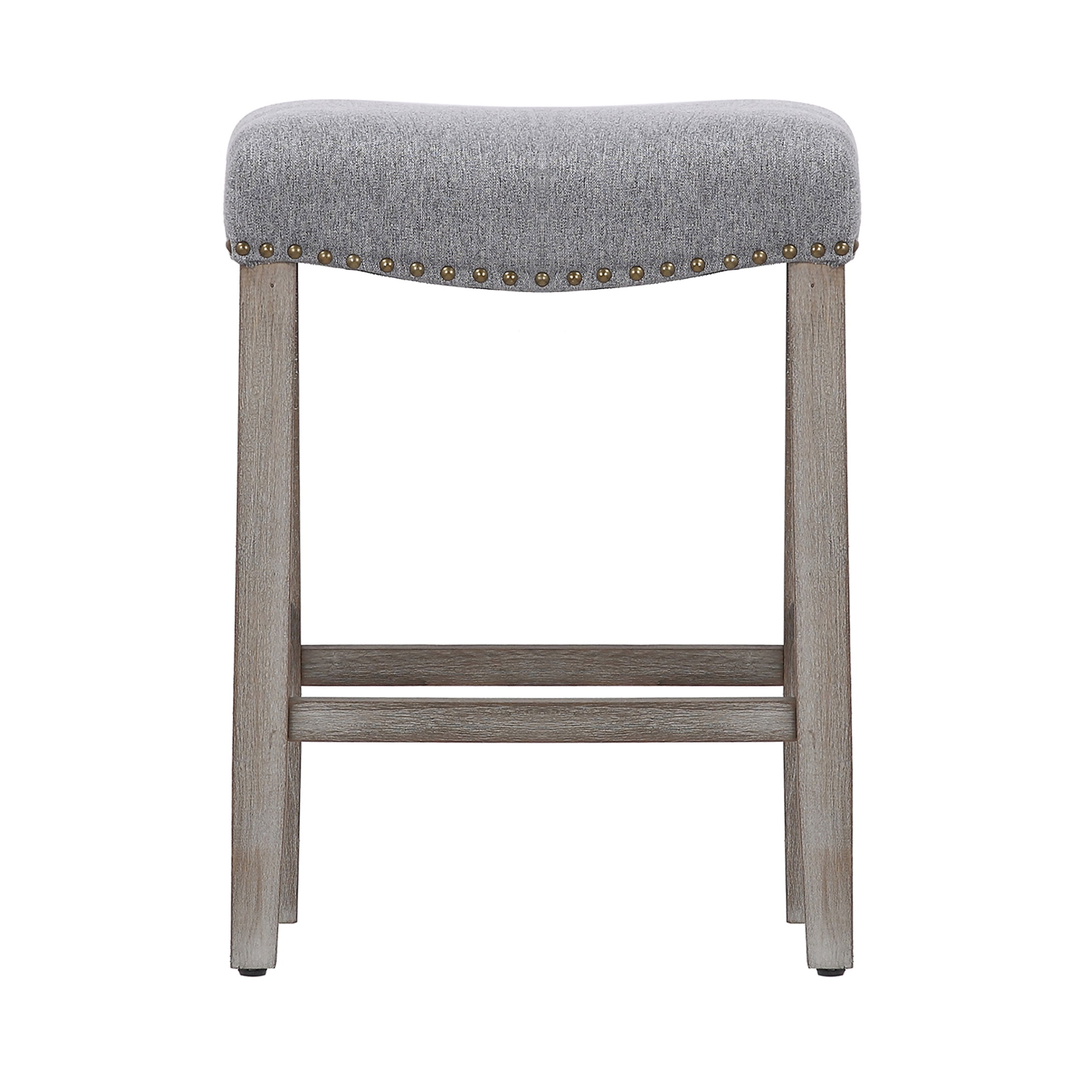 Ideal for your kitchen and home bar, this 24 Inch stool will bring you style and comfort with its well-cushioned saddle upholstered seat. Crafted from high quality solid rubberwod, this bar stool boasts an undestated craftsmanship that makes it perfect for your kitchen, dining room, or bar area. Designed with comfort in mind, indulge yourself in the bar stool’s high denisty foam cushioning. Featuring a linen seat, polished bronzechrome nail head trim, and antique gray stained wood legs with perfectly placed footrest.