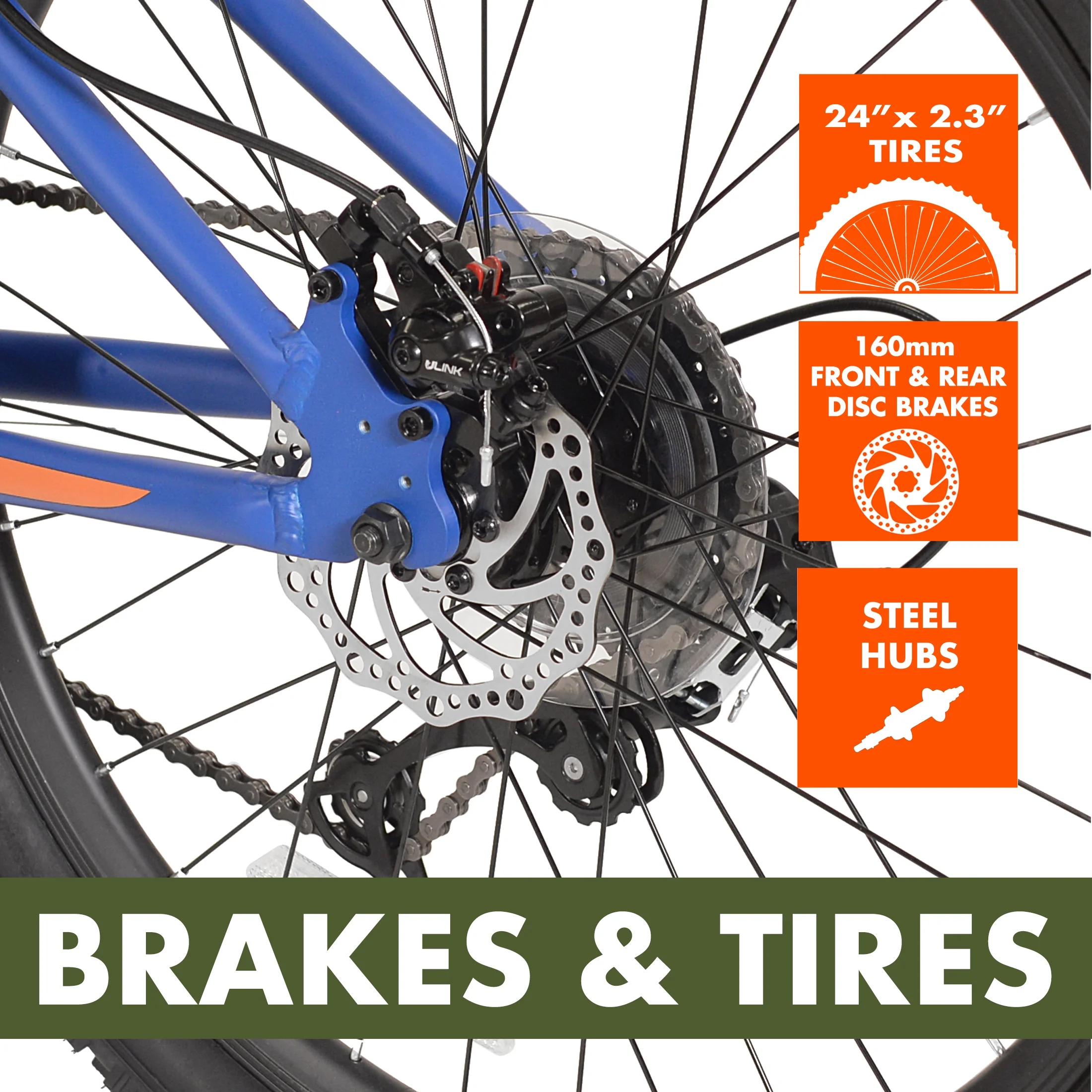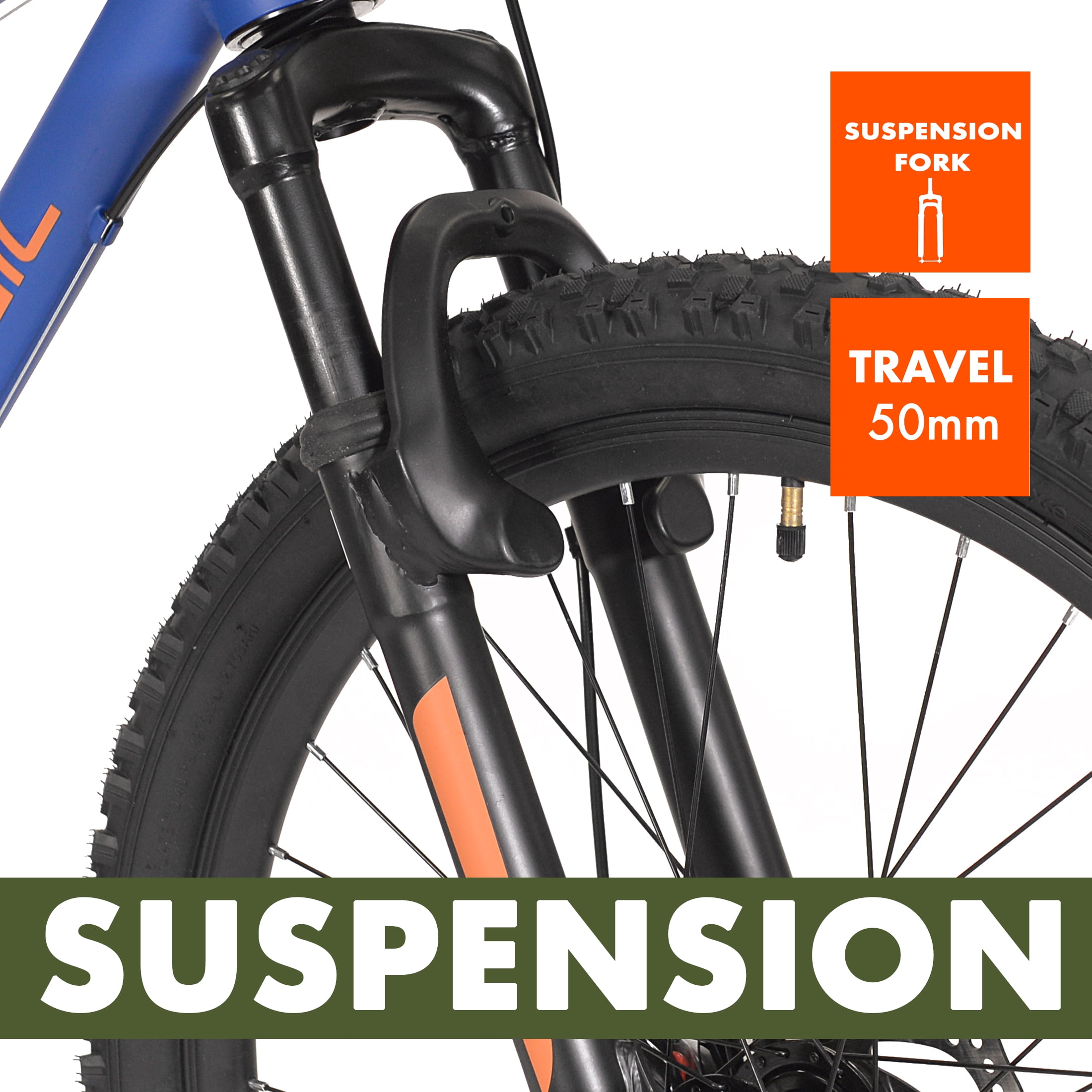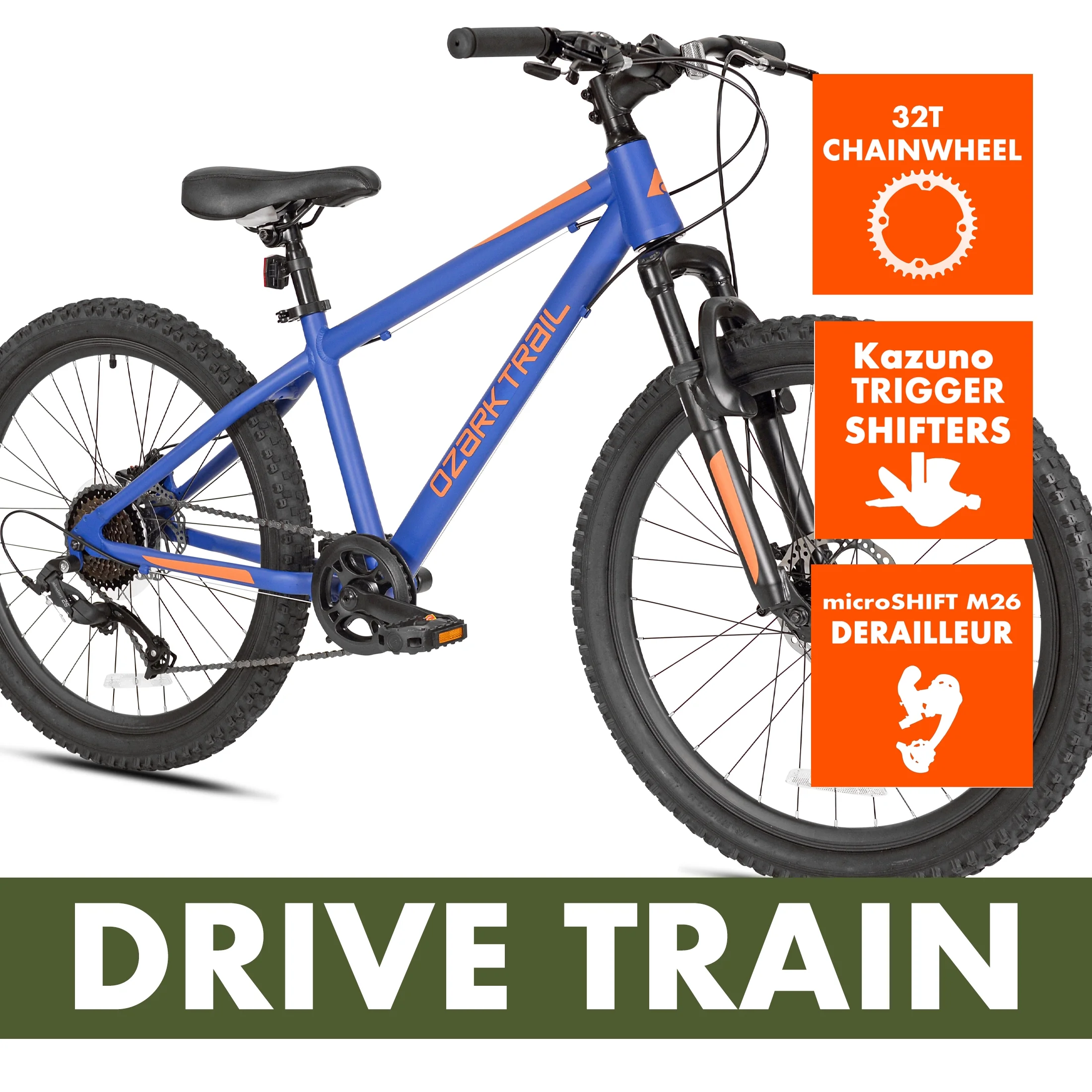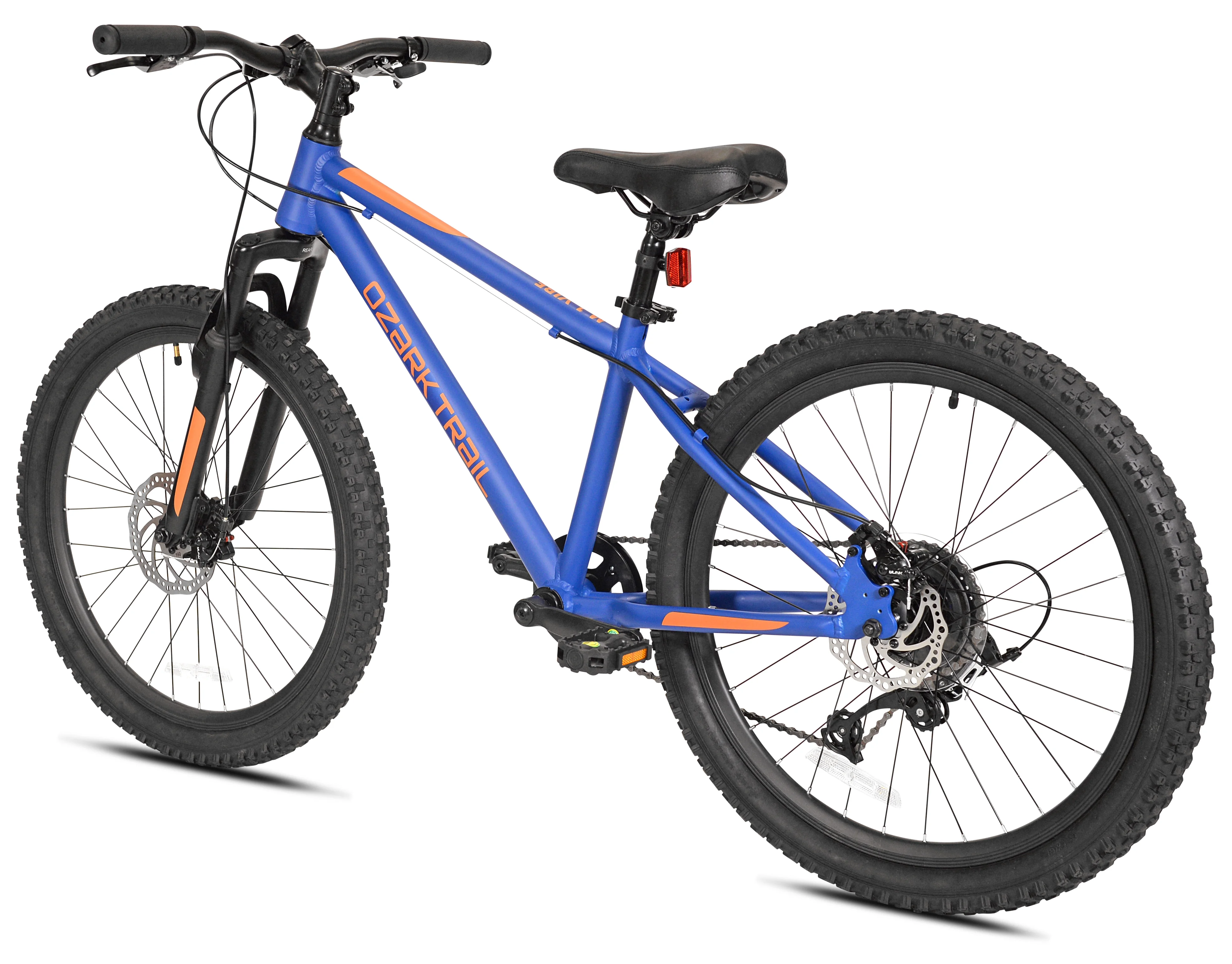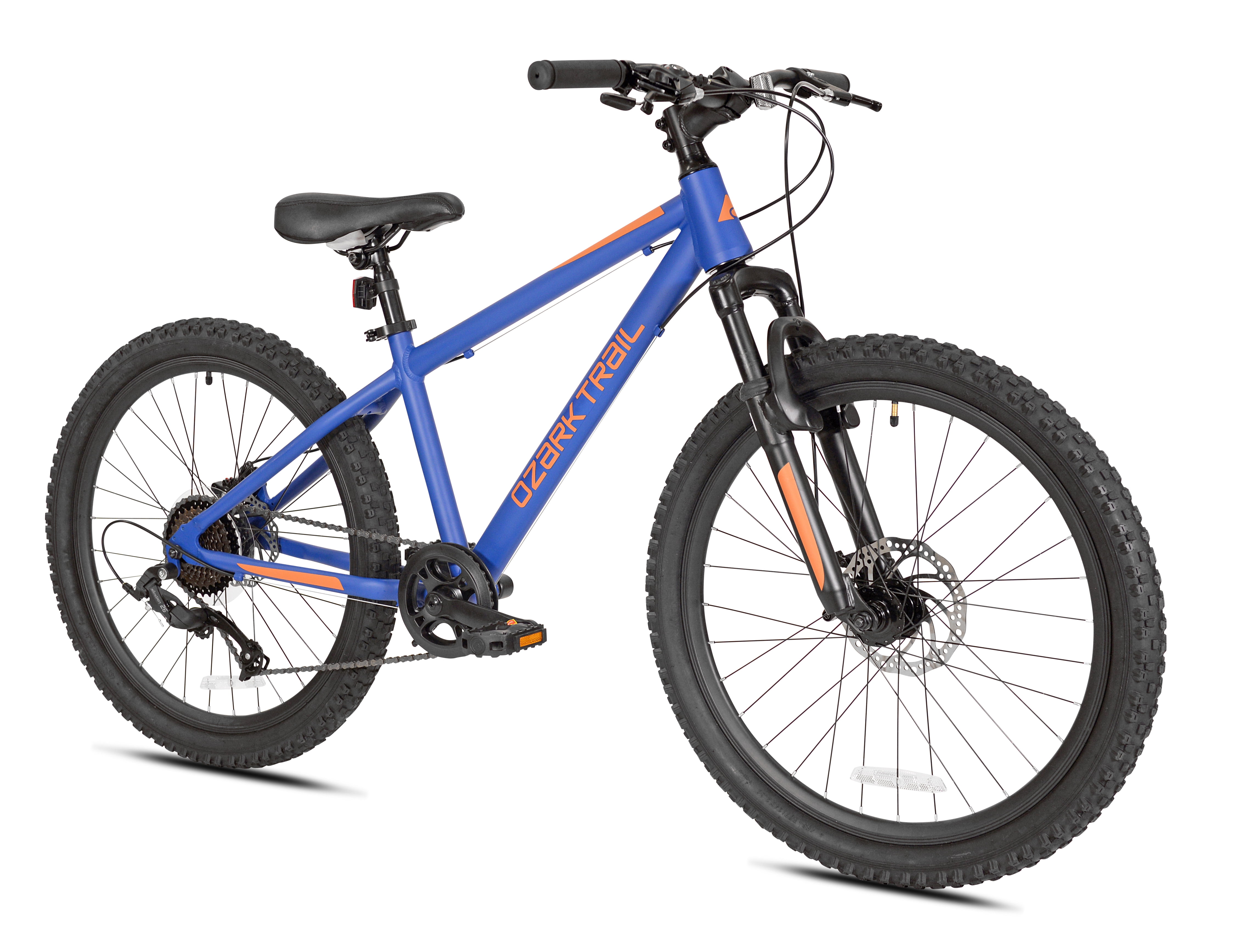 Ozark Trail 24″ Vibe Mountain Bike, 8 Speed, Blue, Teen, Unisex Lightweight aluminum hardtail frame with a tapered headtube Front Suspension 24″ x 2.3″ Tires / Schrader valve tube Handlebar-mounted quick trigger shifters Front suspension fork Front and rear mechanical disc brakes 1 x 8 MTB drivetrain with a wide gear range Microshift rear derailleur Dual Disc Brakes Assembled weight: 34 lbs Padded MTB saddle with adjustable height