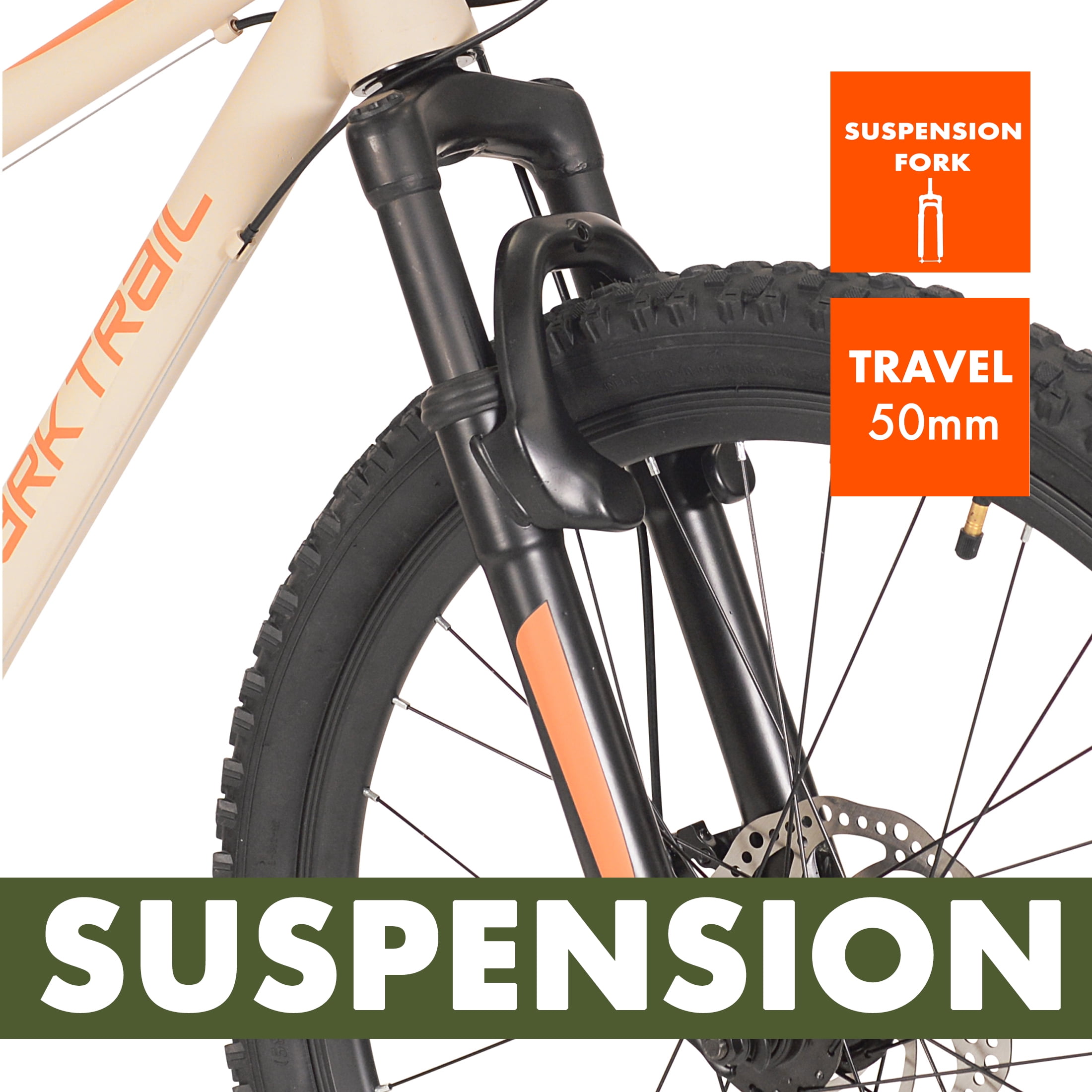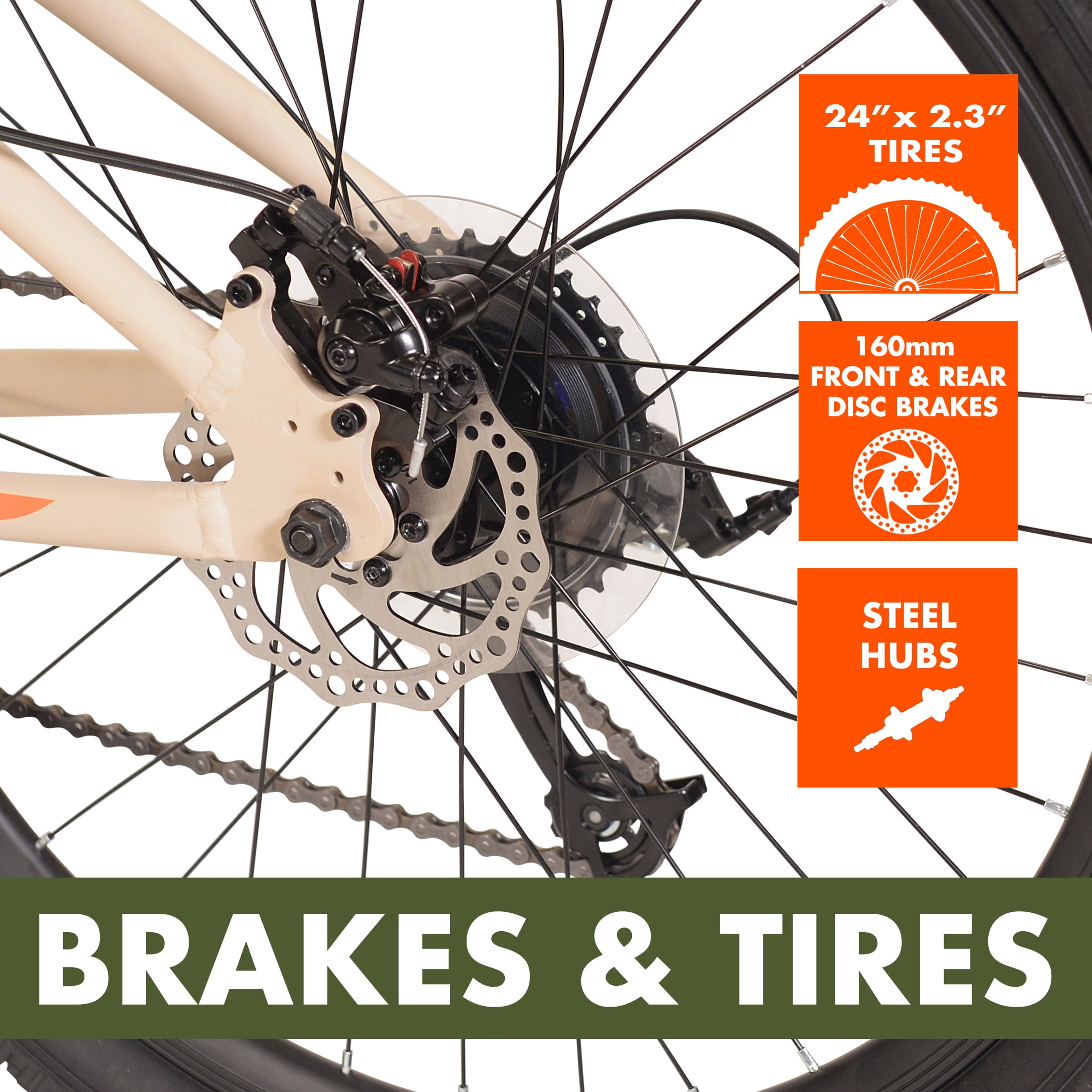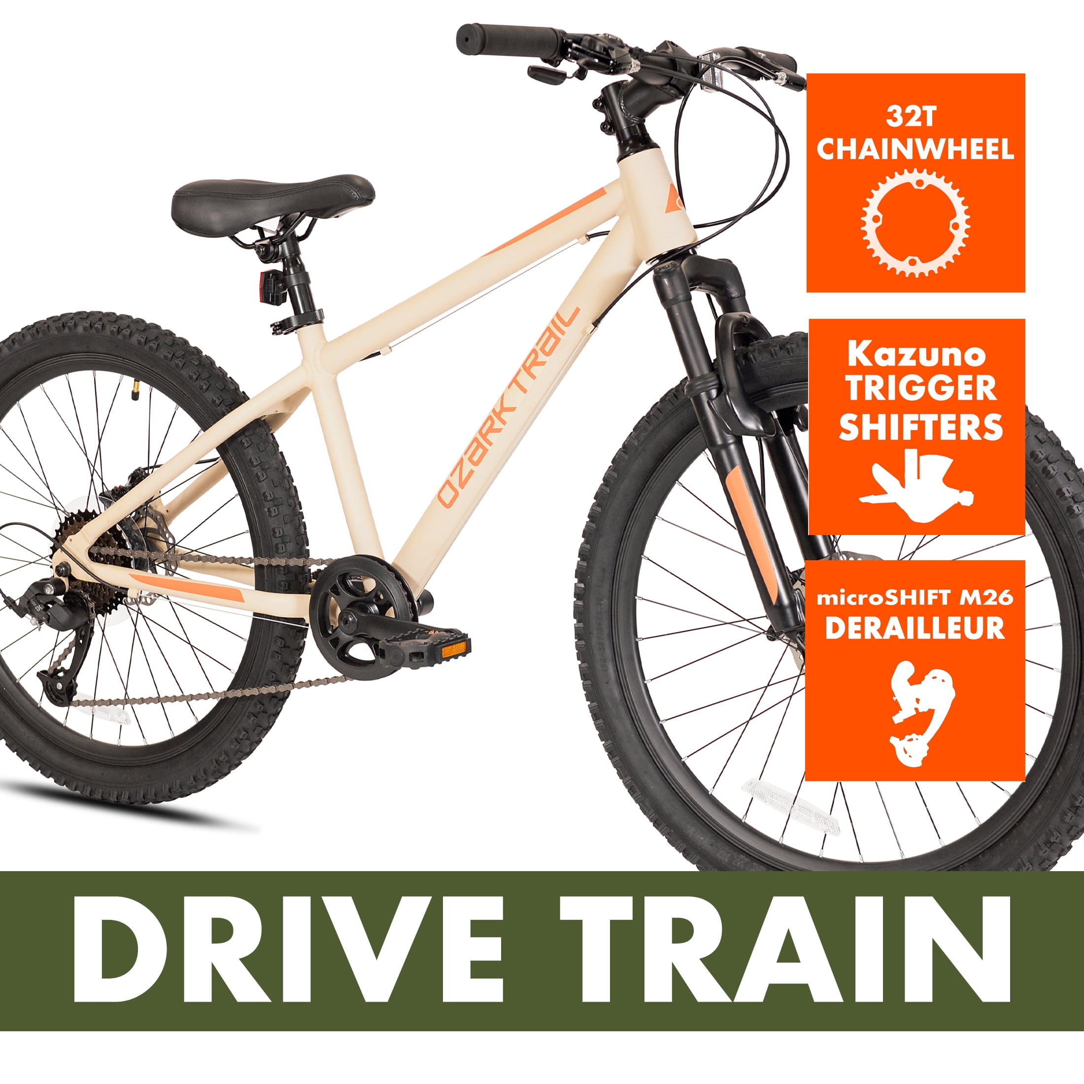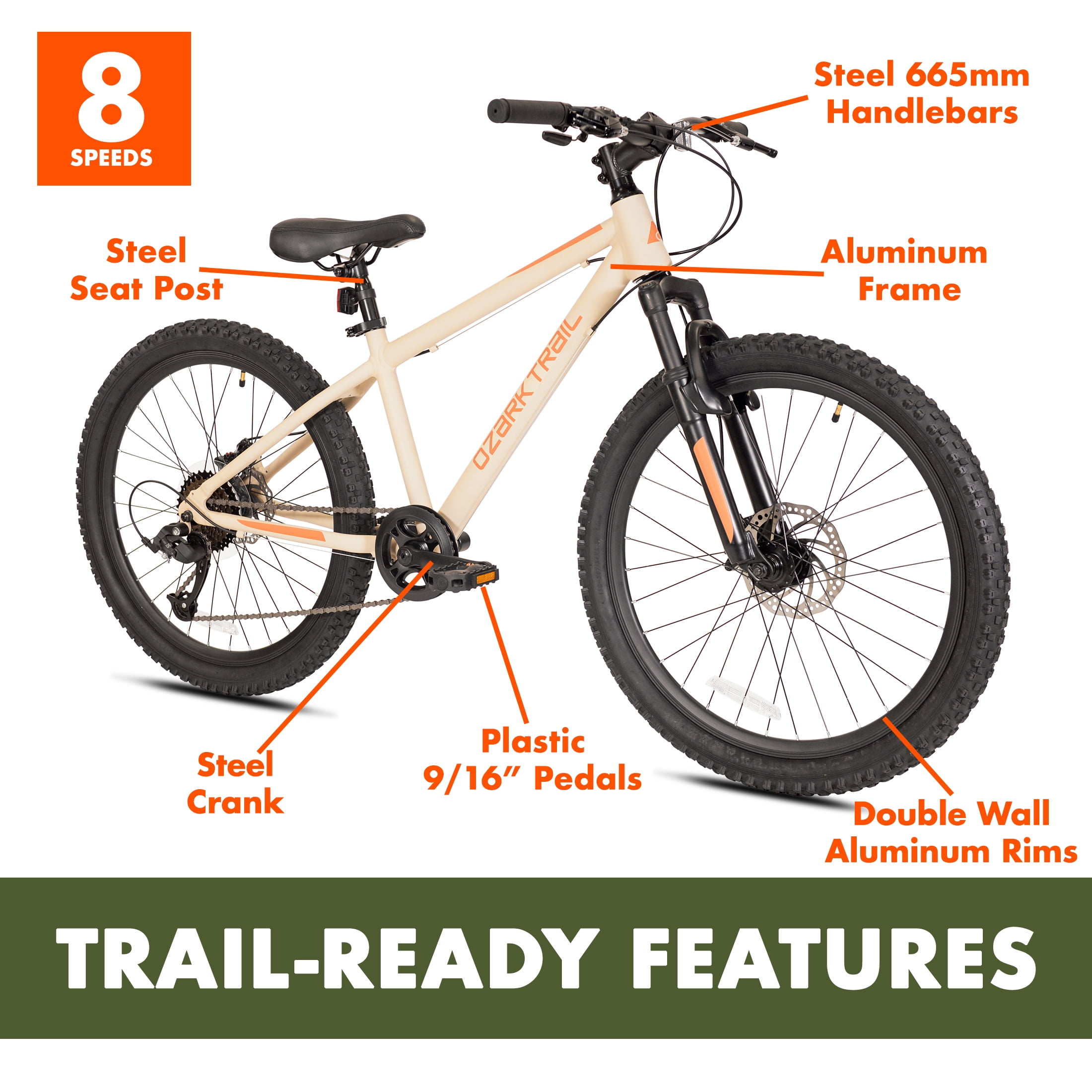 Ozark Trail 24″ Vibe Mountain Bike, 8 Speed, Vanilla, Teen, Unisex Lightweight aluminum hardtail frame with a tapered headtube Front Suspension 24″ x 2.3″ Tires / Schrader valve tube Handlebar-mounted quick trigger shifters Front suspension fork Front and rear mechanical disc brakes 1 x 8 MTB drivetrain with a wide gear range Dual Disc Brakes Assembled weight: 34 lbs Padded MTB saddle with adjustable height