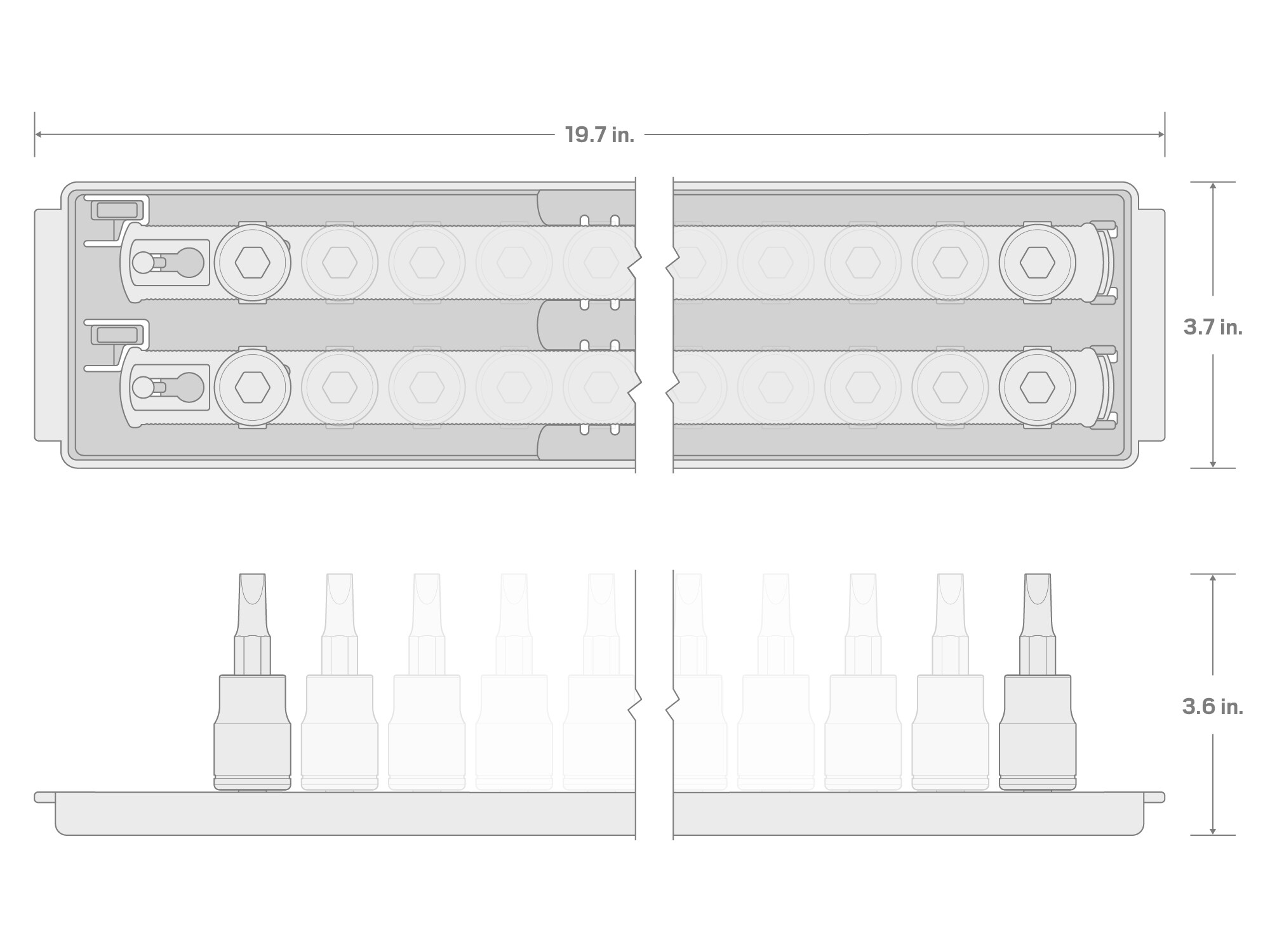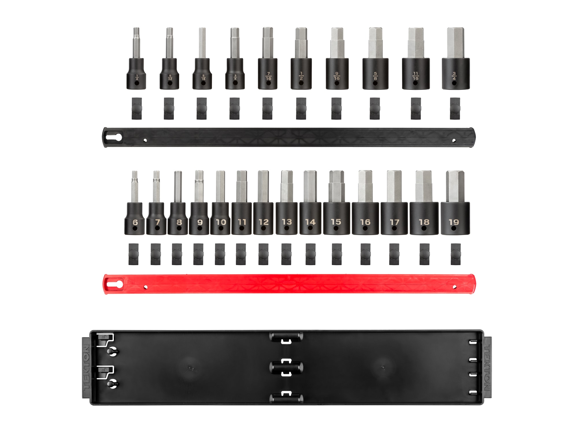 Tekton Impact Bit Sockets have a two-piece design that allows us to optimize the steel alloys, heat treatments, and forming processes for the bit and socket separately, resulting in a tool that’s higher performing and more durable than traditional one-piece impact bit sockets. The two pieces are permanently press-fit together and won’t loosen over time. The socket is made from 6140 chromium-vanadium steel that’s heat-treated to 40–47 HRC for use on impact wrenches. The socket is also coated with a manganese phosphate finish to resist corrosion. The bits are made from S2 steel that’s heat-treated to 57–63 HRC to help maintain their geometry under stress. The inside of the socket’s drive end has smooth walls with no detent grooves to support engagement with drive tools that use friction ring anvils. A detent pin hole on one side of the drive end also supports engagement with detent pin anvil styles. The portable organization rails have twist-to-lock clips that hold sockets securely and can be repositioned anywhere along the rail.