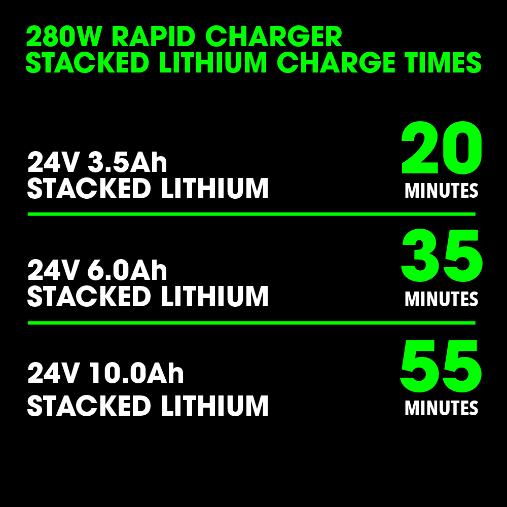 Package Contents: 6.0Ah Battery and 280W Rapid Charger