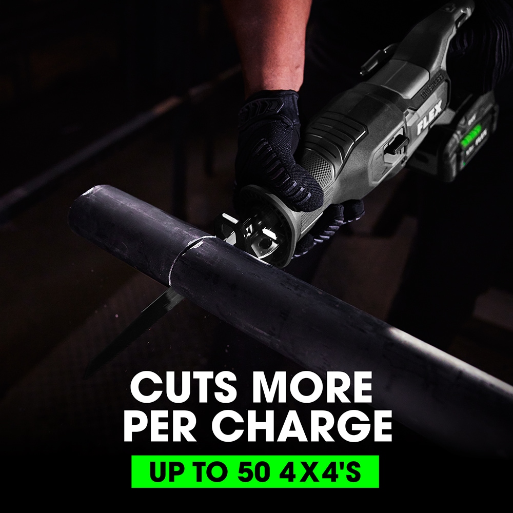 No demo is too tough for the FLEX 24V Reciprocating Saw. This saw features fast, orbital cutting action and delivers more cuts per charge. Vibration suppression reduces fatigue. Switch blades on-the-fly with quick and easy, keyless blade eject. Built-in LED lighting illuminates your site. All this comes with the FLEX Advantage of unmatched 24V battery power, runtime, and faster charging—protected by the FLEX Limited Lifetime Warranty when registered within 30 days of purchase at registermyFLEX.com through December 31, 2025.