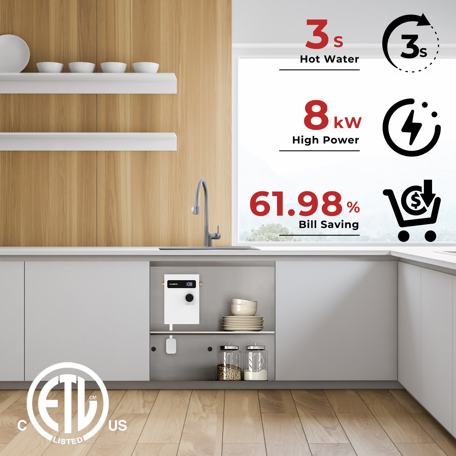 Camplux is a brand known for water heaters, especially outdoor propane tankless water heaters, indoor tankless or mini tank electric water heaters. Camplux tankless electric water heaters TEW series, designed for continuous hot water, energy-efficient, provide hot water on demand instantly. Lightweight, compact design that’s easy to handle and install. Build in smart modulation system, adjusts power automatically when flow rate and temp setting changes, keeping stable temperature of the output hot water, no waiting for preheat.
