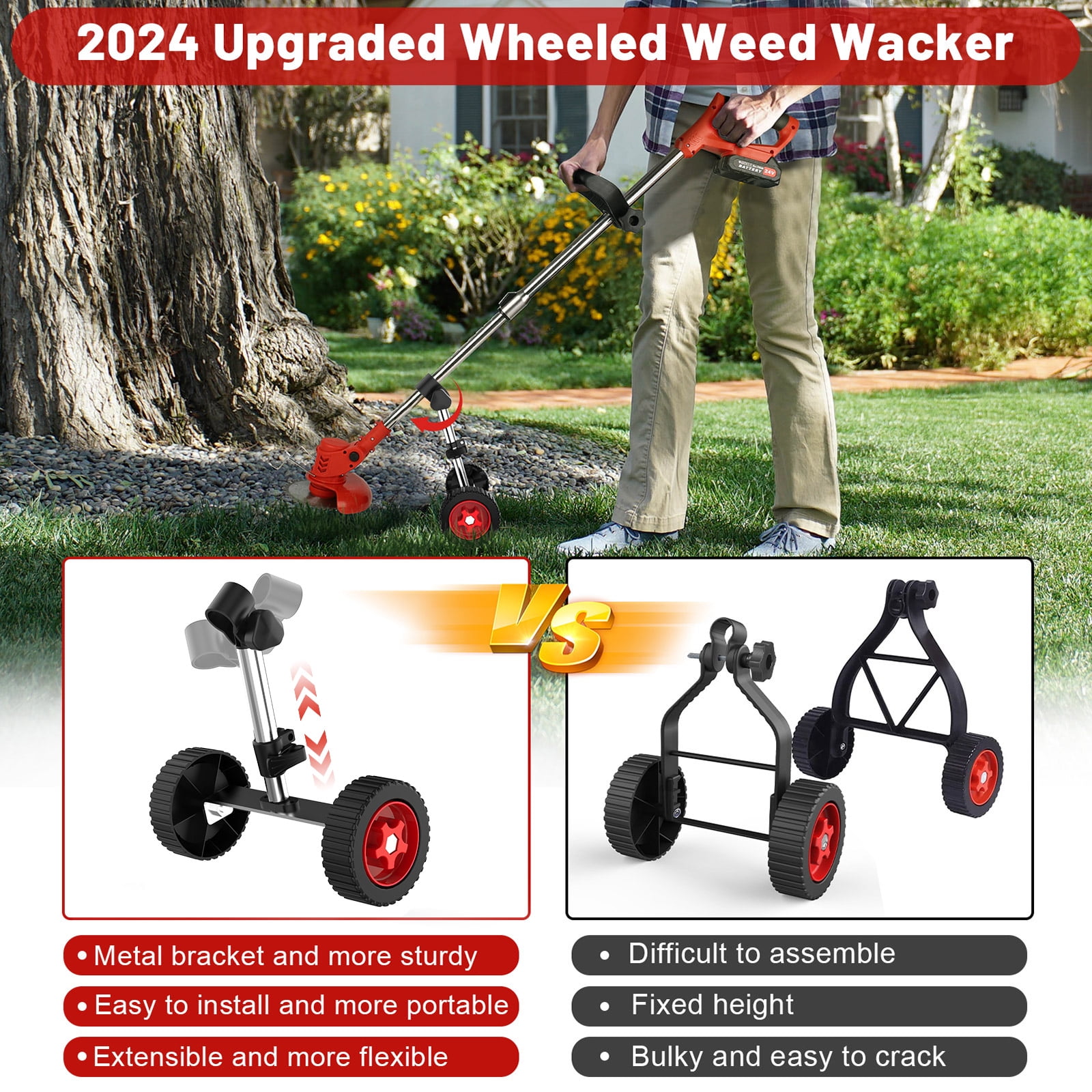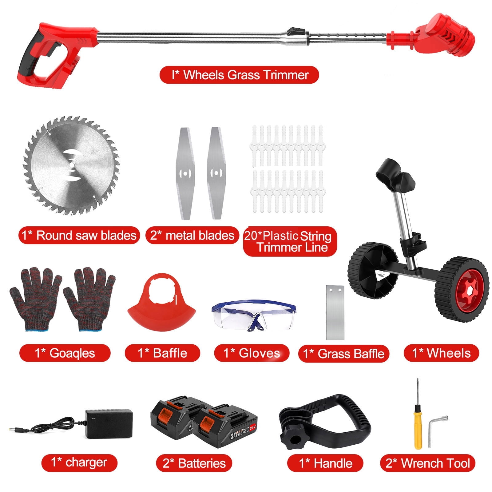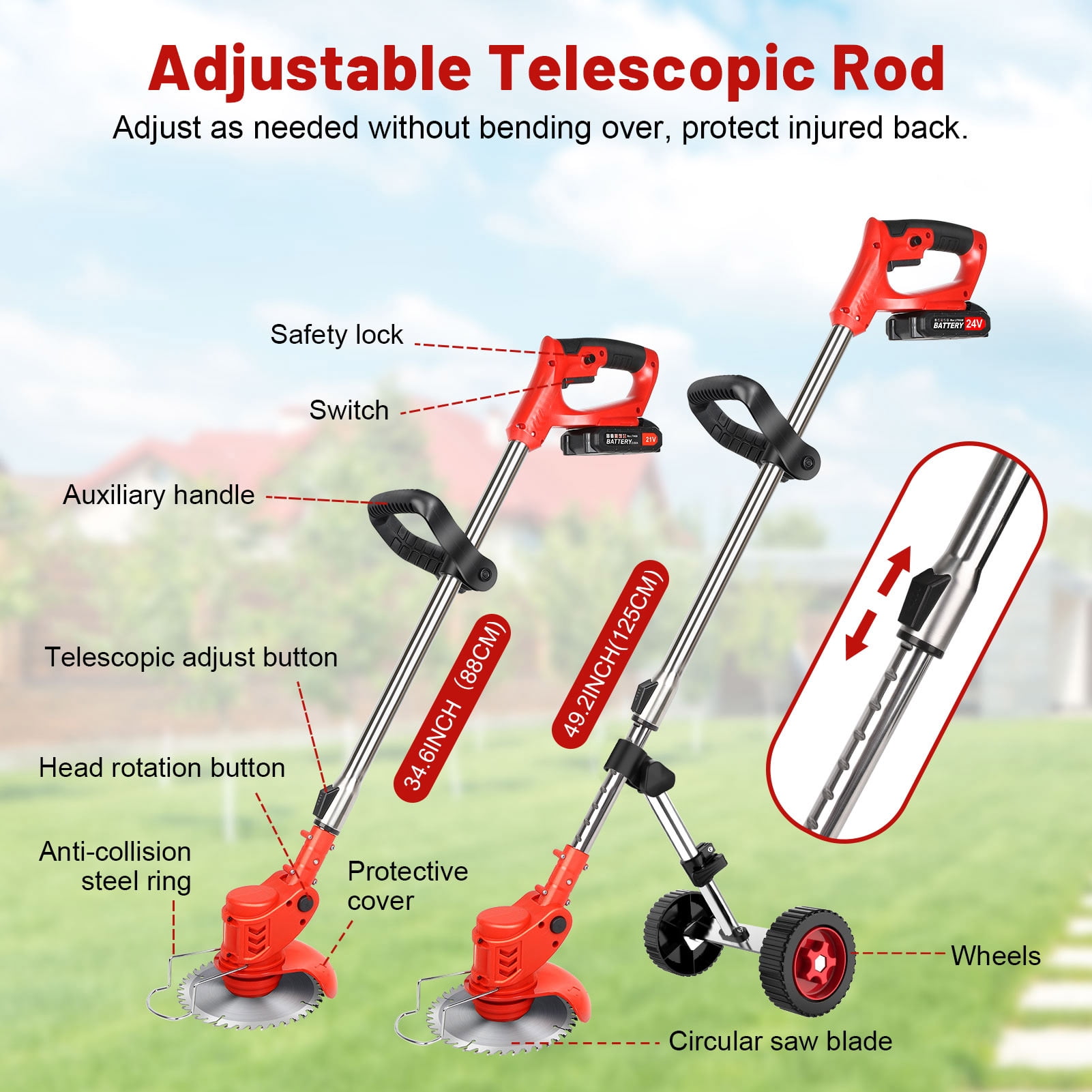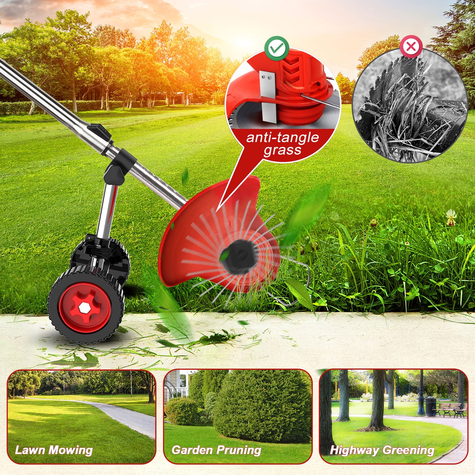 ☘️【Powful and Lightweight Cordless Weed Eater 】The electric weed eater battery powered use durable and reliable weed wacker cordless motor that provides excellent performance. ☘️【High-efficiency Battery】This electric brush cutter is equipped with TWO 2.0Ah Batteries, each one working time 40-60mins (depending on your working load) complete the weeding task in one go! ☘️【3-IN-1 edger lawn tool cordless】This battery operated weed wacker with charger is not only a grass trimmer but also a wheeled lawn edgers battery powered sidewalk edger ☘️【Mulitifunctional lawn edgers battery powered】Grass trimmer is equipped with 3 types of blades: 6 inches Saw Blades for trimming thick shrub branches/heavy bushes (a thickness of about 1-2 inches). ☘️【Version Upgrade with Side Cutting Blade】According to the customer’s experience, we upgrade a new version walk behind brush cutter with a side cutting blade. ????Product Specifications: Power: 650w Power type: lithium battery Applicable places: garden villa. Shortened length: 34.6in(88cm) Maximum extension length: 49in(125cm) Speed: 8500r/min Battery:21V 2000mAh Using time: 20-30mins ????UPGRADED WHEELS: 1.Adjust direction of small buckle to adjust the wheel angle 2.The triangular structure of the stand is more stable, ensuring that it can work in the most complex environments. 3.Wider tires allow you to push the weed eater more smoothly. 4.90°adjustable machine head for easy cutting at hard to reach areas. ⚡Package include: Bare machine + accessory set 21V Battery*2 Charger *1 Wire blade *2 One word knife *2 Saw blade *1 (6 inches) Goggle *1 Plastic handle *1 Anti-bump steel ring *1 Grass guard *1 Sleeve *1 Screwdriver *1