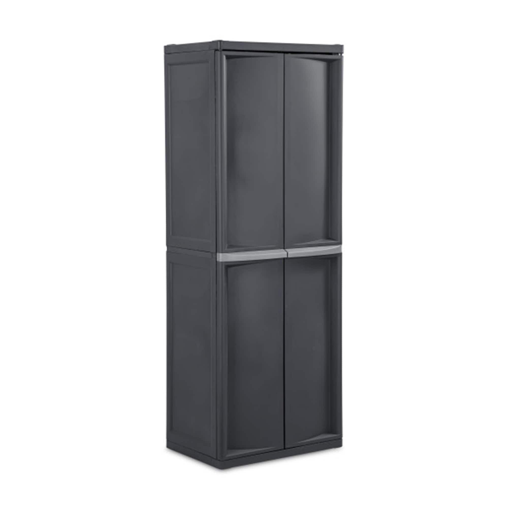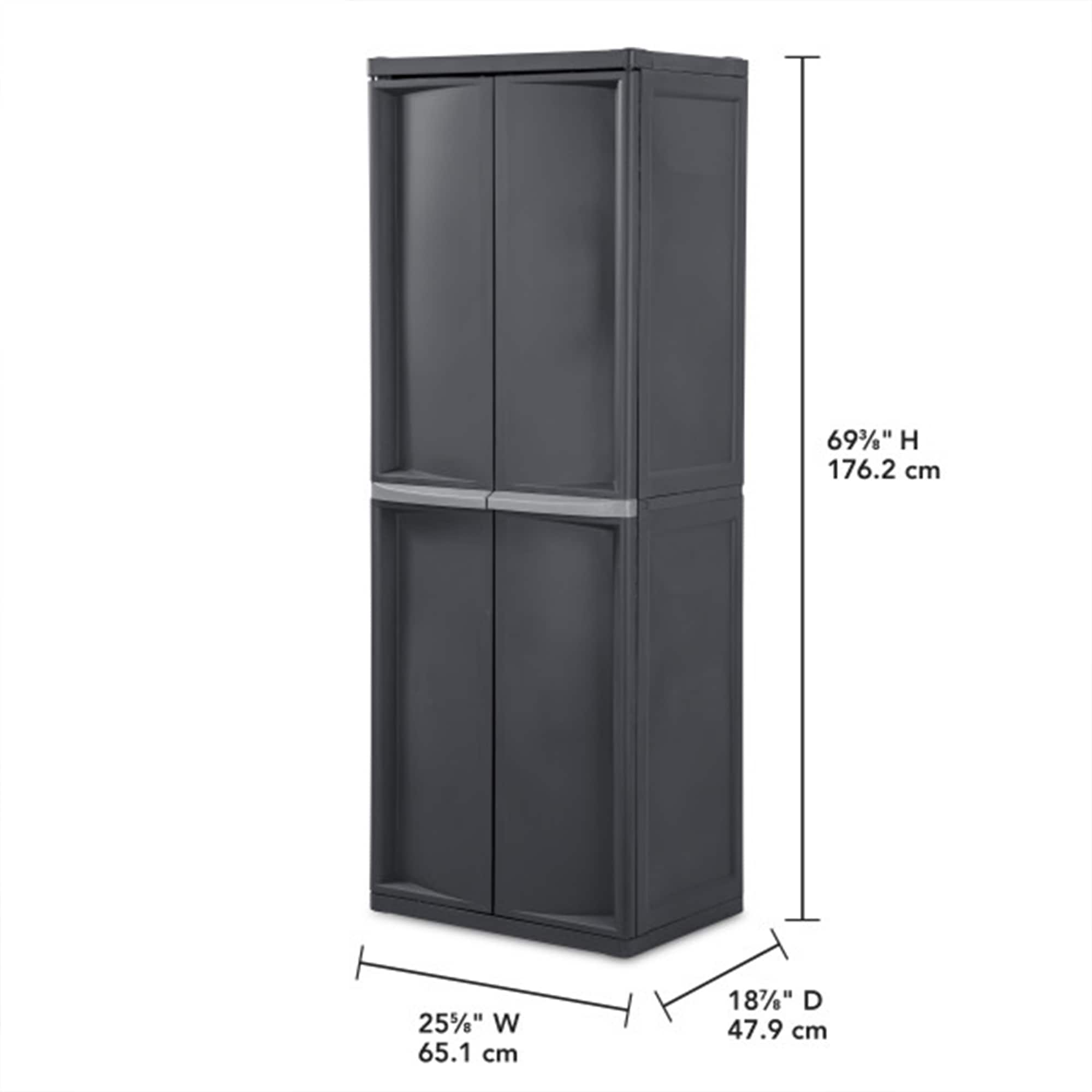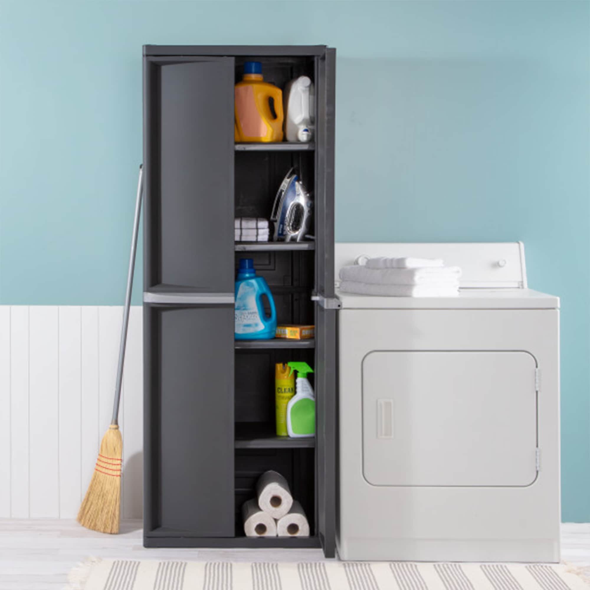 Keep your items organized and tucked away safely with the Sterilite 4-Shelf Cabinet. This plastic storage cabinet has 4 adjustable shelves and is large enough to accommodate a plethora of items while keeping them easily within reach. The doors swing in and out easily for easy access and close securely to prevent items from falling out. Made out of heavy-duty materials, this cabinet was built to outlast even the worst wear and tear thrown at it. Additionally, this cabinet can double as a locker by accommodating standard-sized padlocks. If you need more storage space in your garage, mud room, utility room, or basement, this Sterilite 4-Shelf Storage Cabinet is the solution for you.